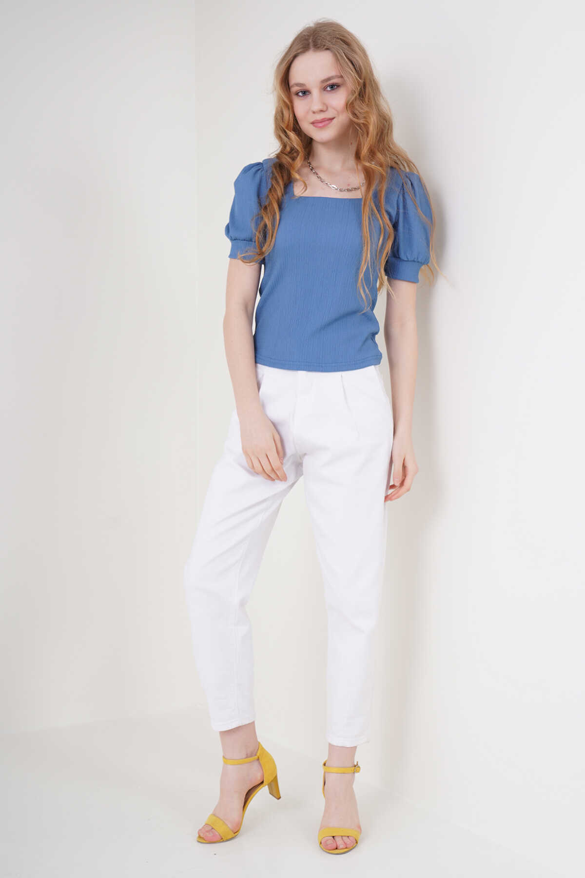 0409 Kare Yaka Örme Bluz - İndigo - Kombin