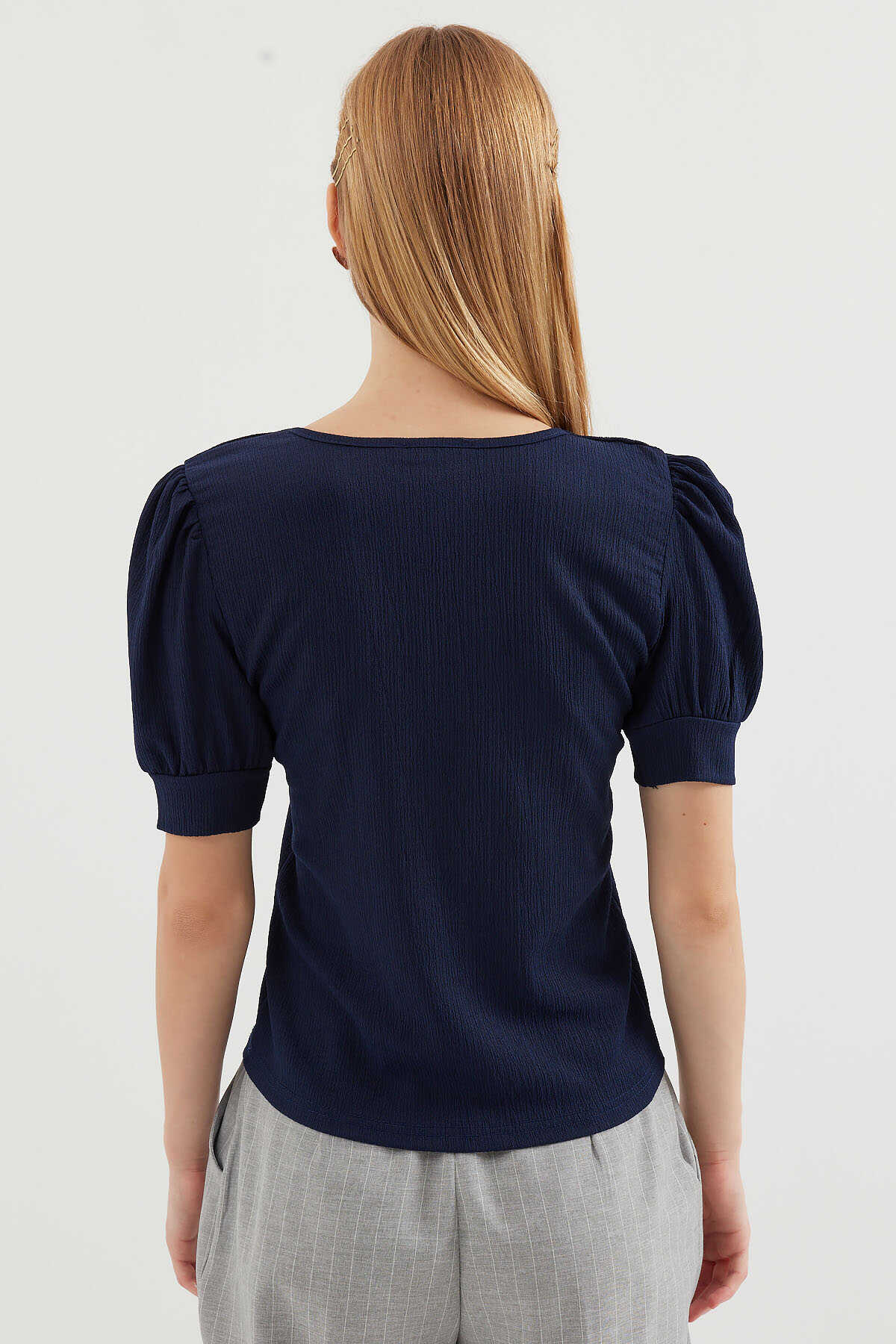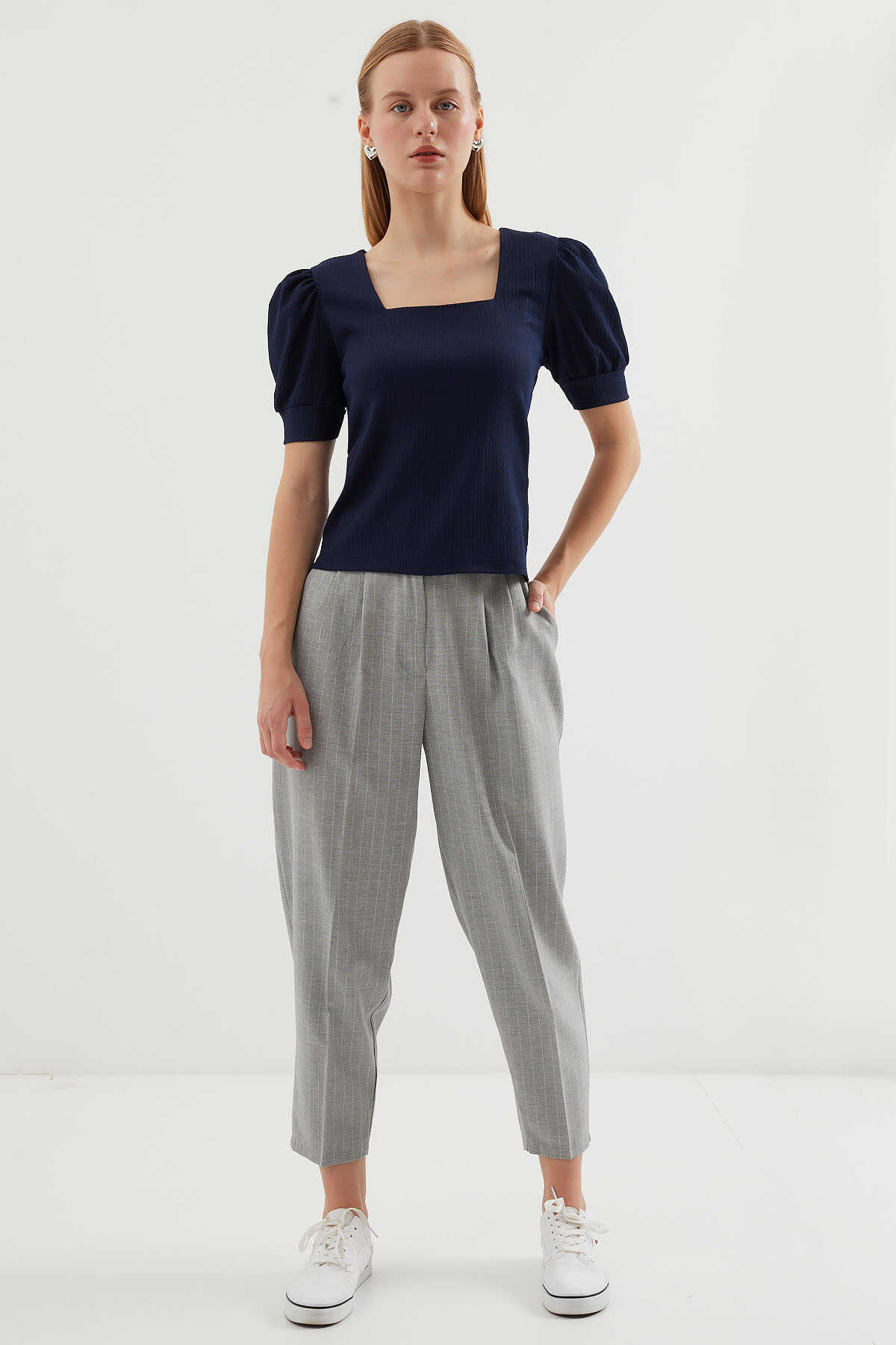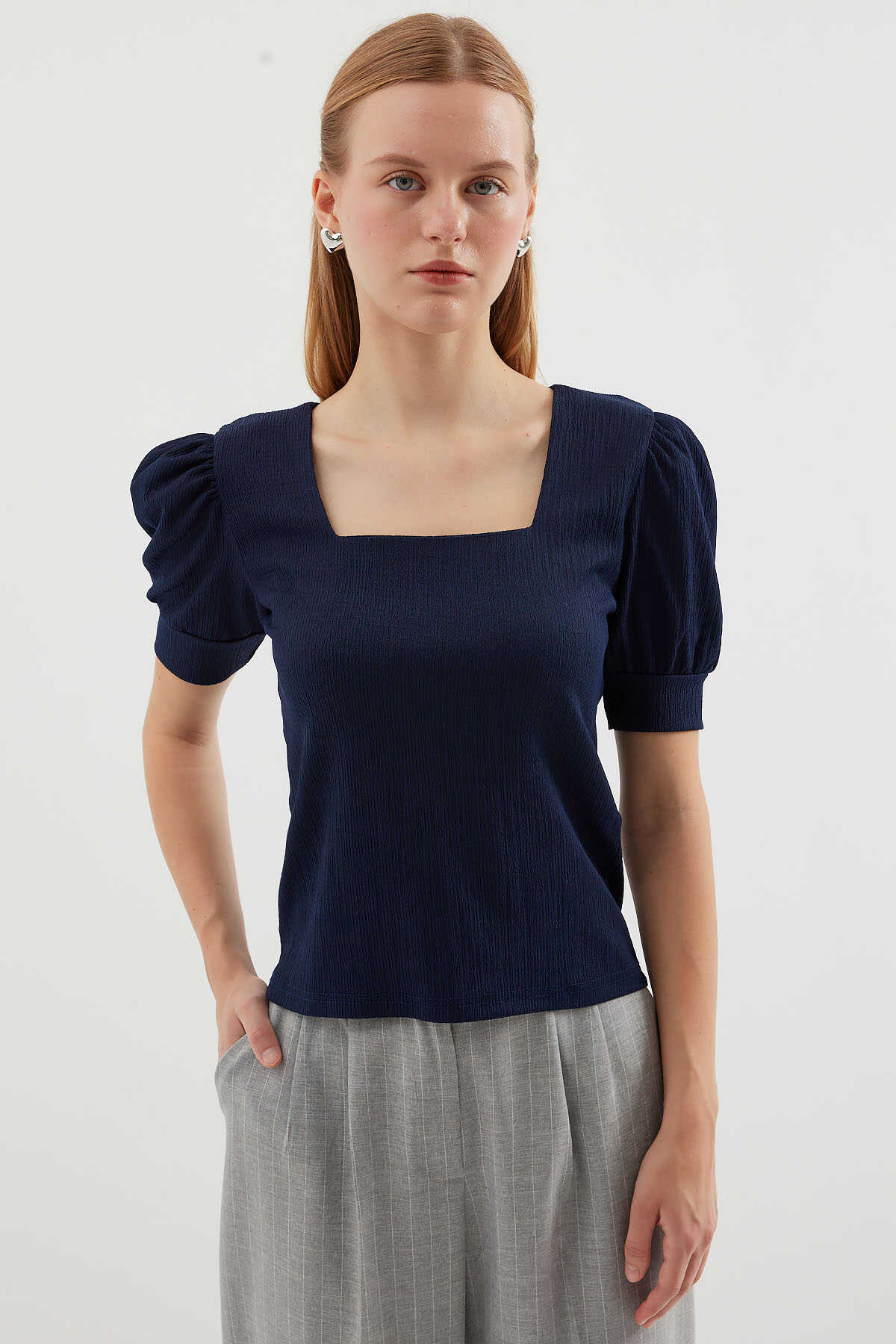 0409 Kare Yaka Örme Bluz - Lacivert - Kombin
