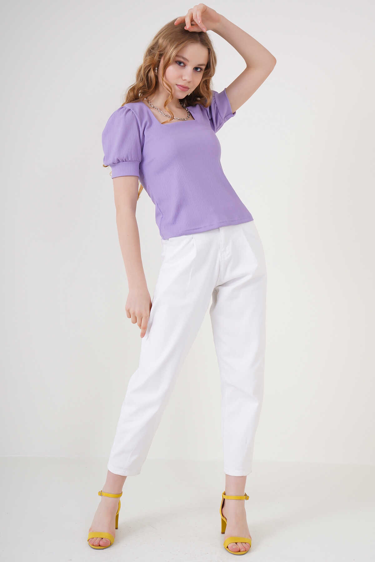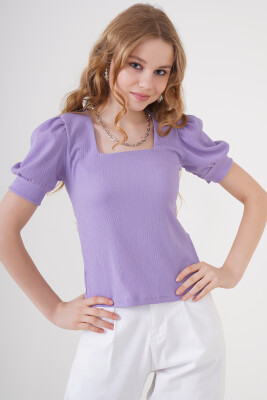0409 Kare Yaka Örme Bluz - Lila - Kombin