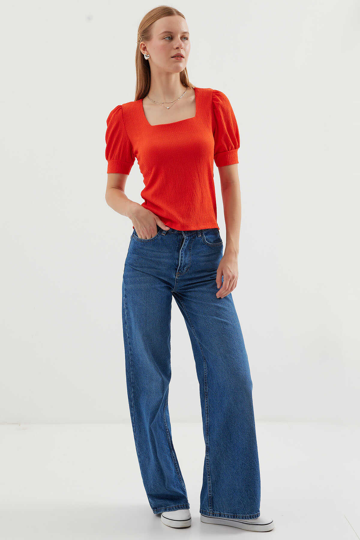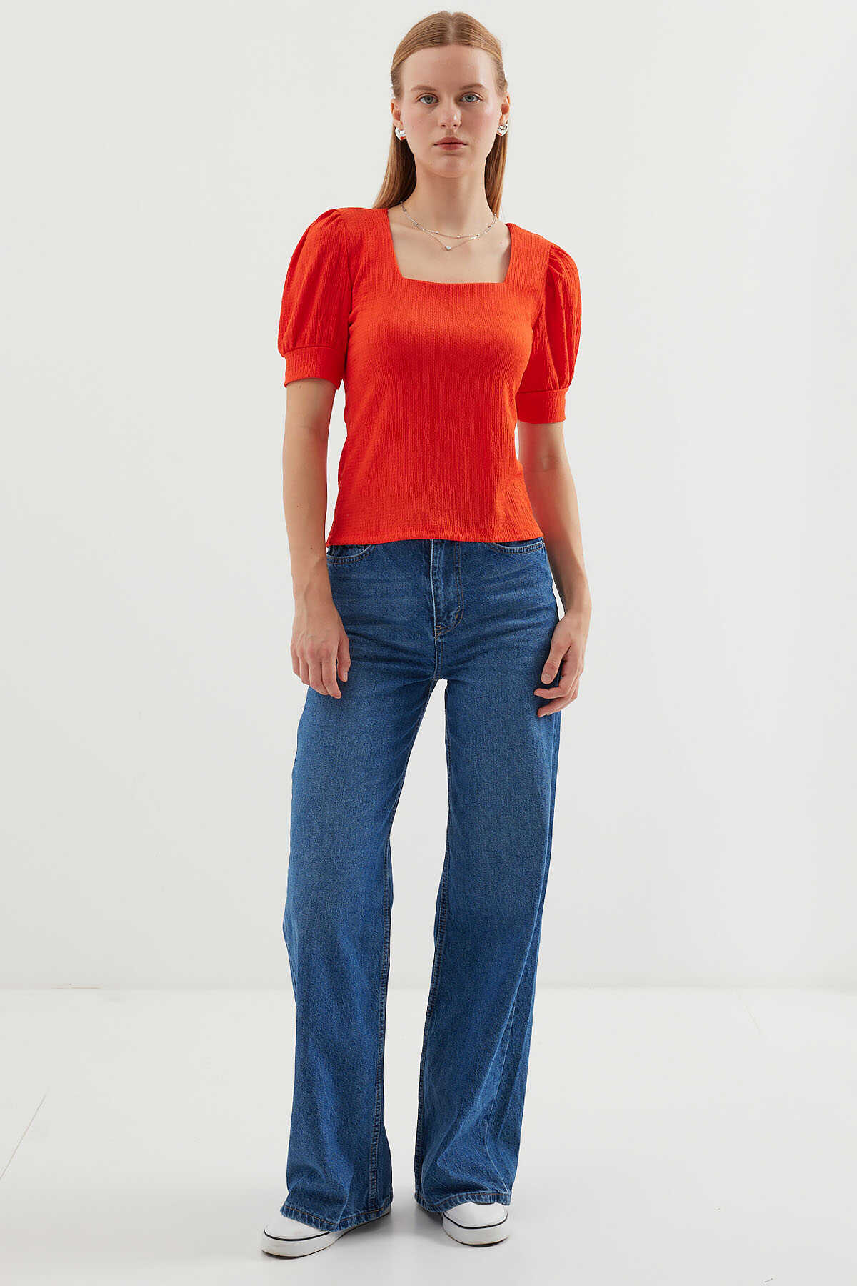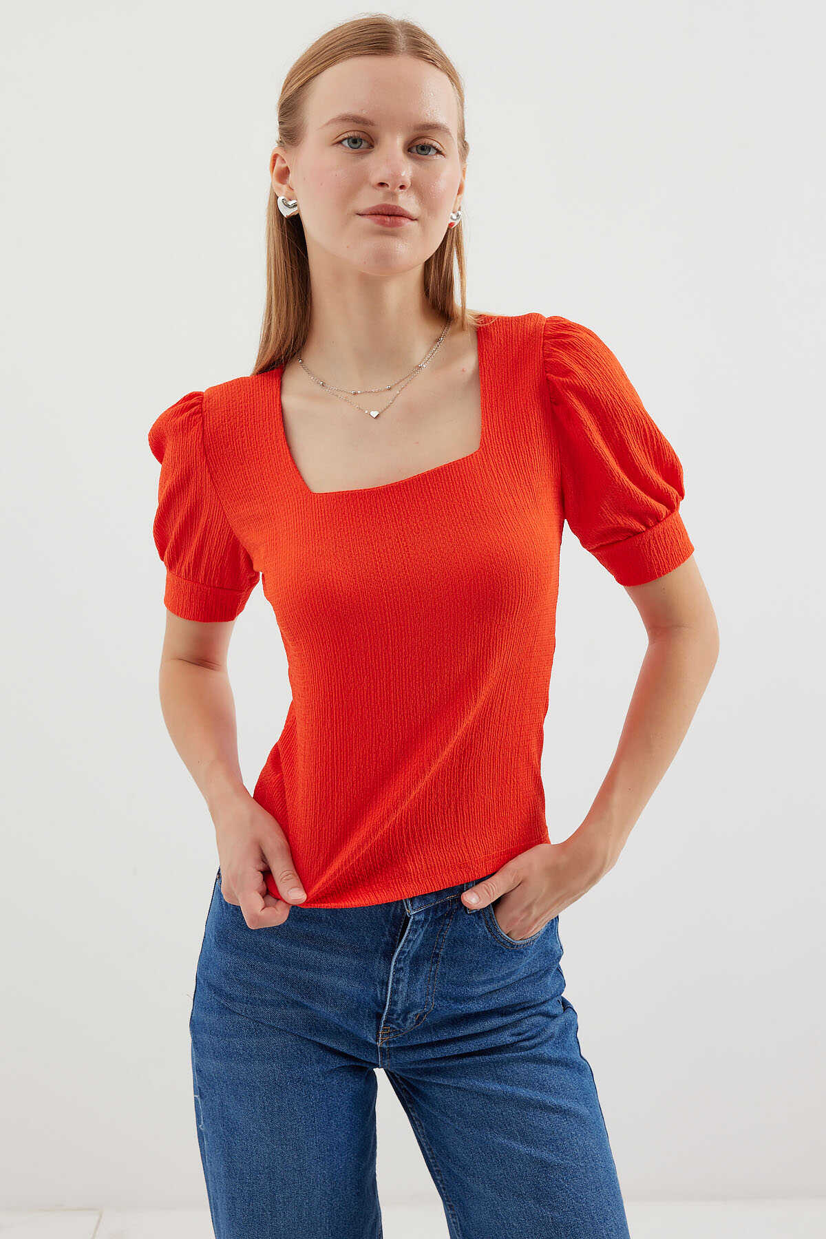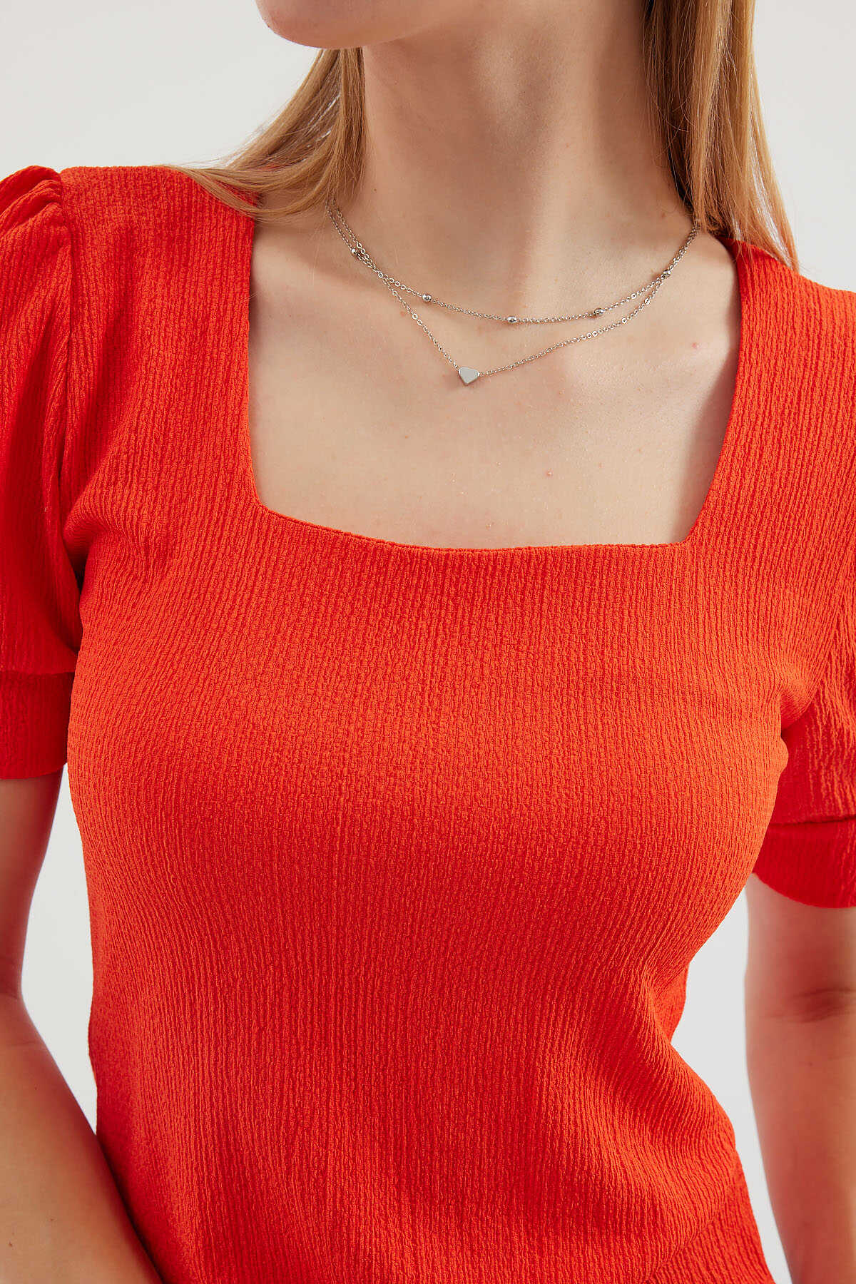 0409 Kare Yaka Örme Bluz - Oranje - Kombin