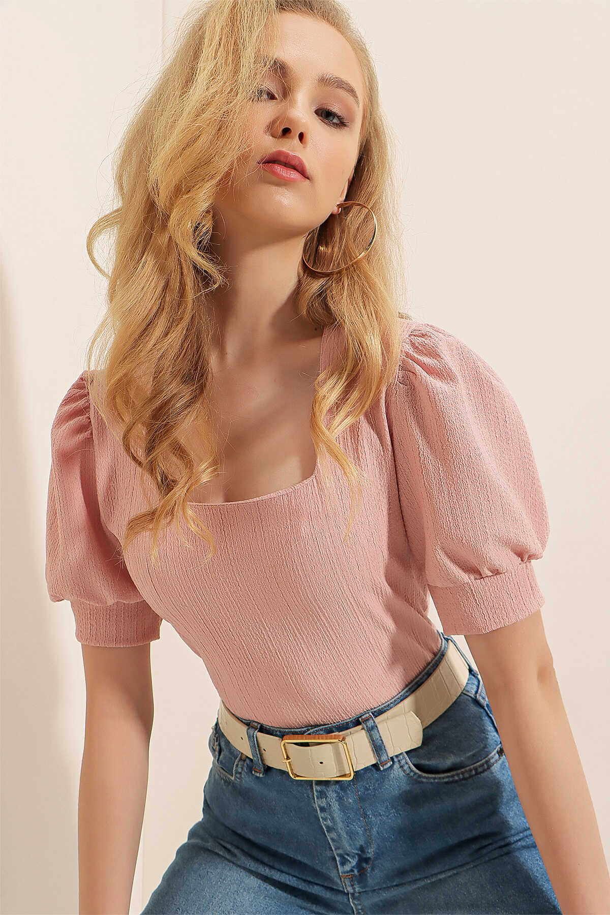 0409 Kare Yaka Örme Bluz - Pudra - Kombin