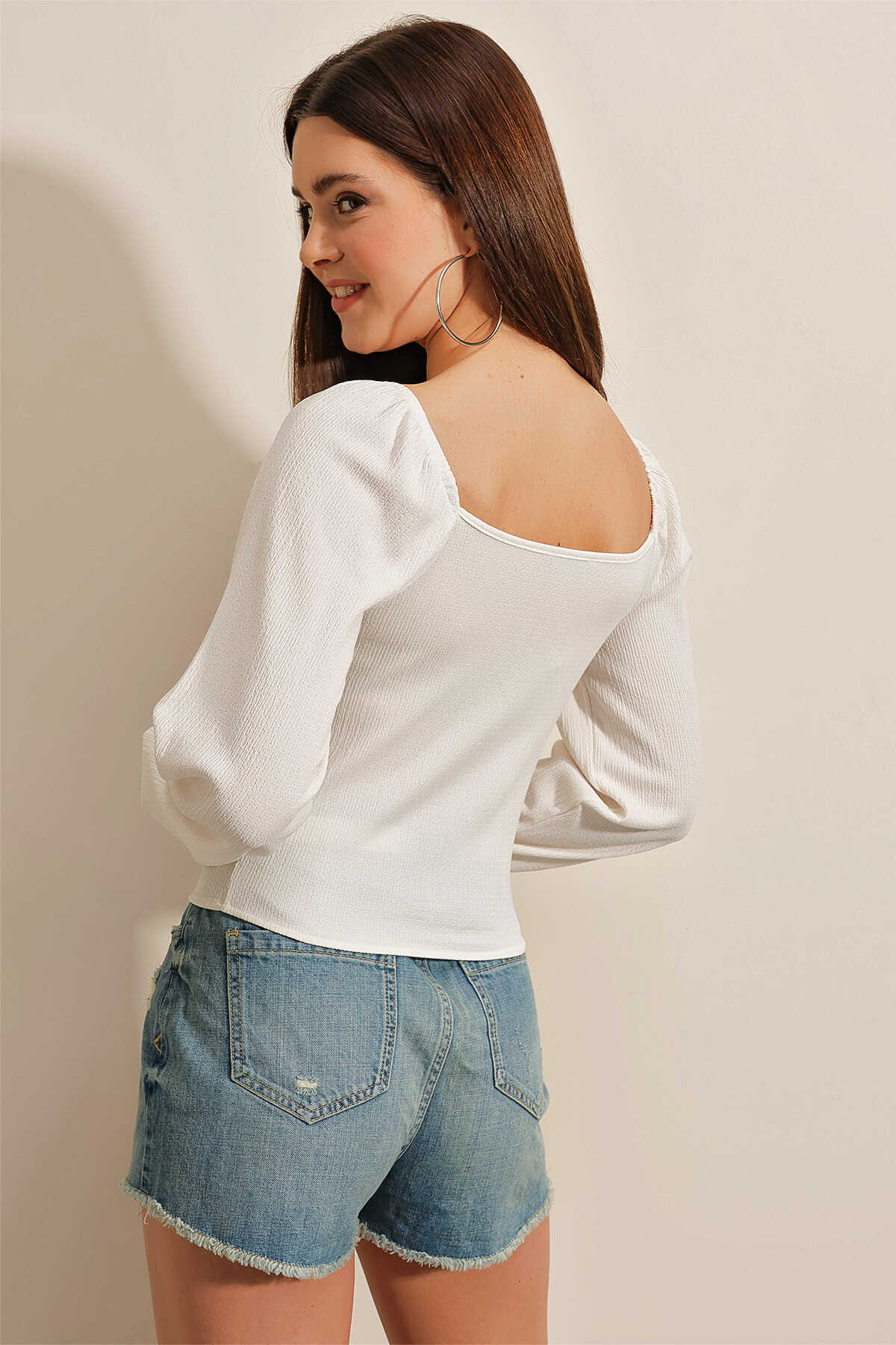 0465 Balon Kollu Örme Bluz - Beyaz - Kombin