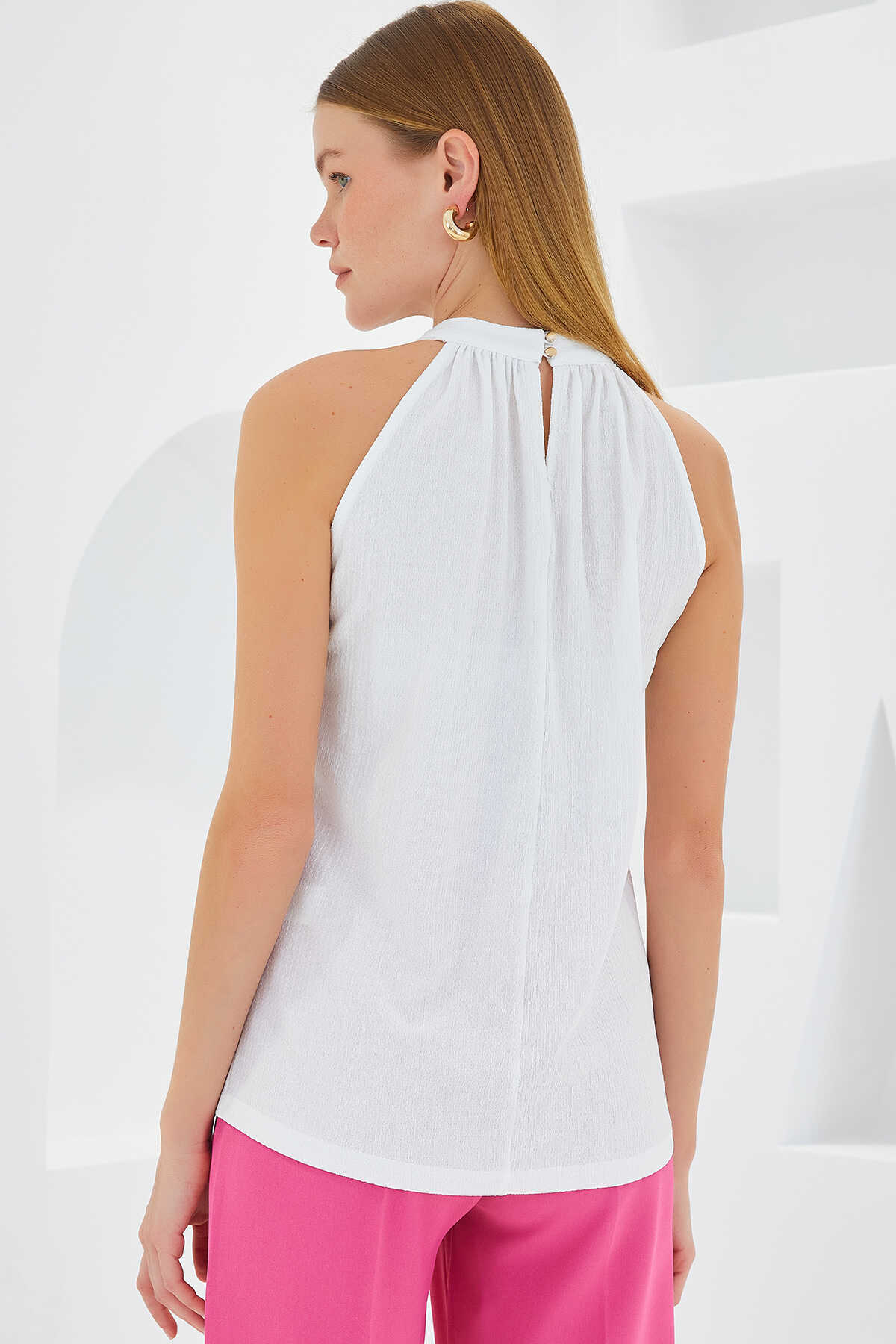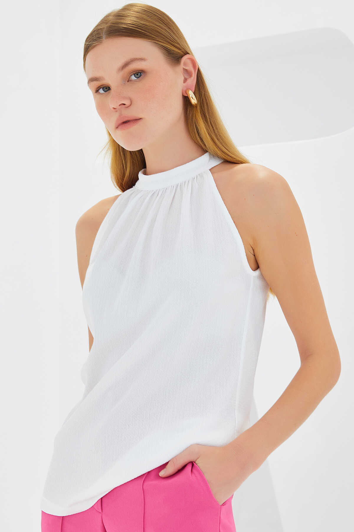 0489 Halter Yaka Örme Bluz - Beyaz - Kombin