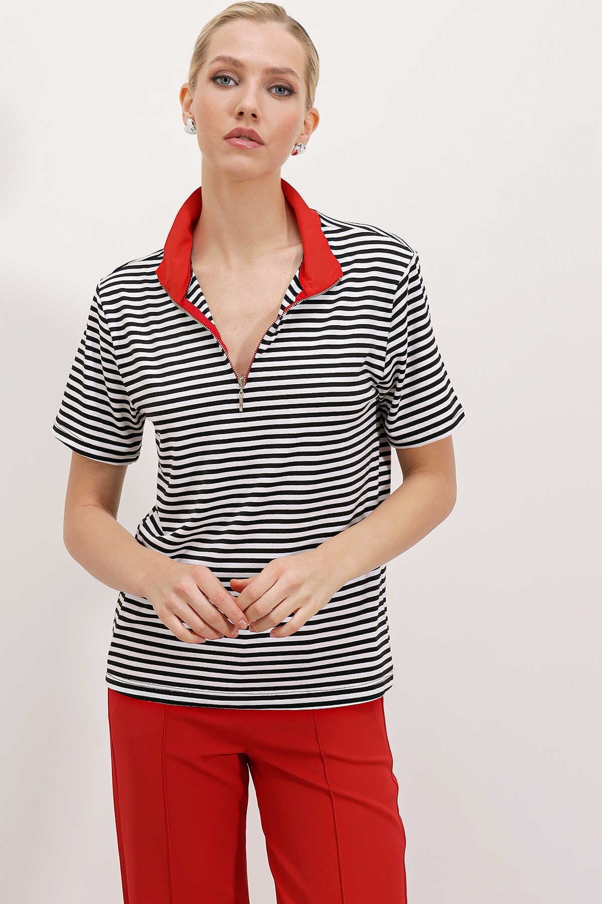 Kadın Kırmızı Polo Yaka Fermuarlı Çizgili Tişört 0497 - Kombin