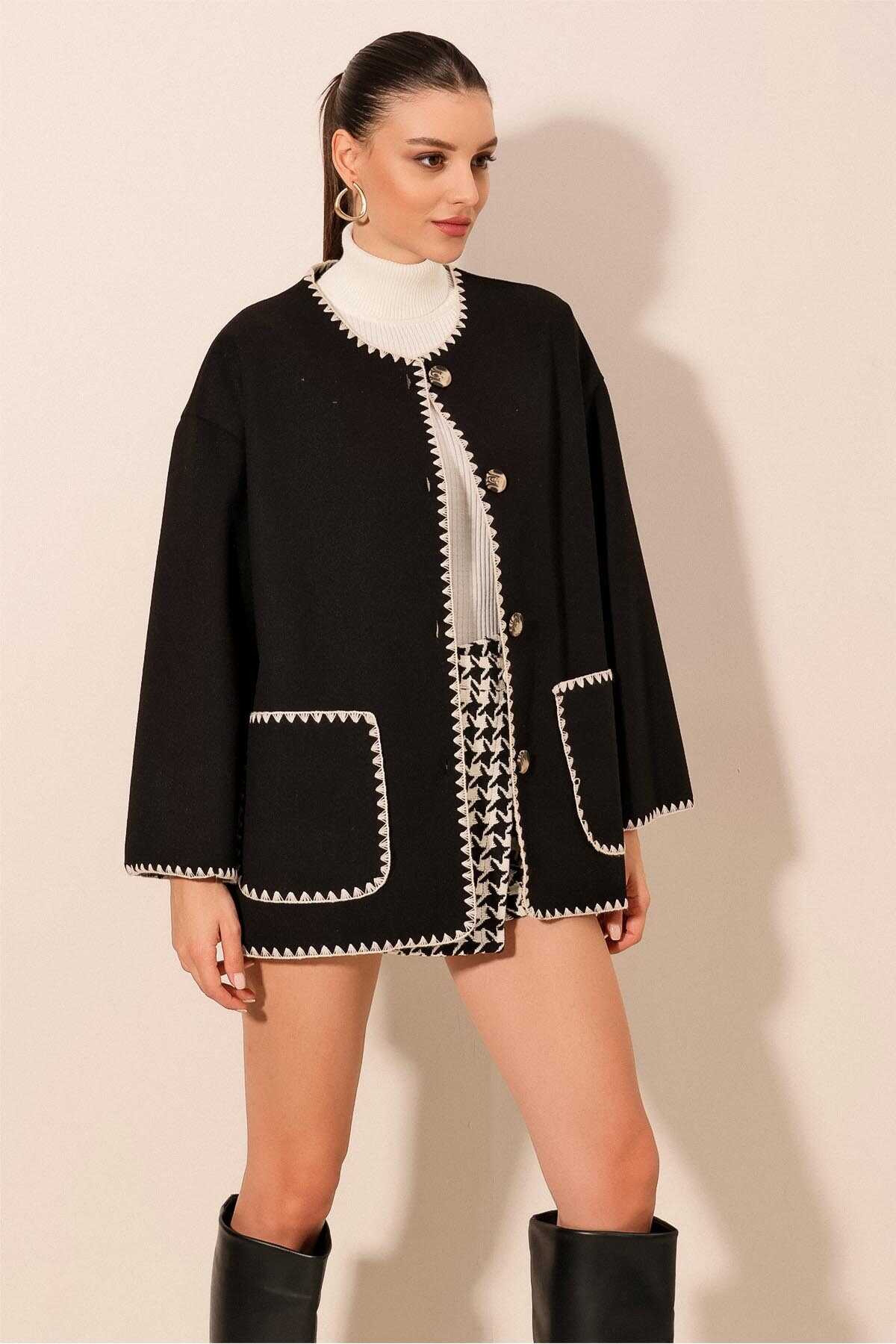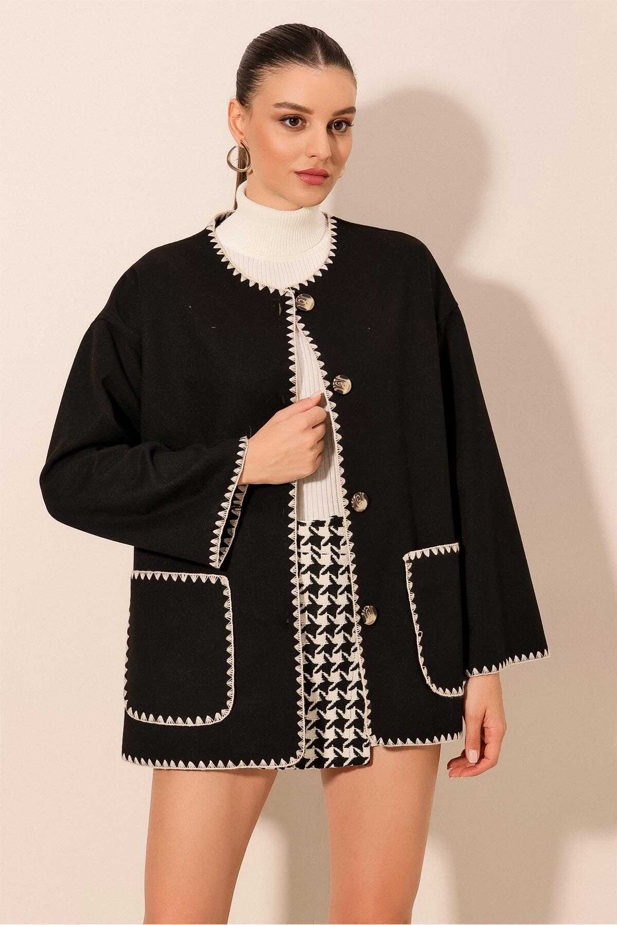 0690 Boyfriend Nakışlı Kaşe Ceket - Siyah - Kombin