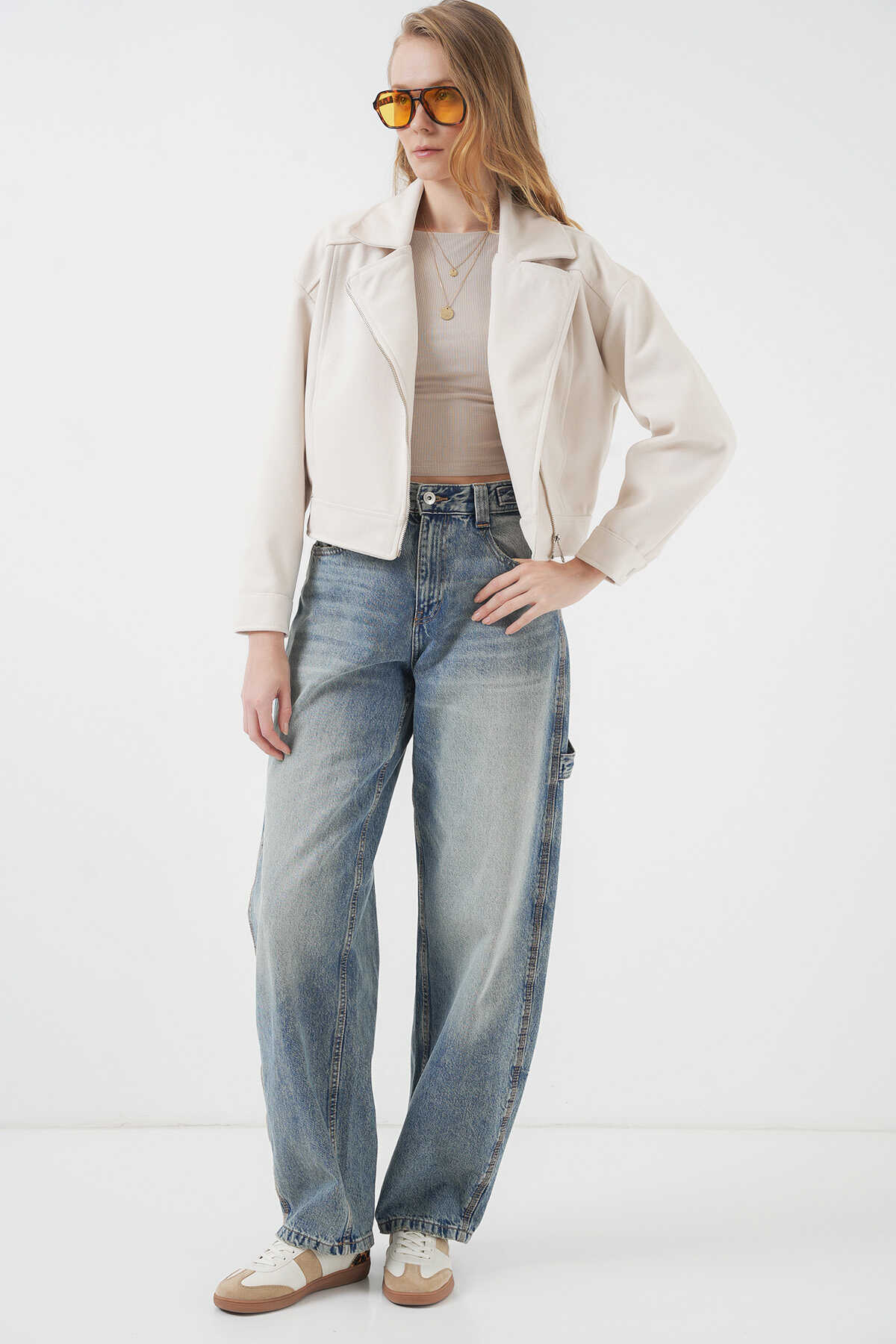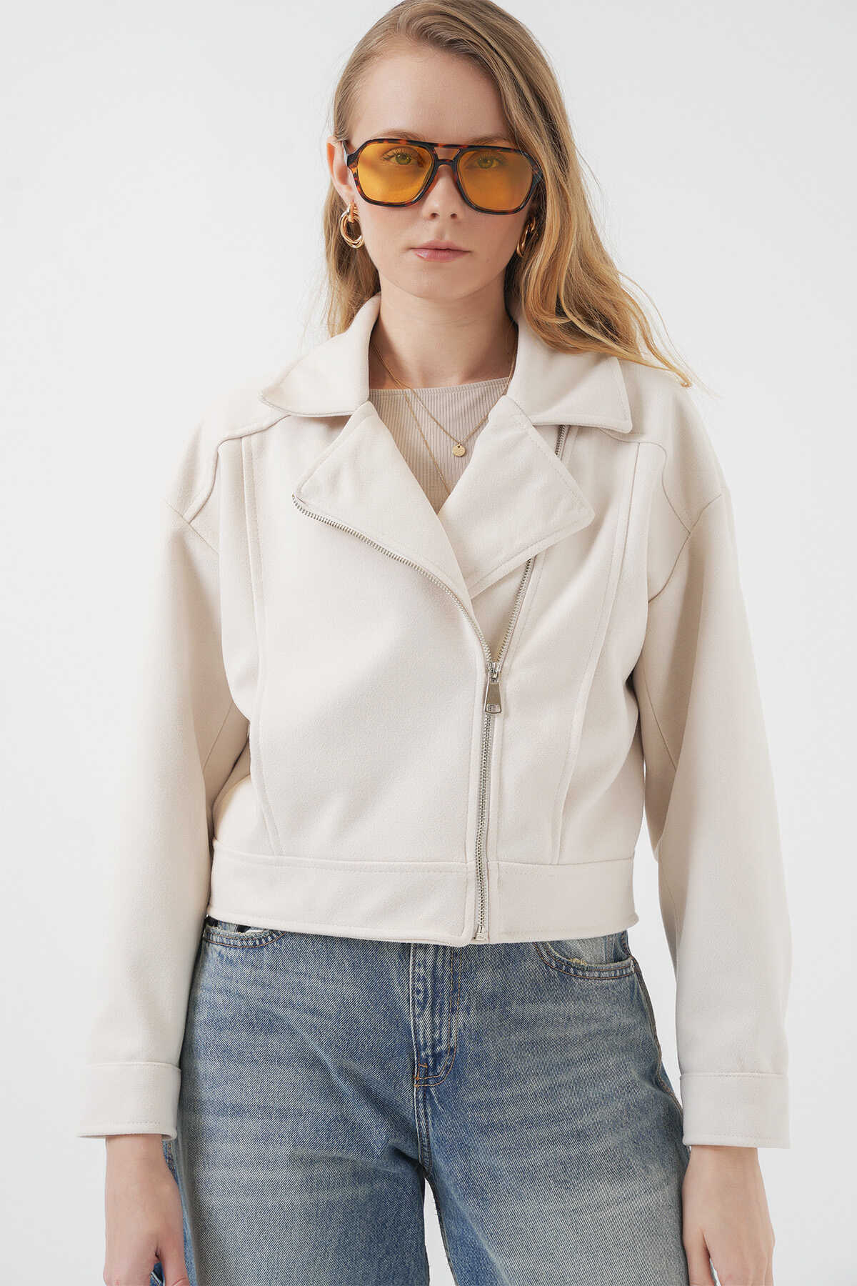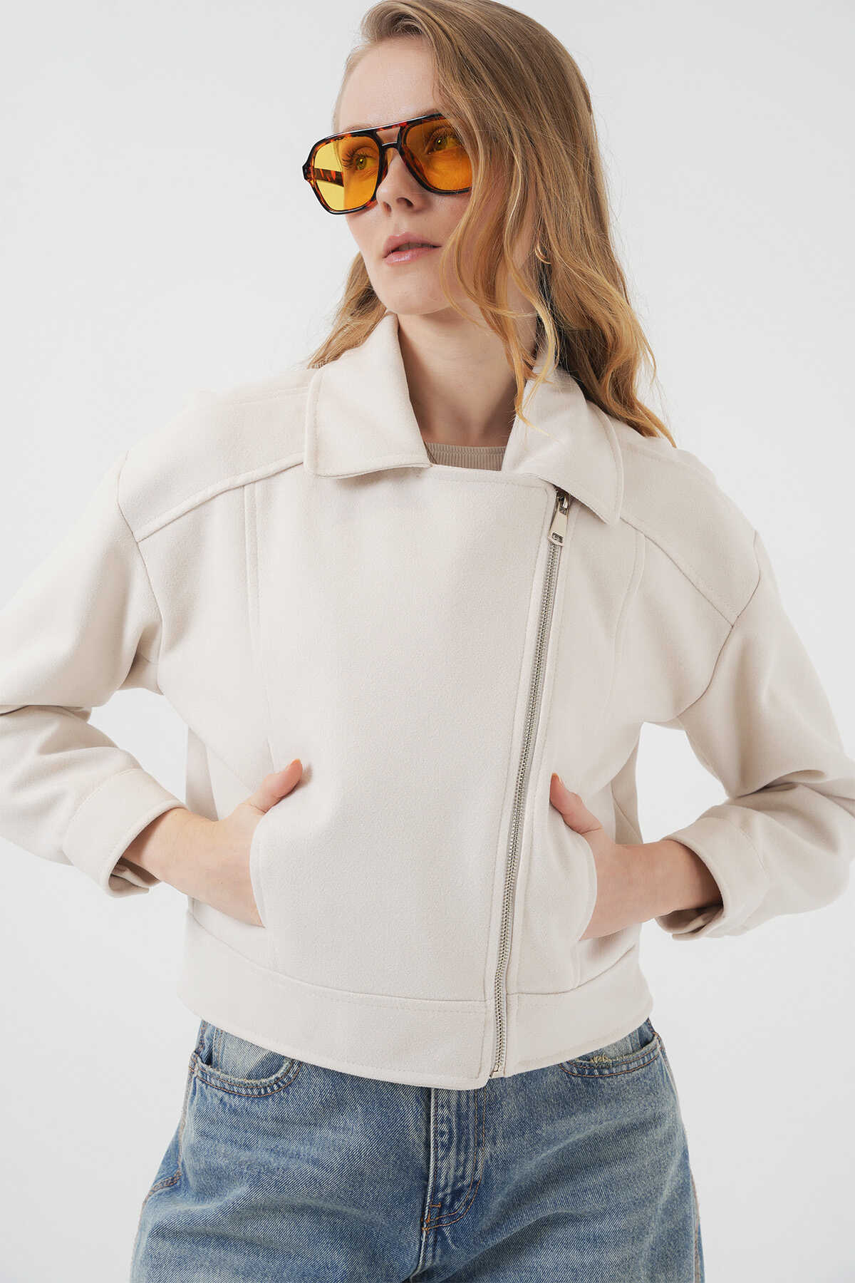 0717 Kadın Kısa Kaşe Ceket - Ekru - Kombin