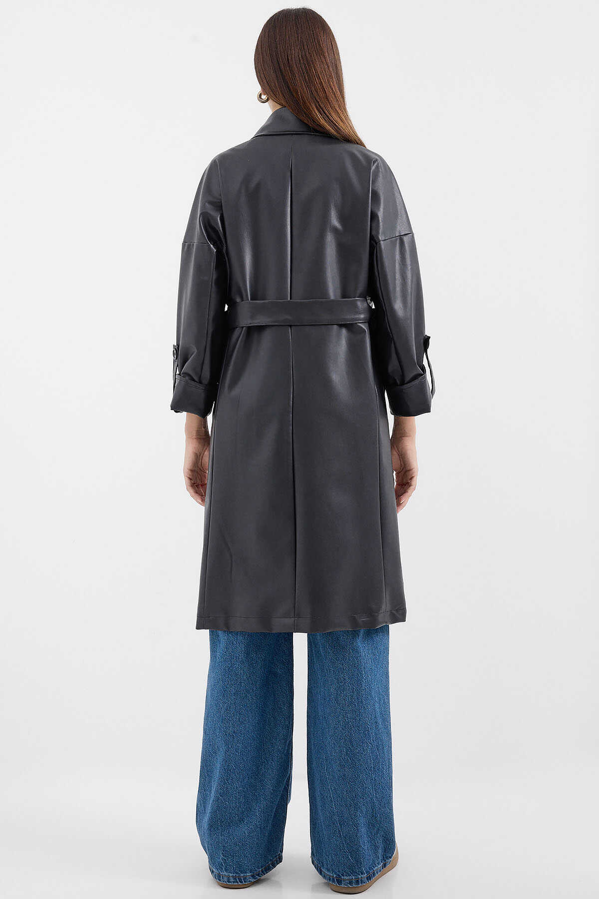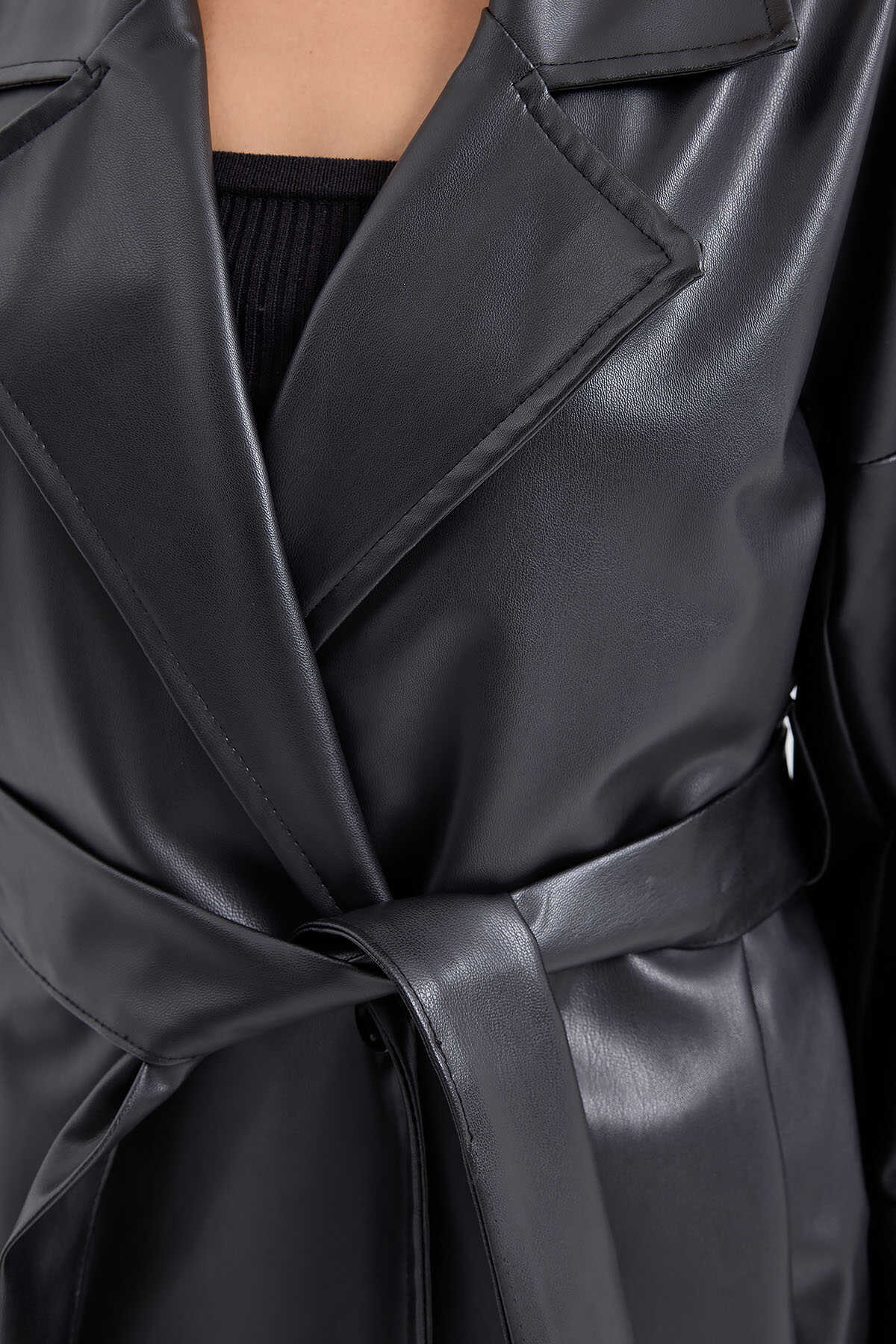 1034 Kuşaklı Suni Deri Trençkot - Siyah - Kombin