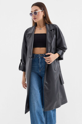 1034 Kuşaklı Suni Deri Trençkot - Siyah