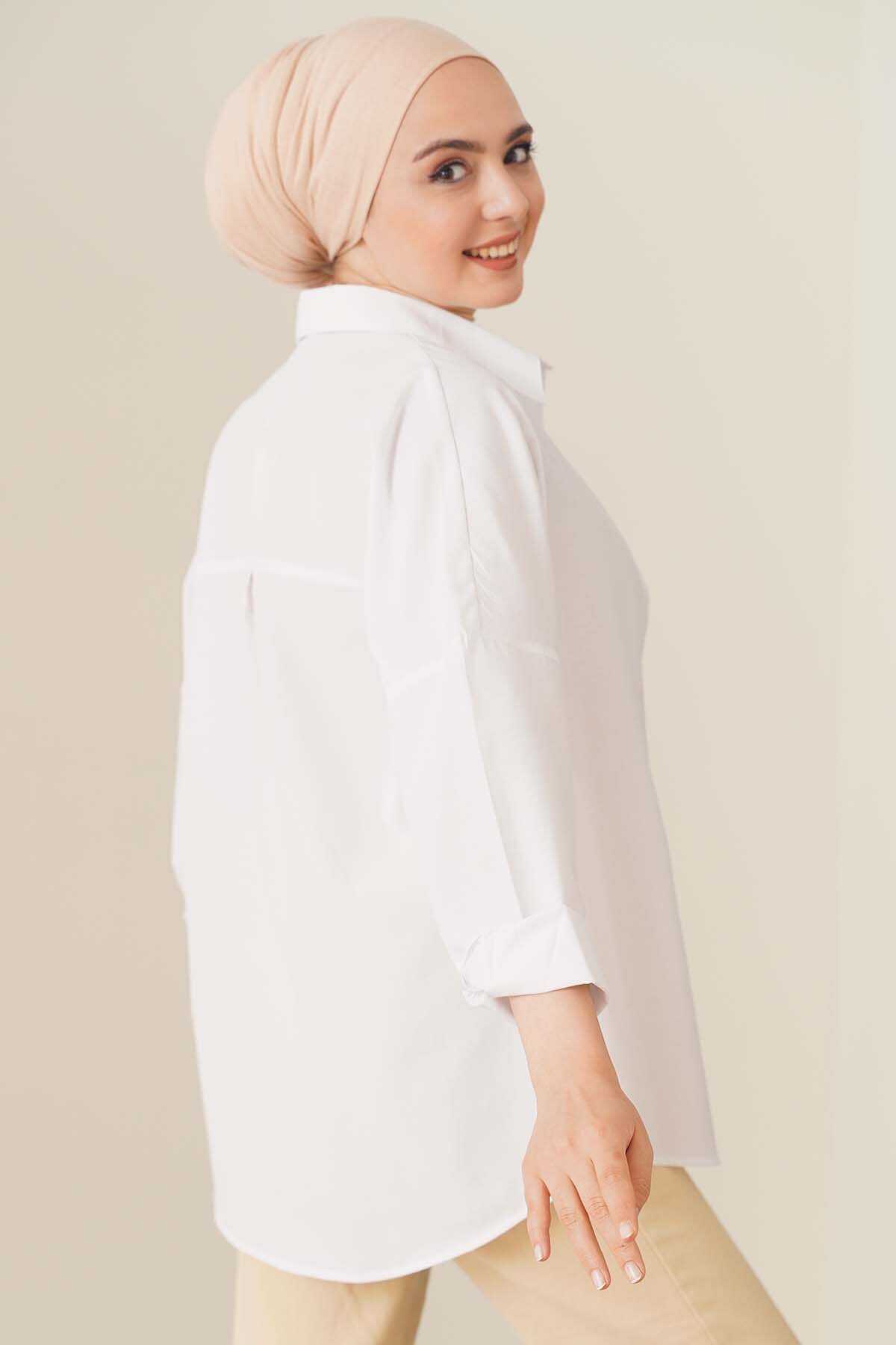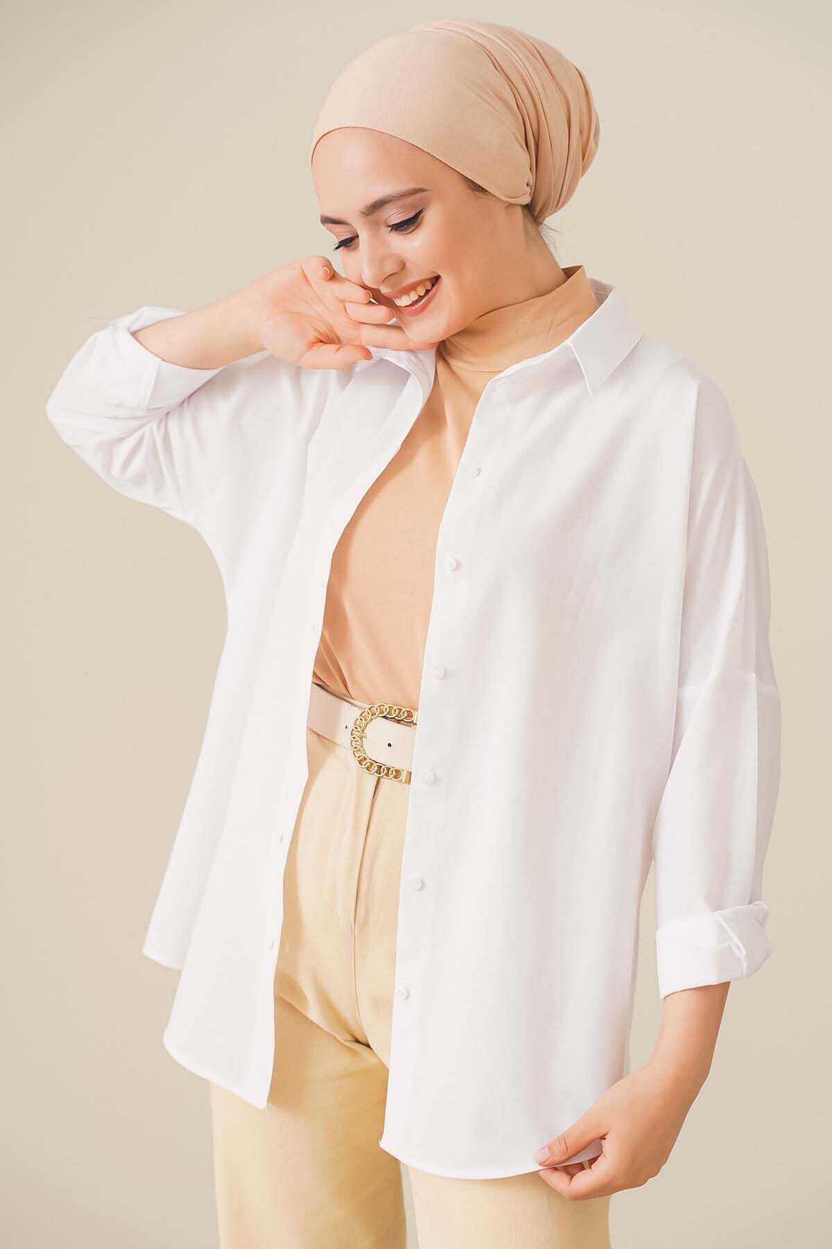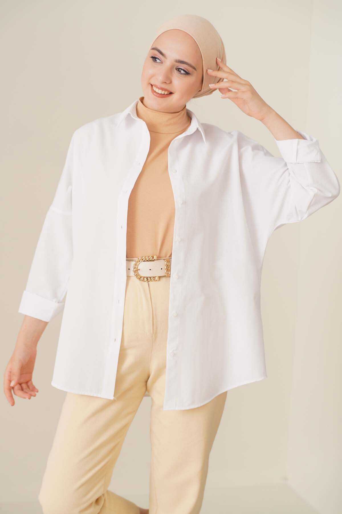 103901 Oversize Basic Tesettür Gömlek - Beyaz - Kombin