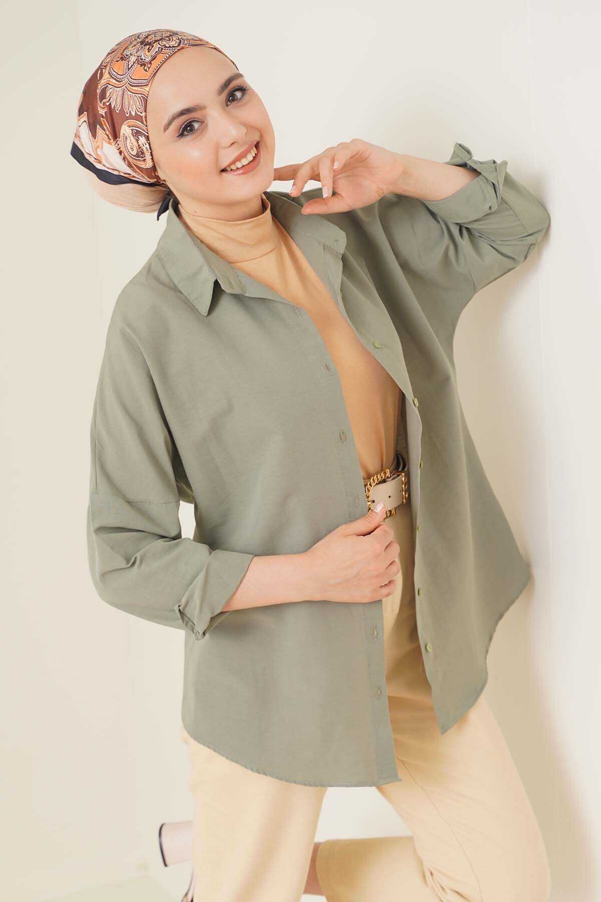 103901 Oversize Basic Tesettür Gömlek - Haki - Kombin
