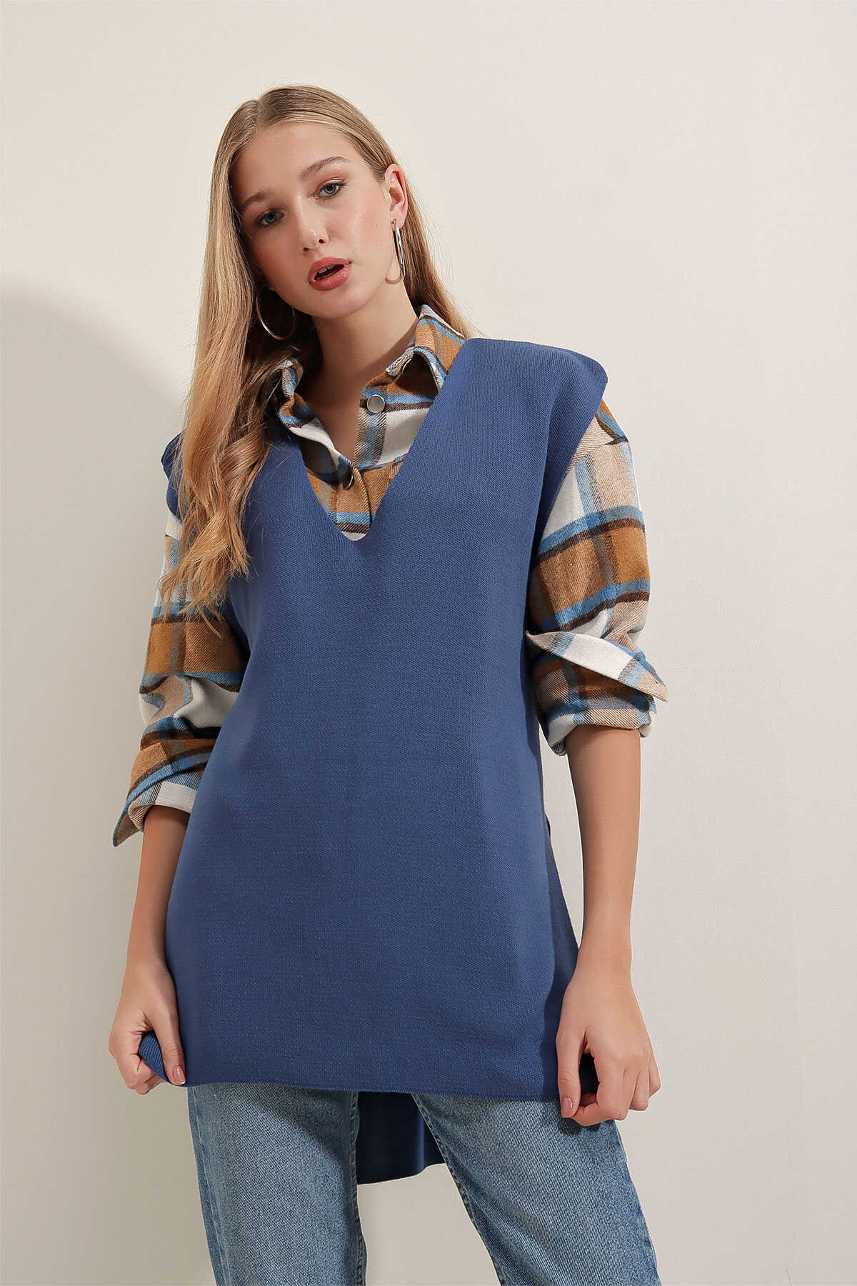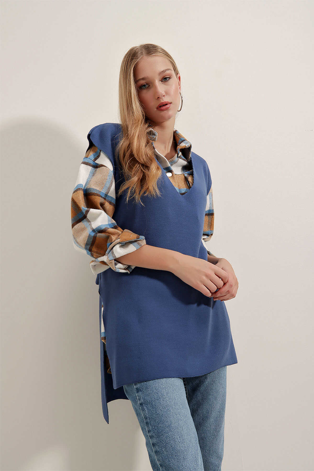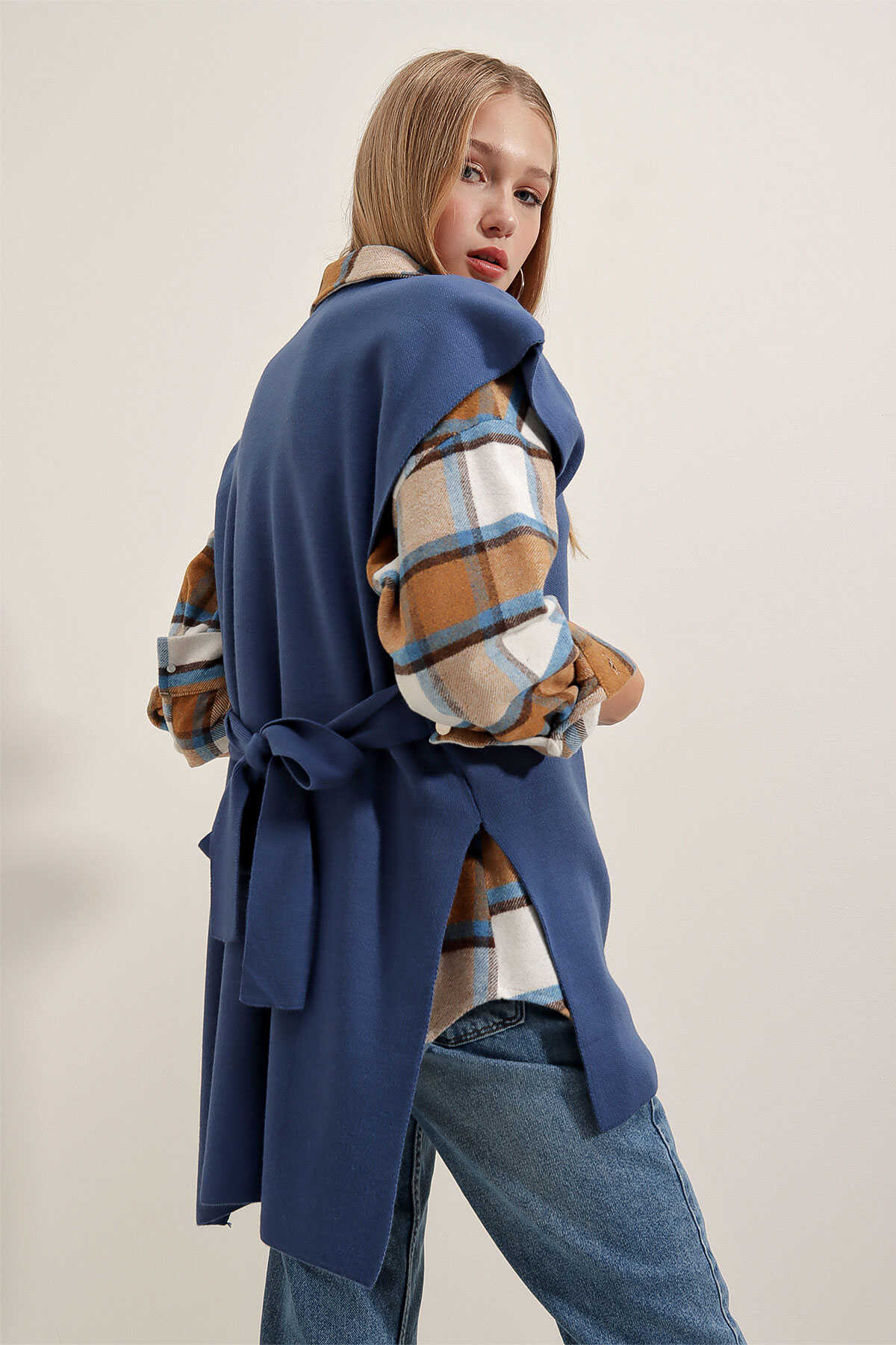 15760 Kuşaklı Triko Süveter - Saks - Kombin