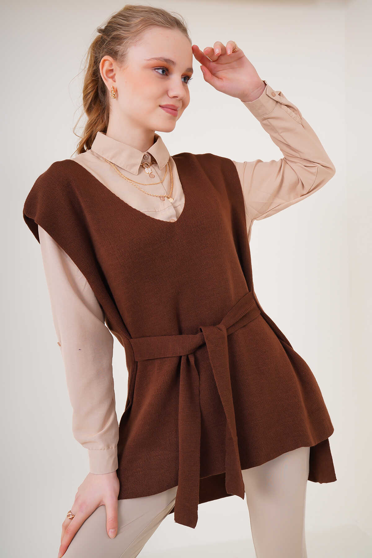 15760 Kuşaklı Triko Süveter - Kahverengi