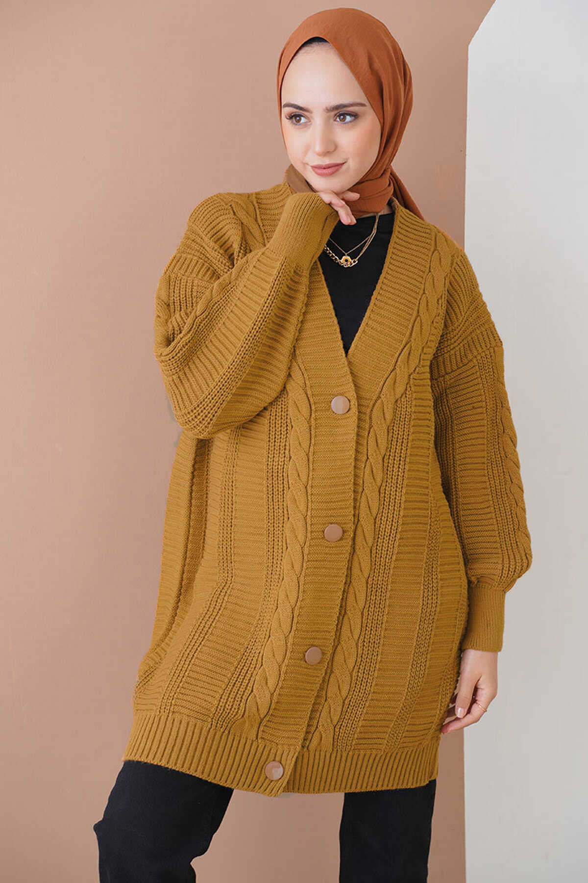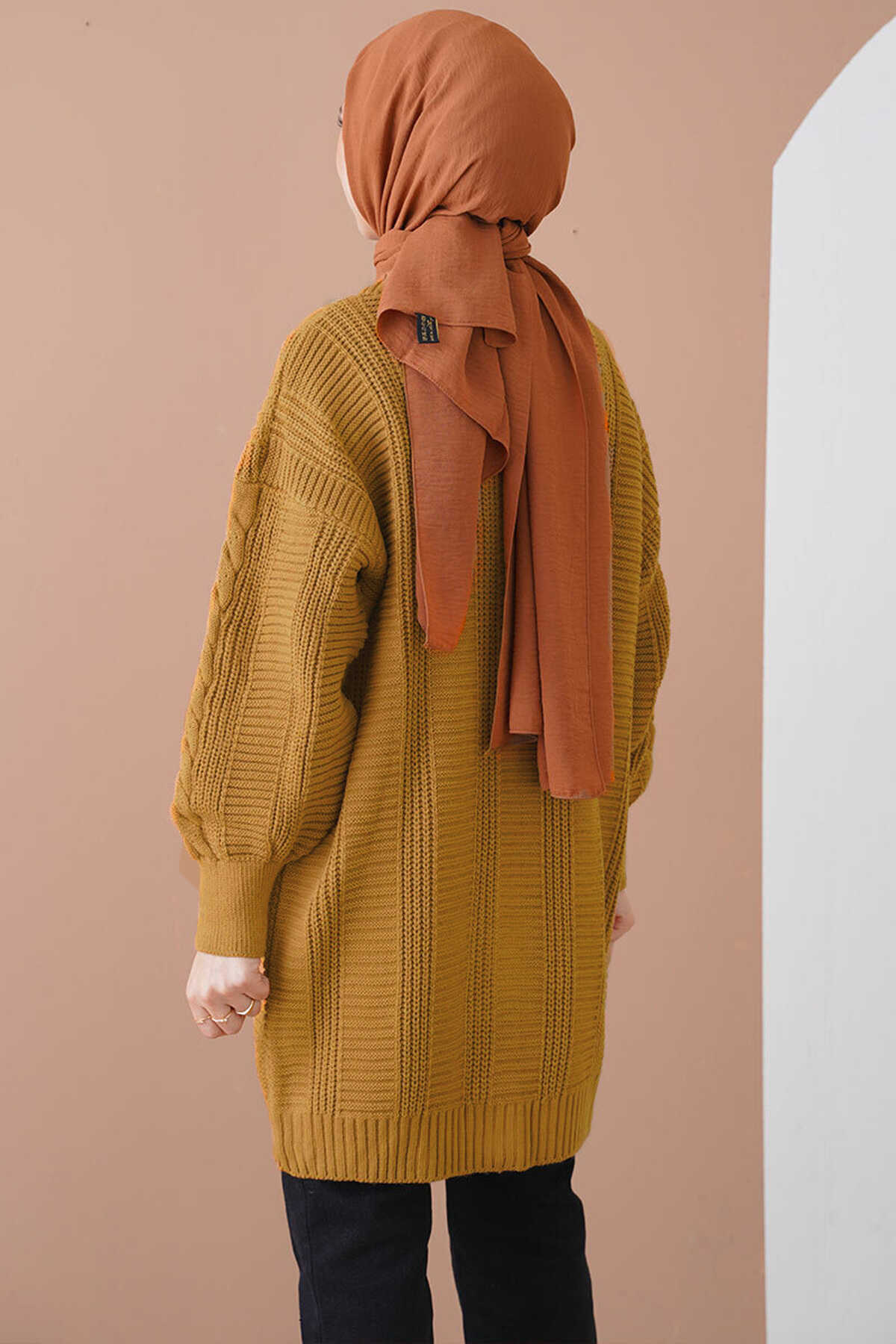 15768 Tesettür Triko Hırka - Hardal - Kombin