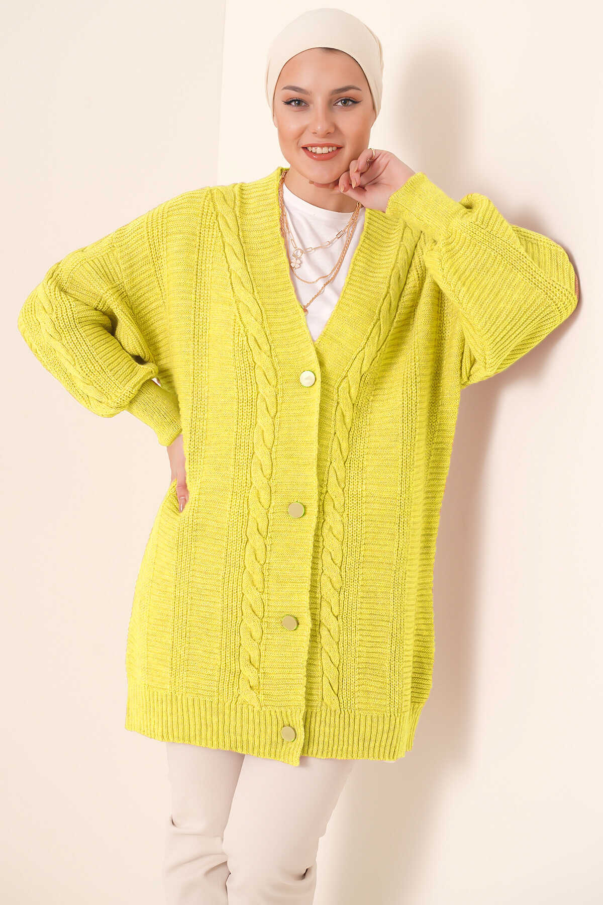 Saç Örgü Desen Dügmeli Triko Hirka