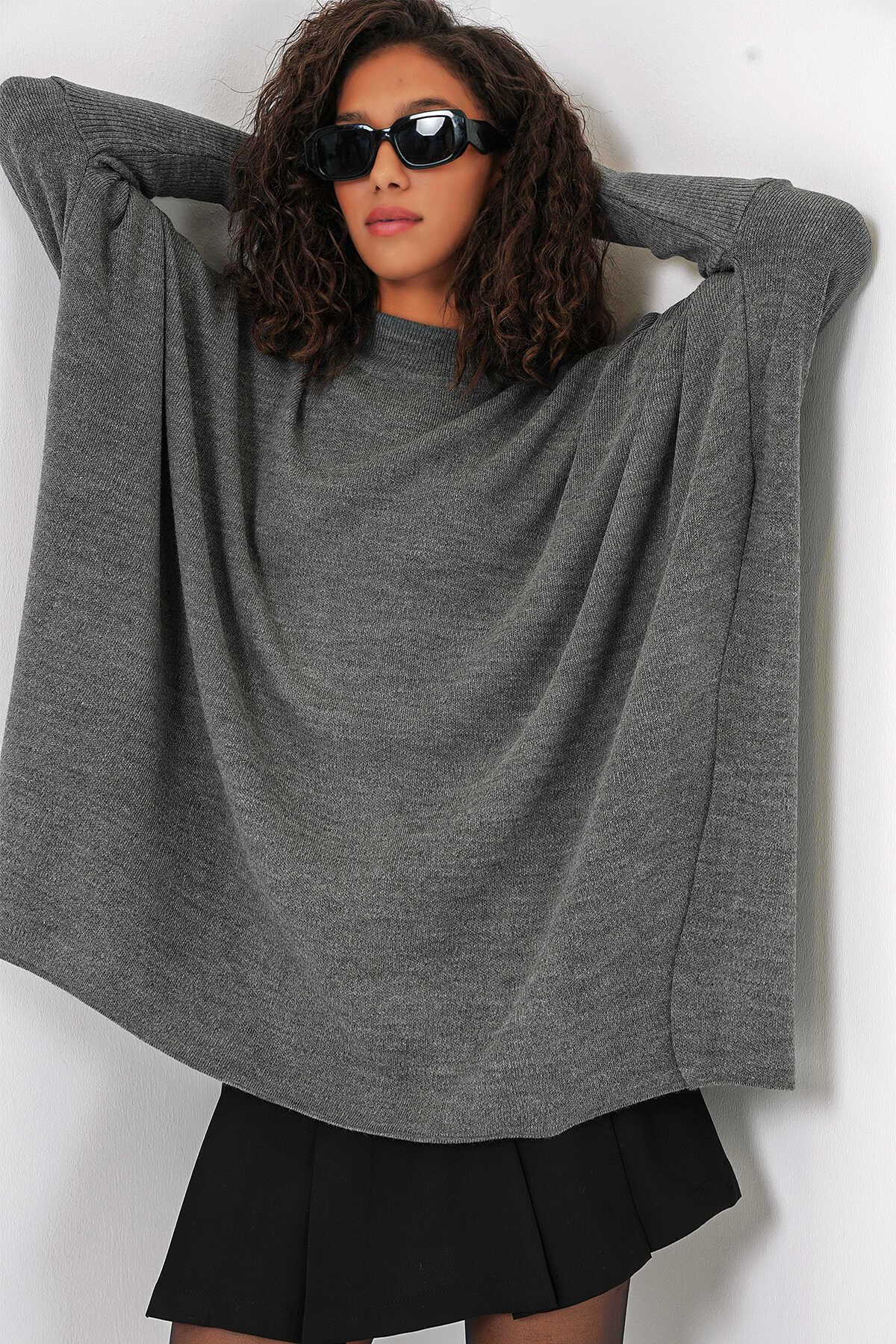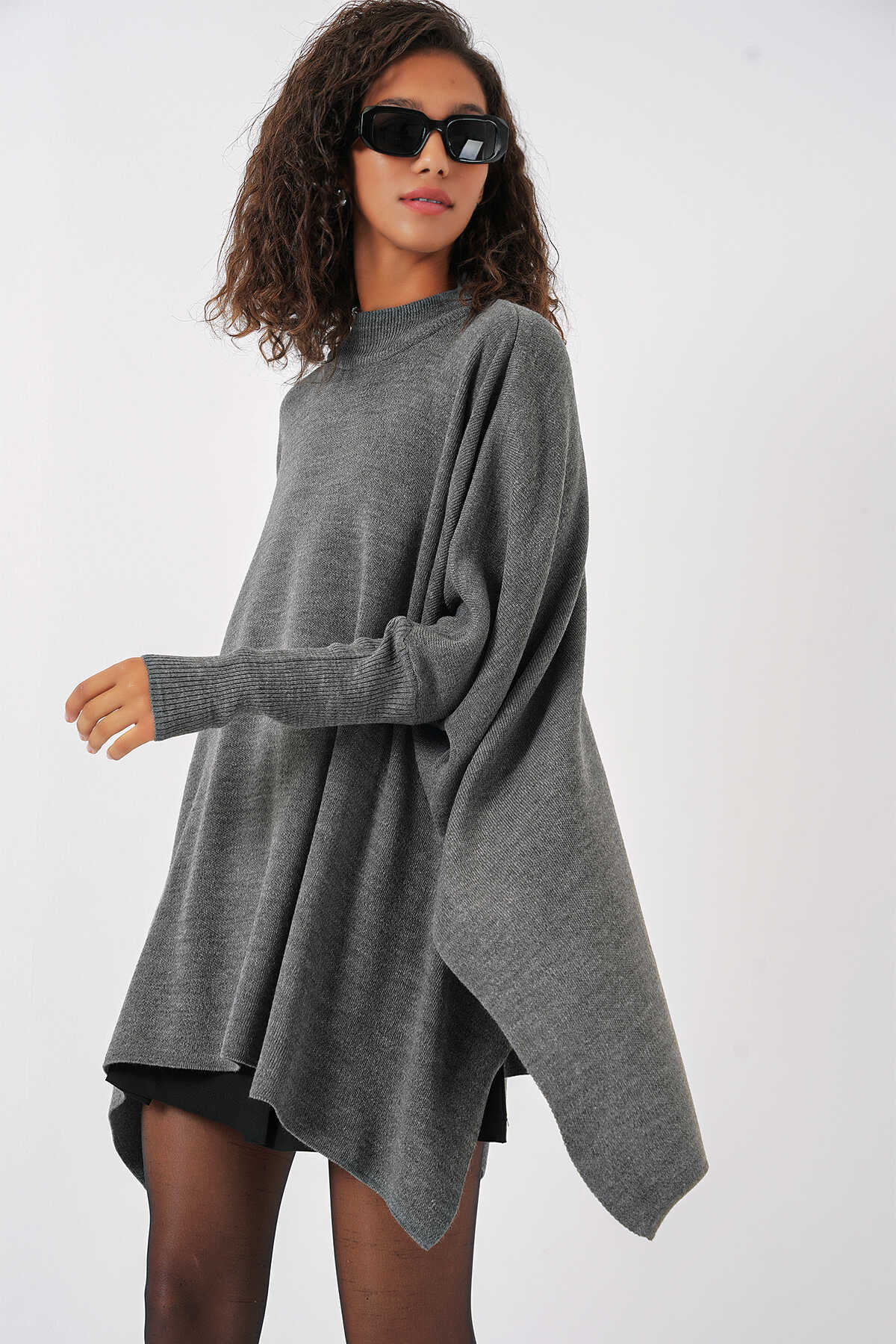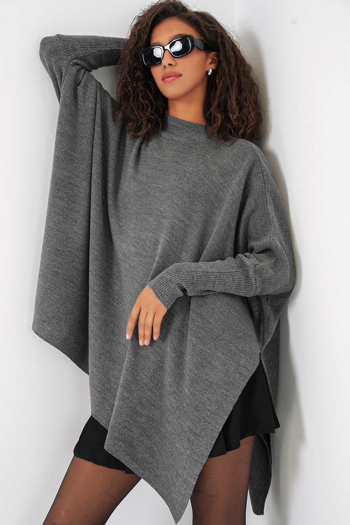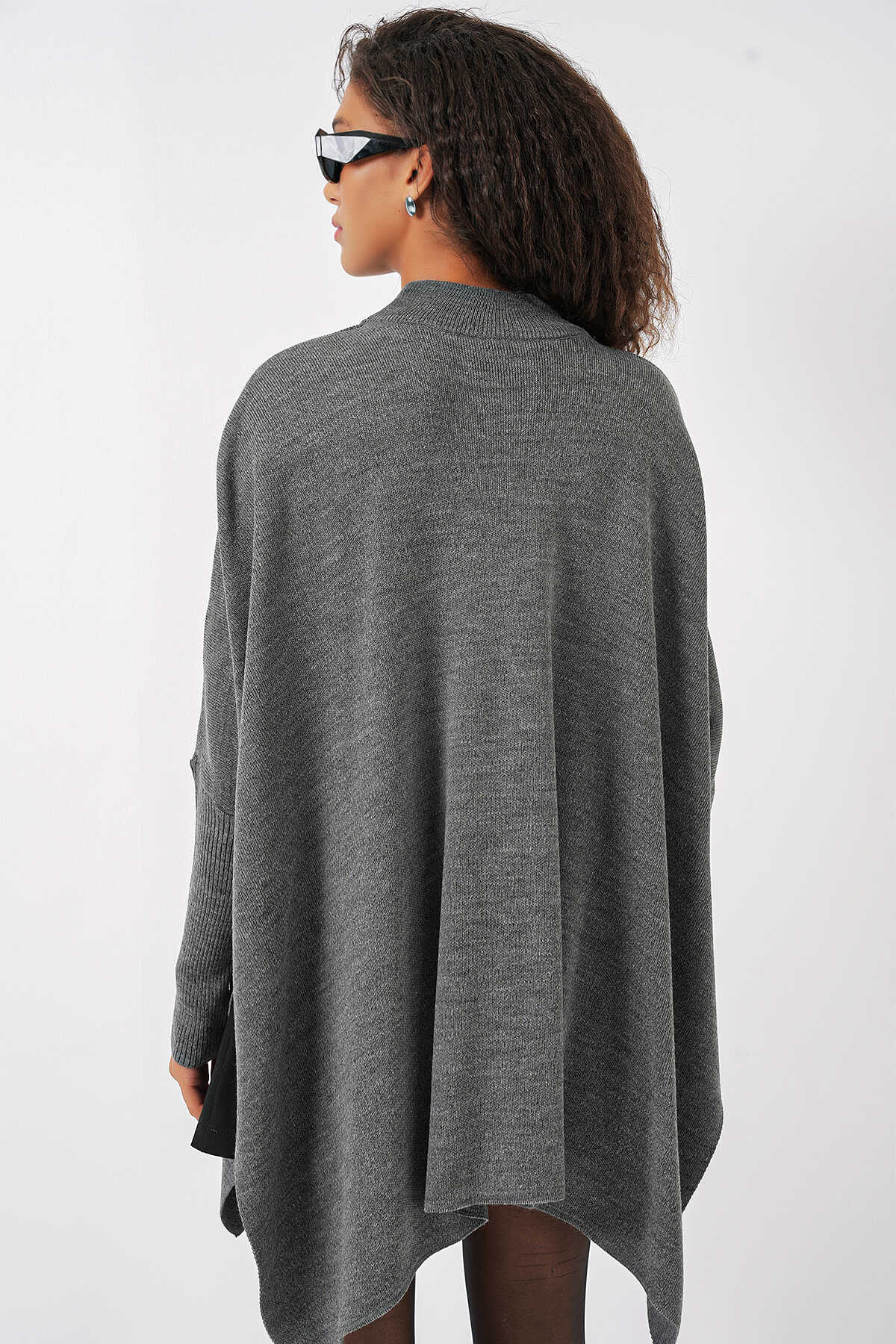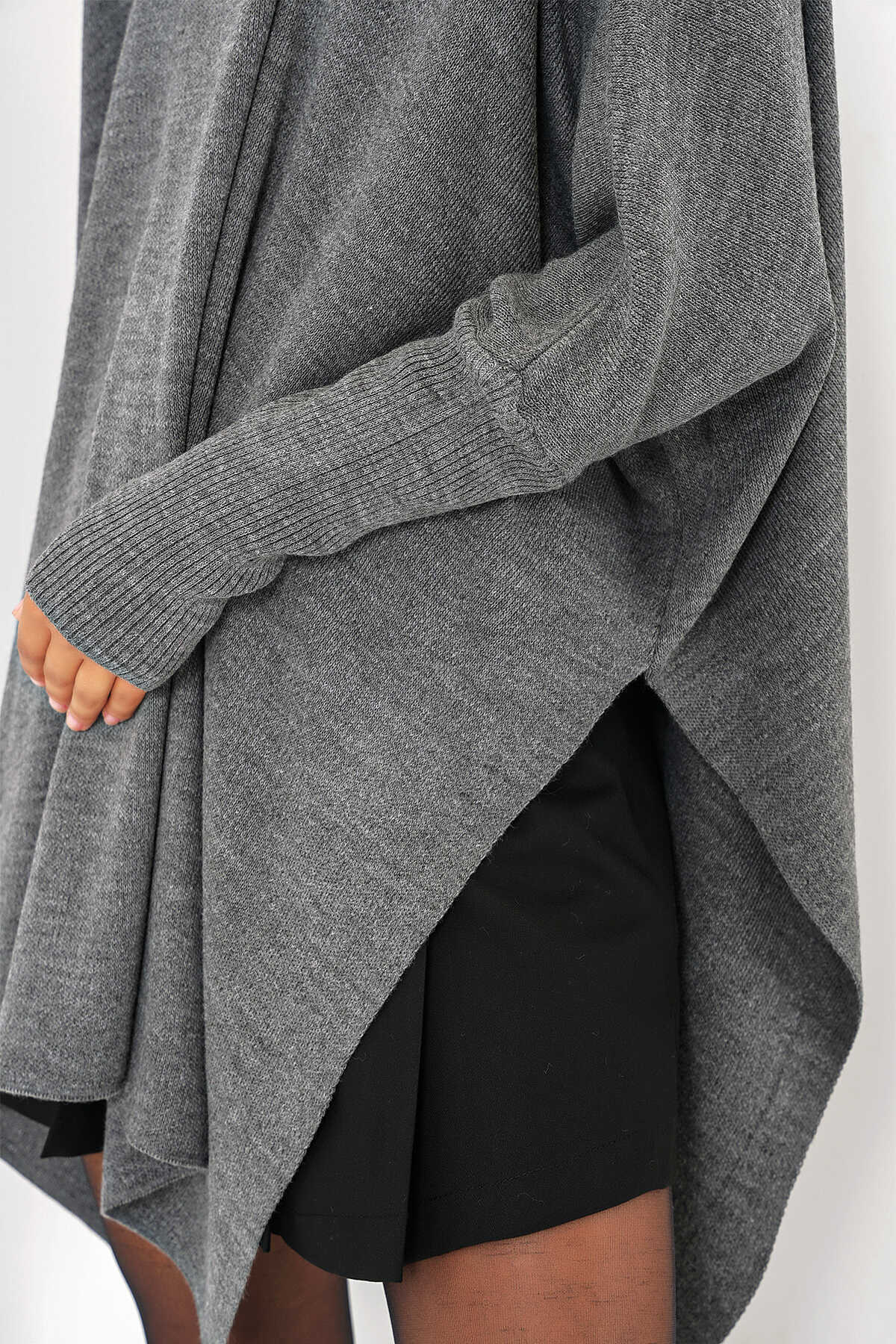 15783 Yırtmaçlı Panço Kazak - A.Gri - Kombin