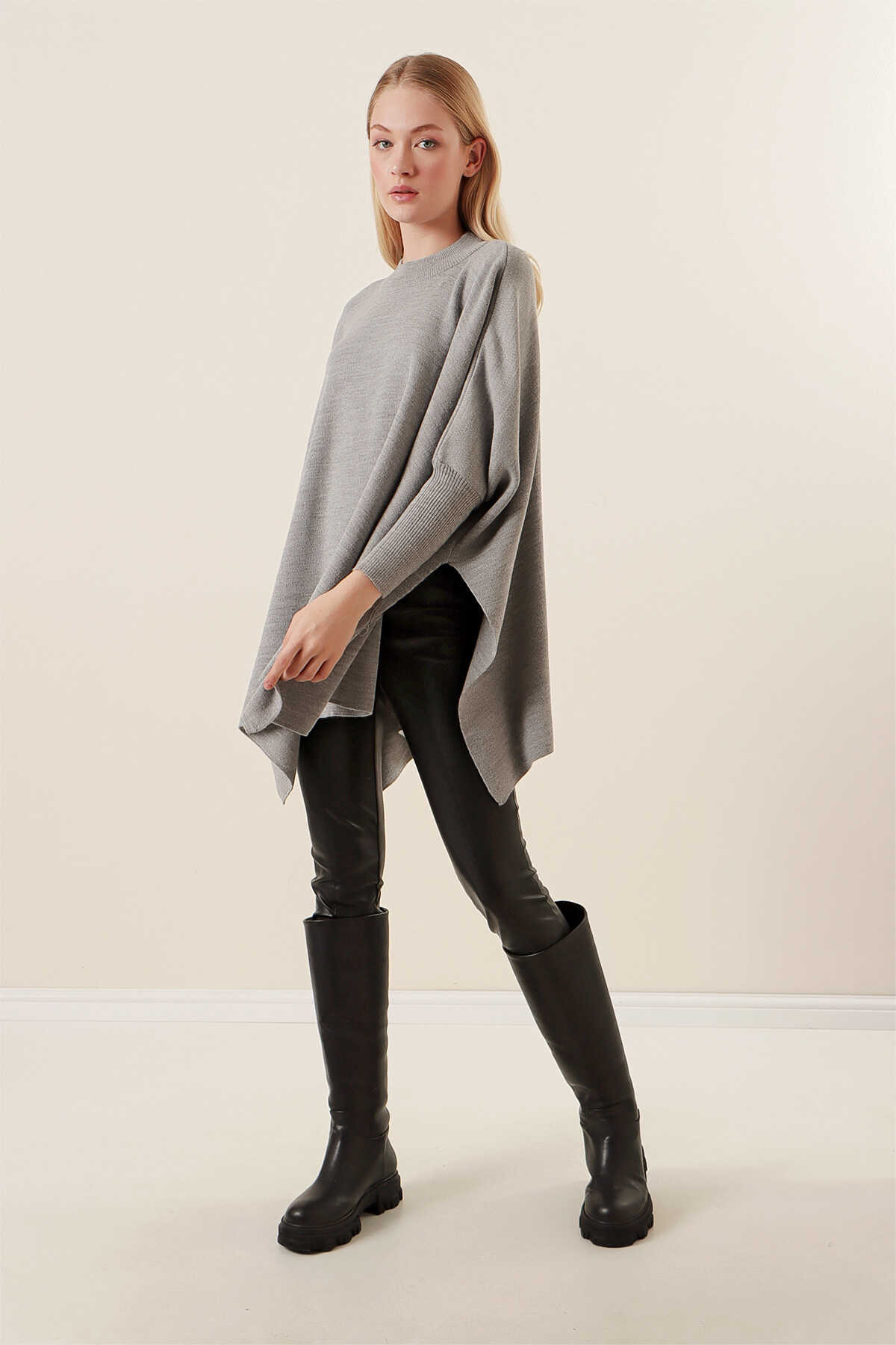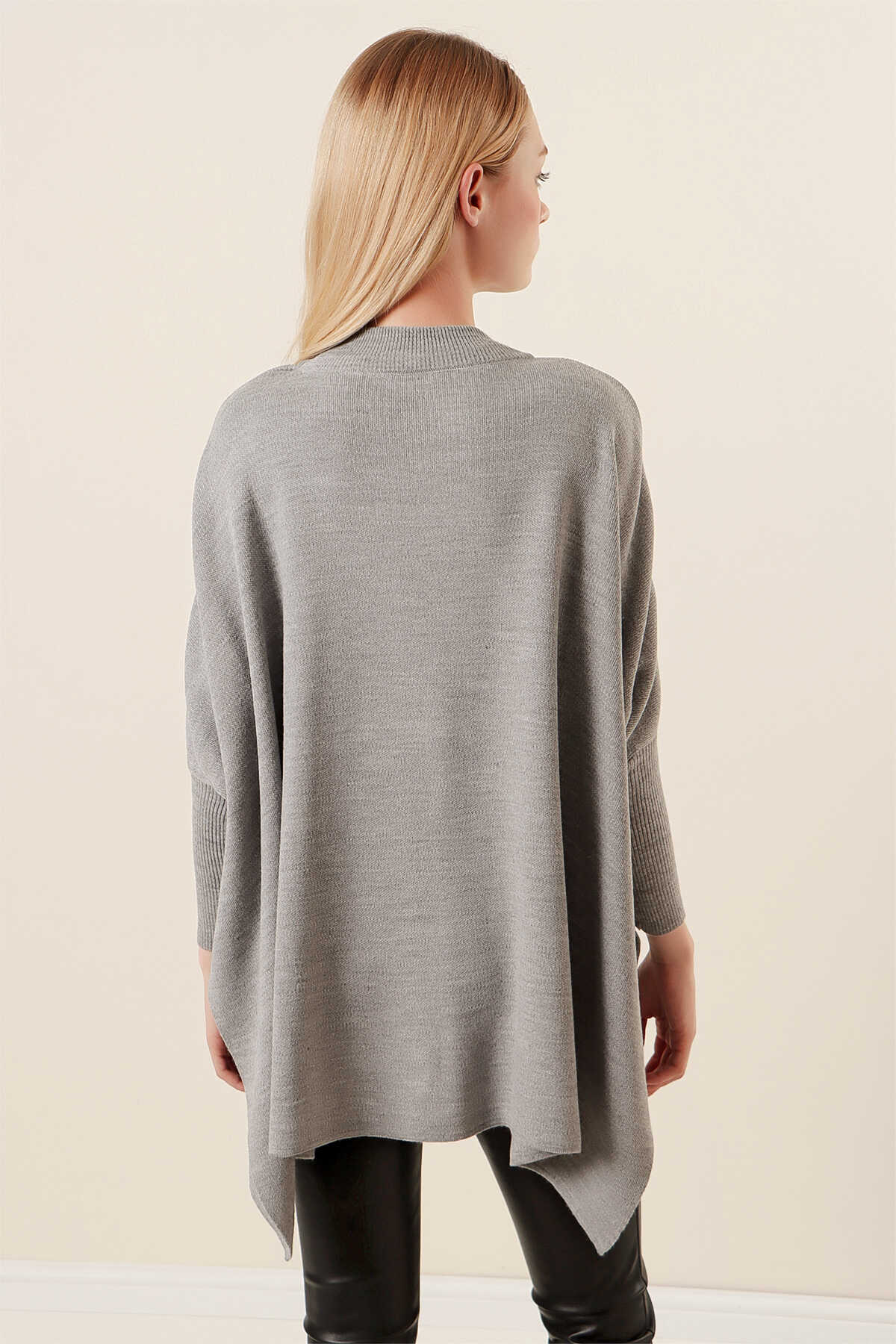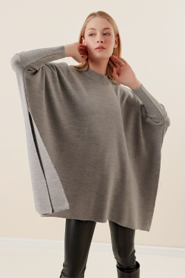 15783 Yırtmaçlı Panço Kazak - Gri - Kombin