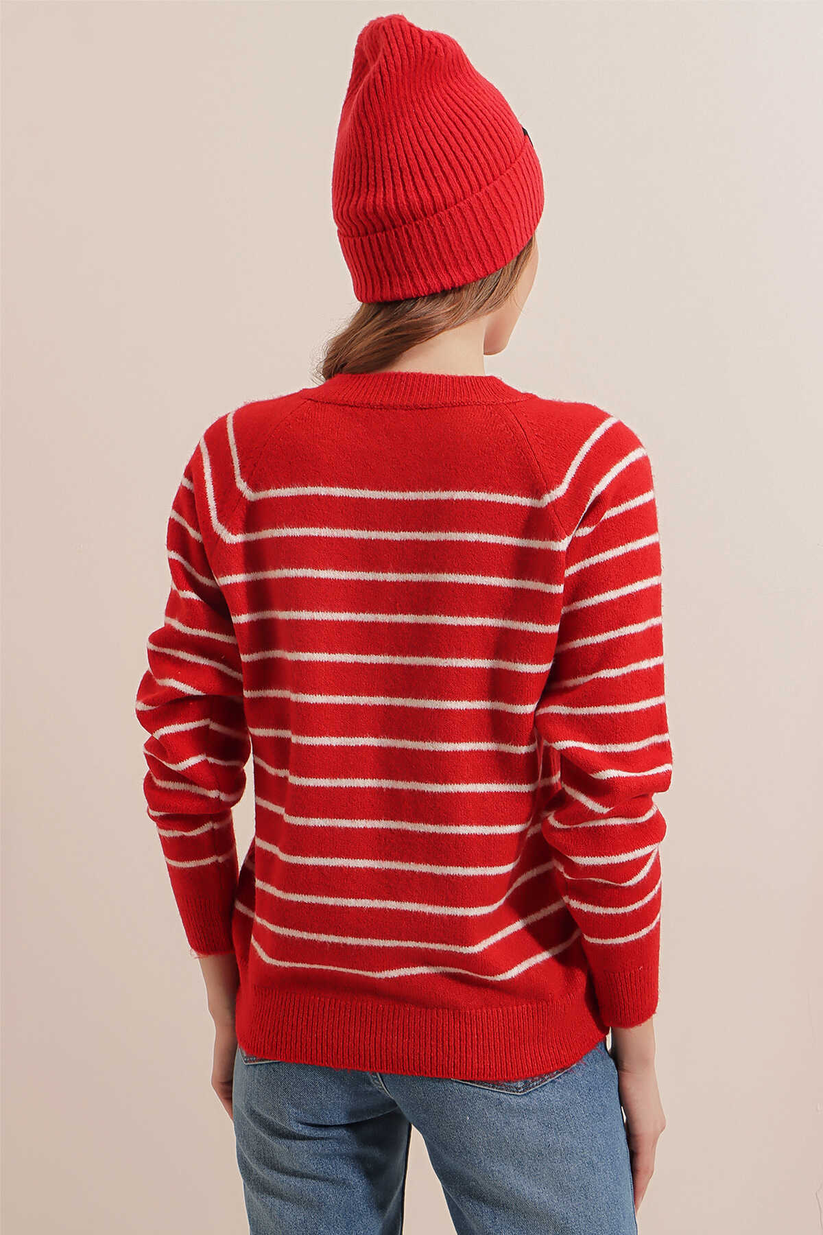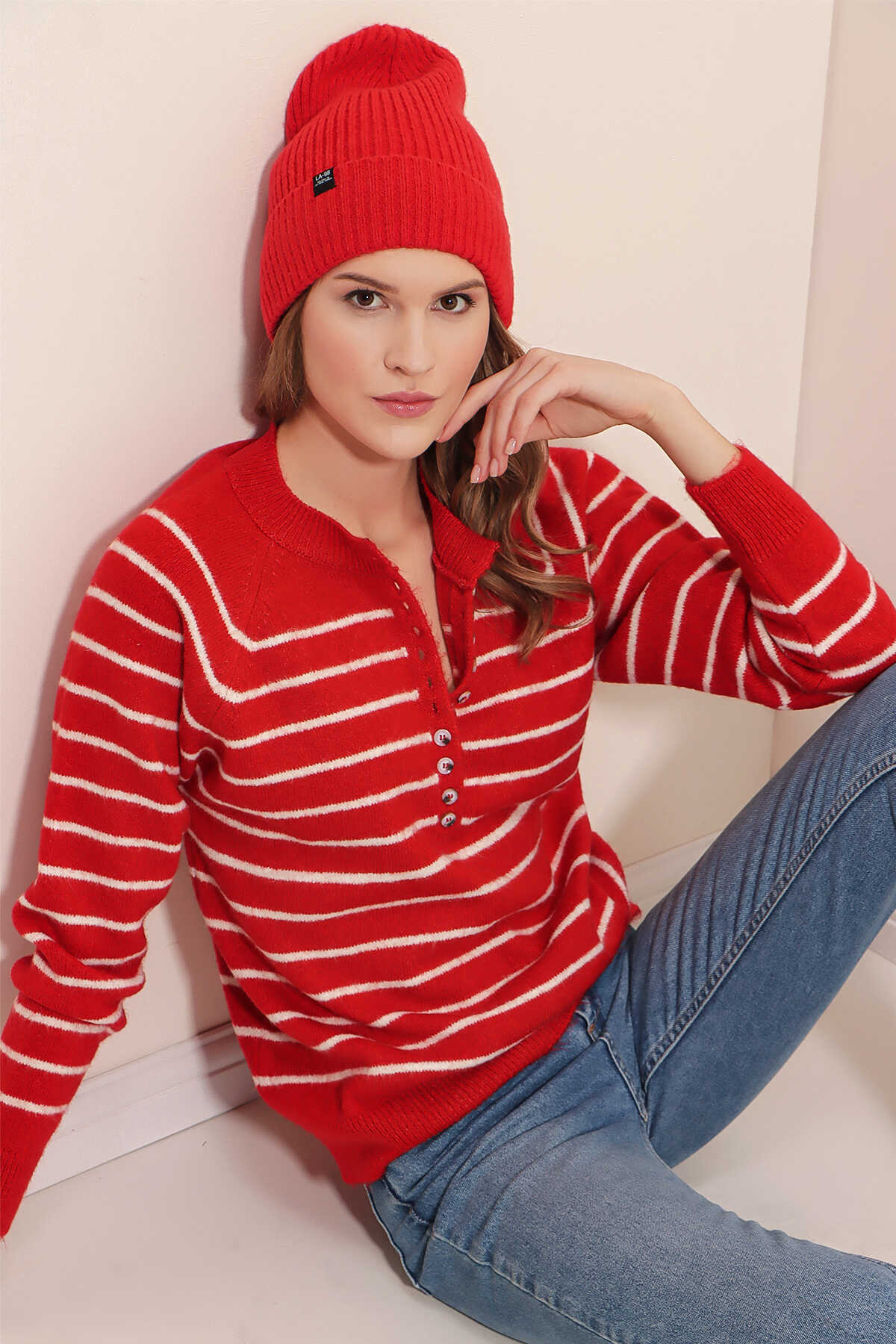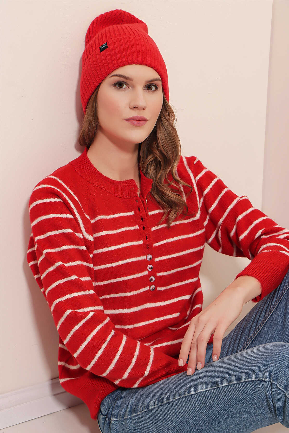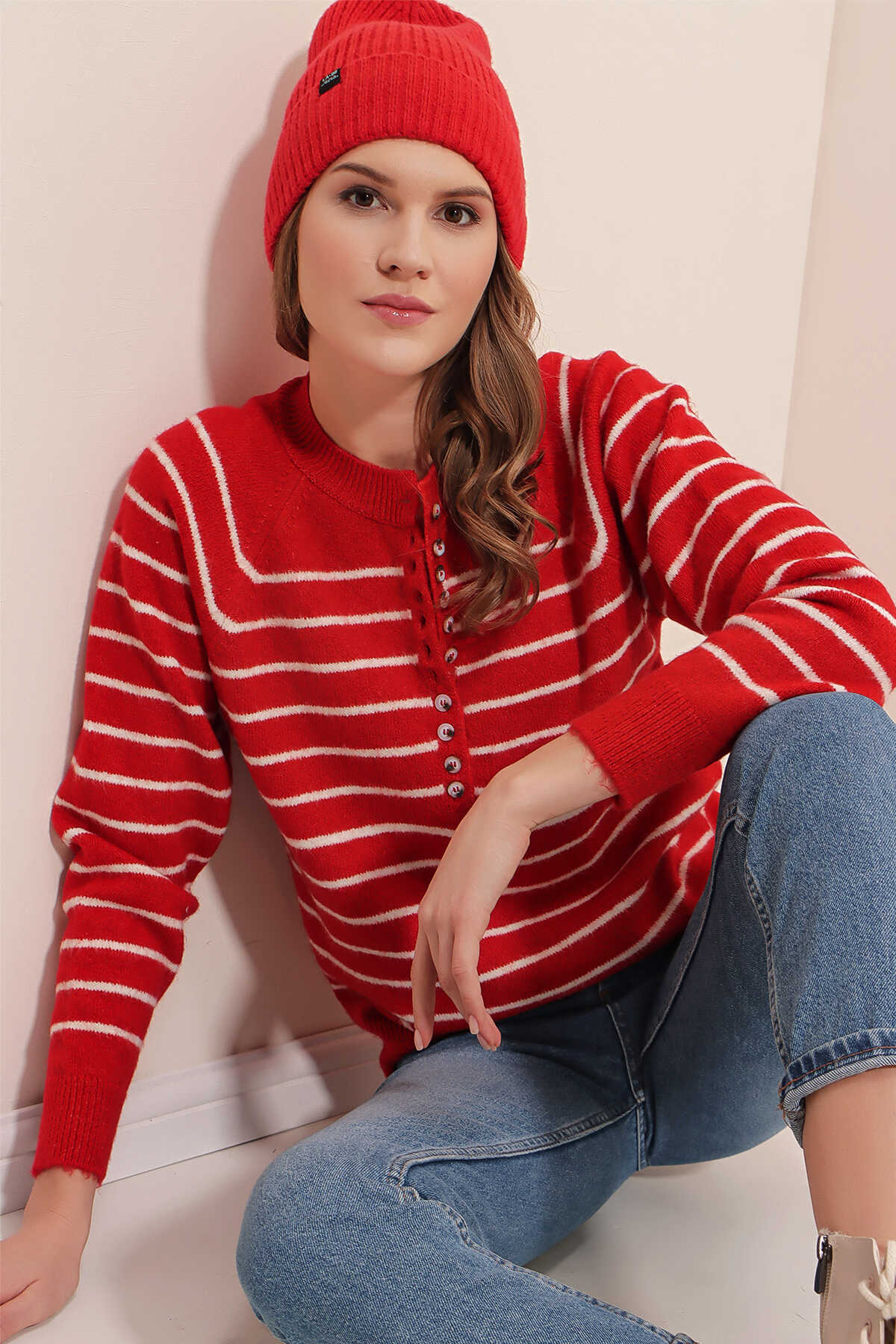 15808 Düğmeli Kazak - Kırmızı - Kombin