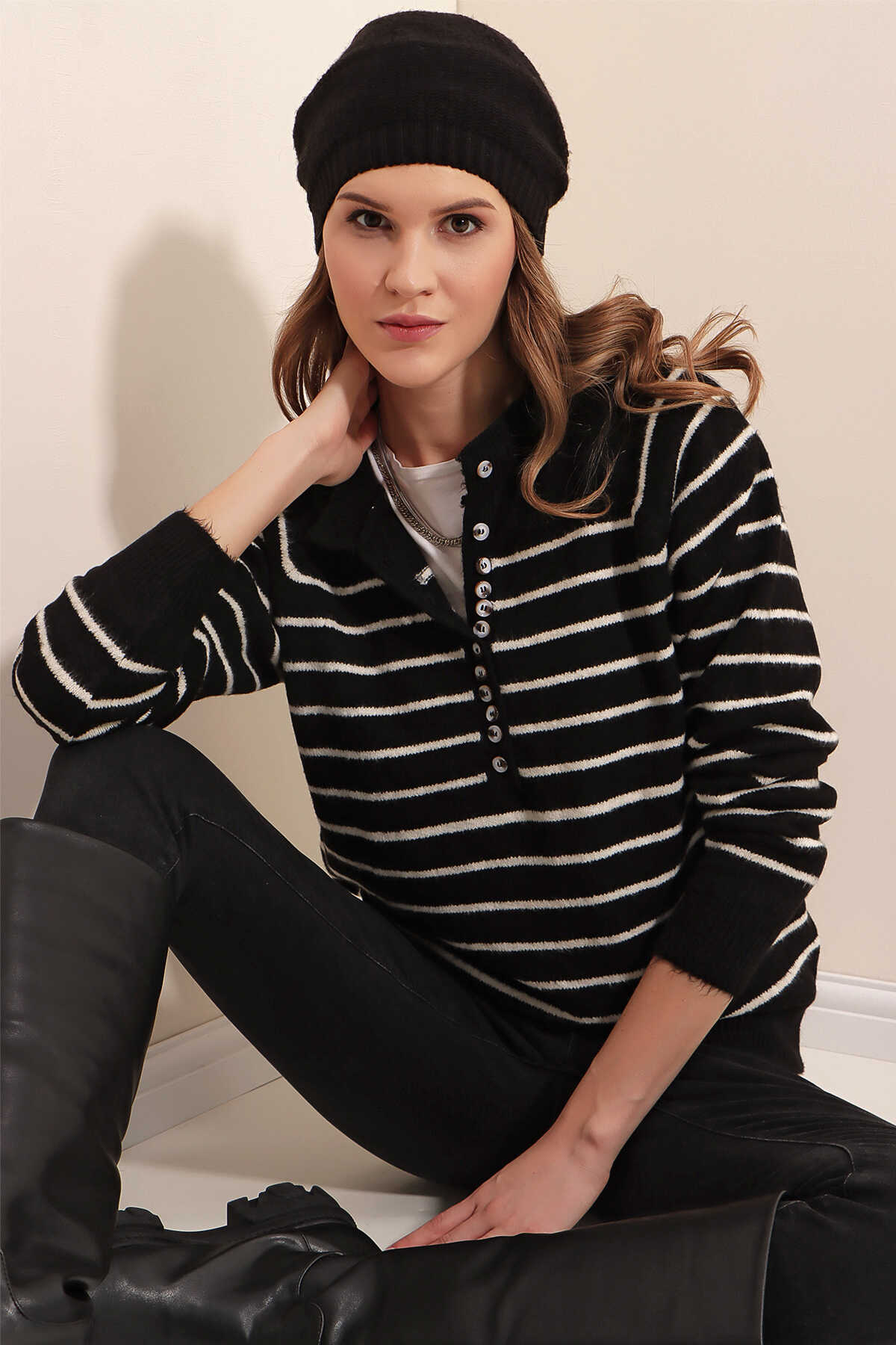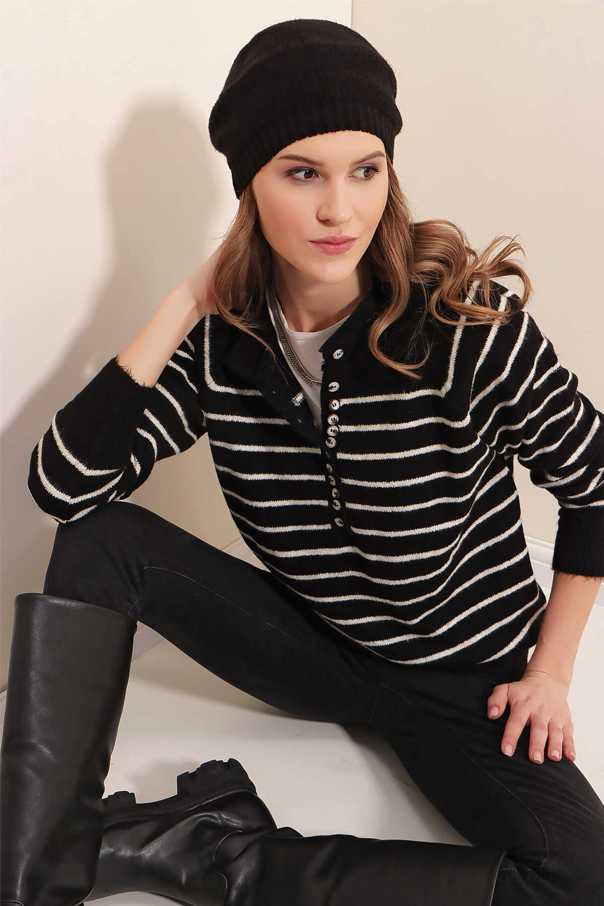 15808 Düğmeli Kazak - Siyah - Kombin