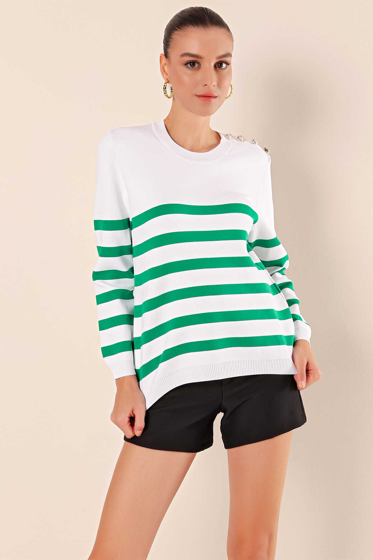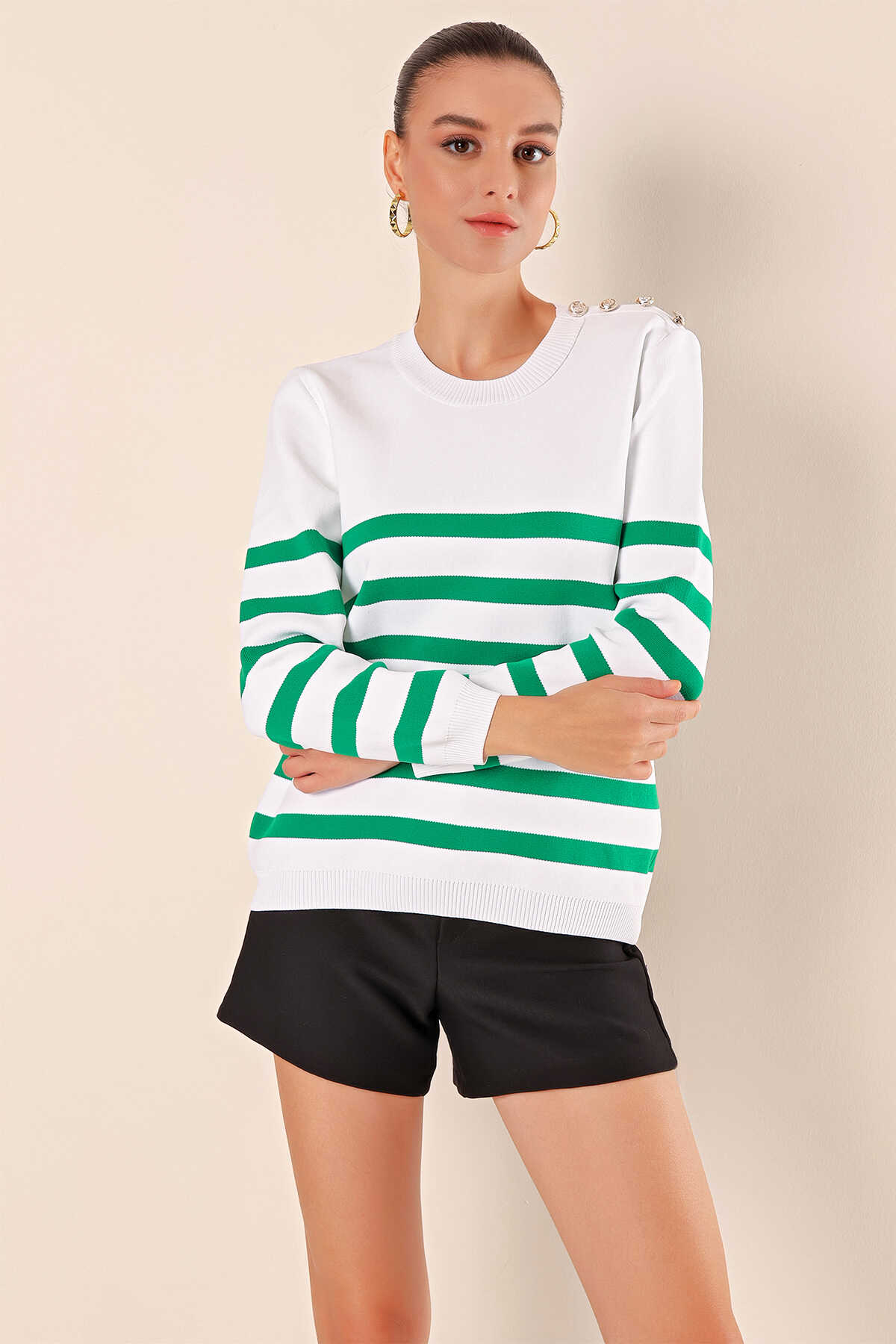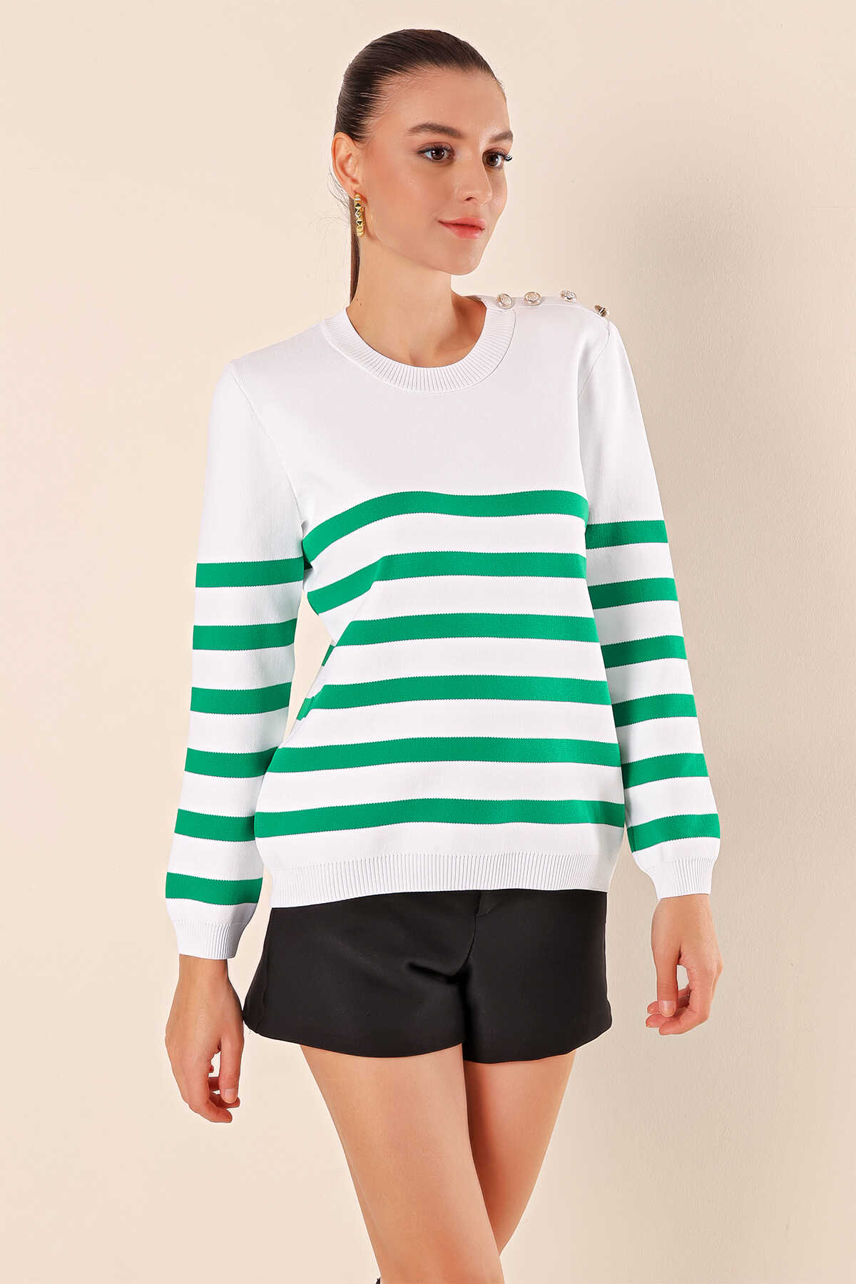 15820 Düğme Detay Çizgili Kazak - C.Yeşil - Kombin