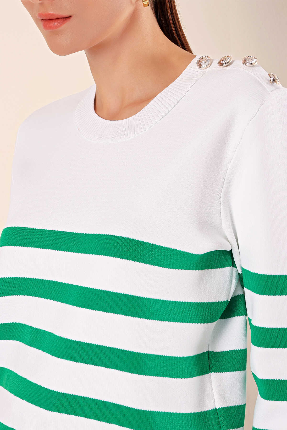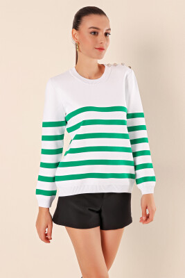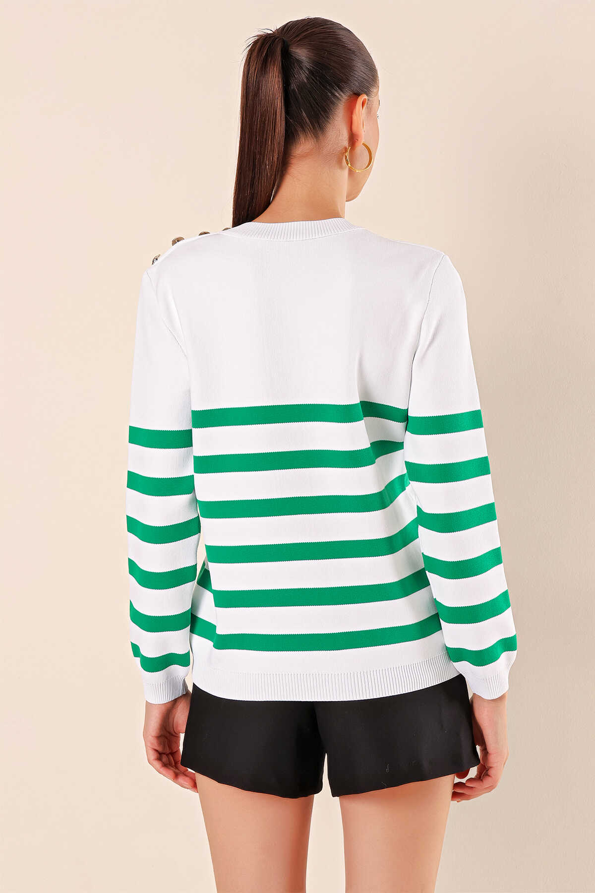 15820 Düğme Detay Çizgili Kazak - C.Yeşil