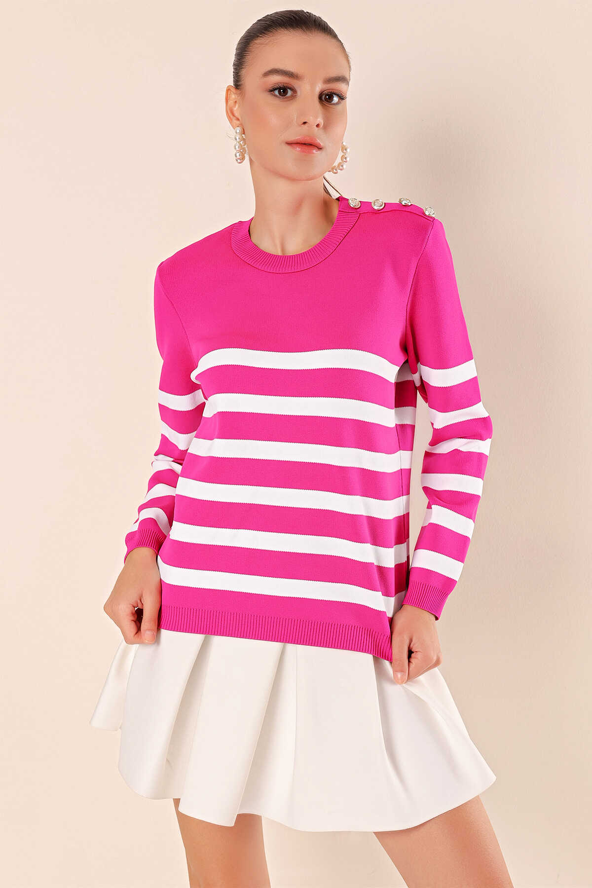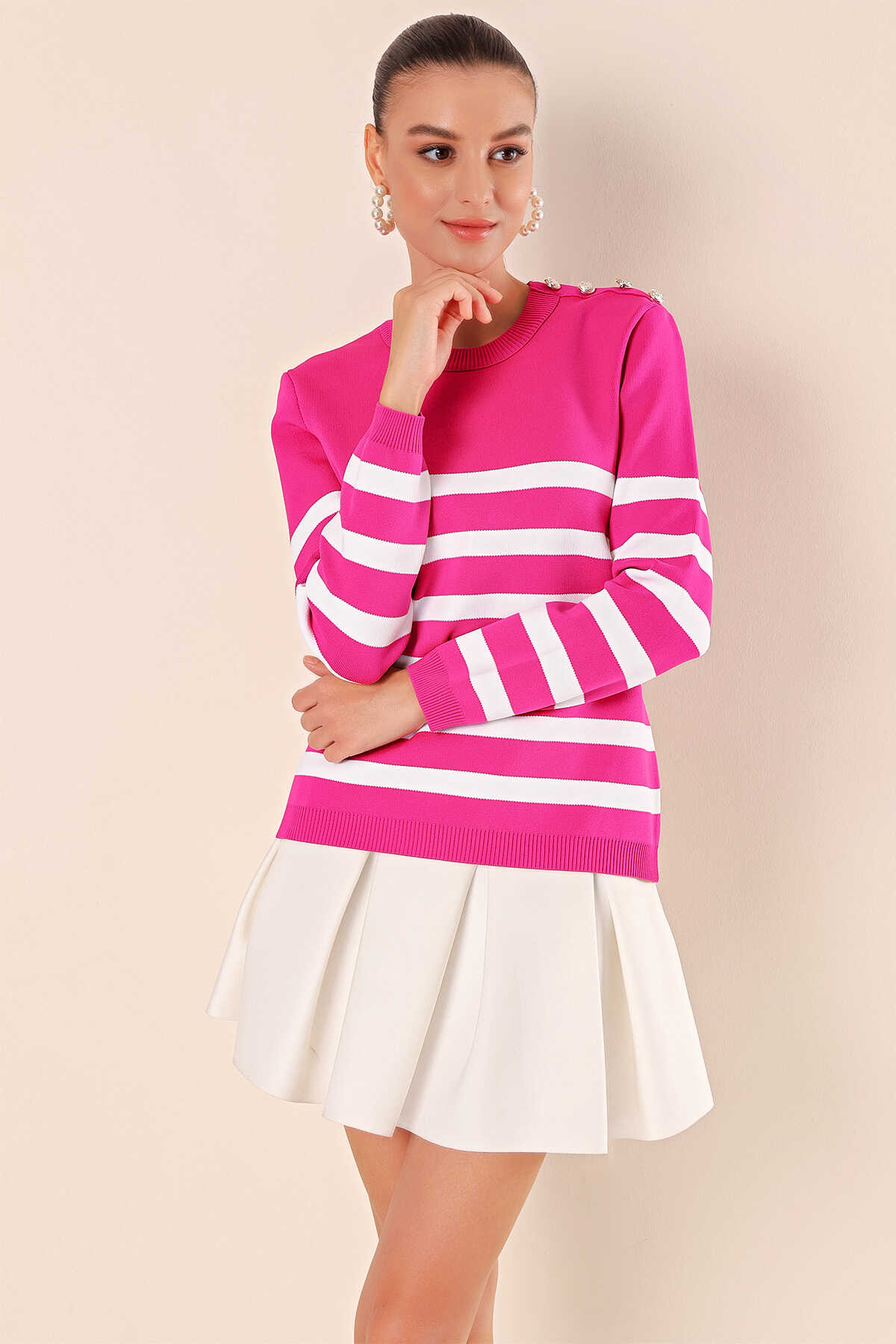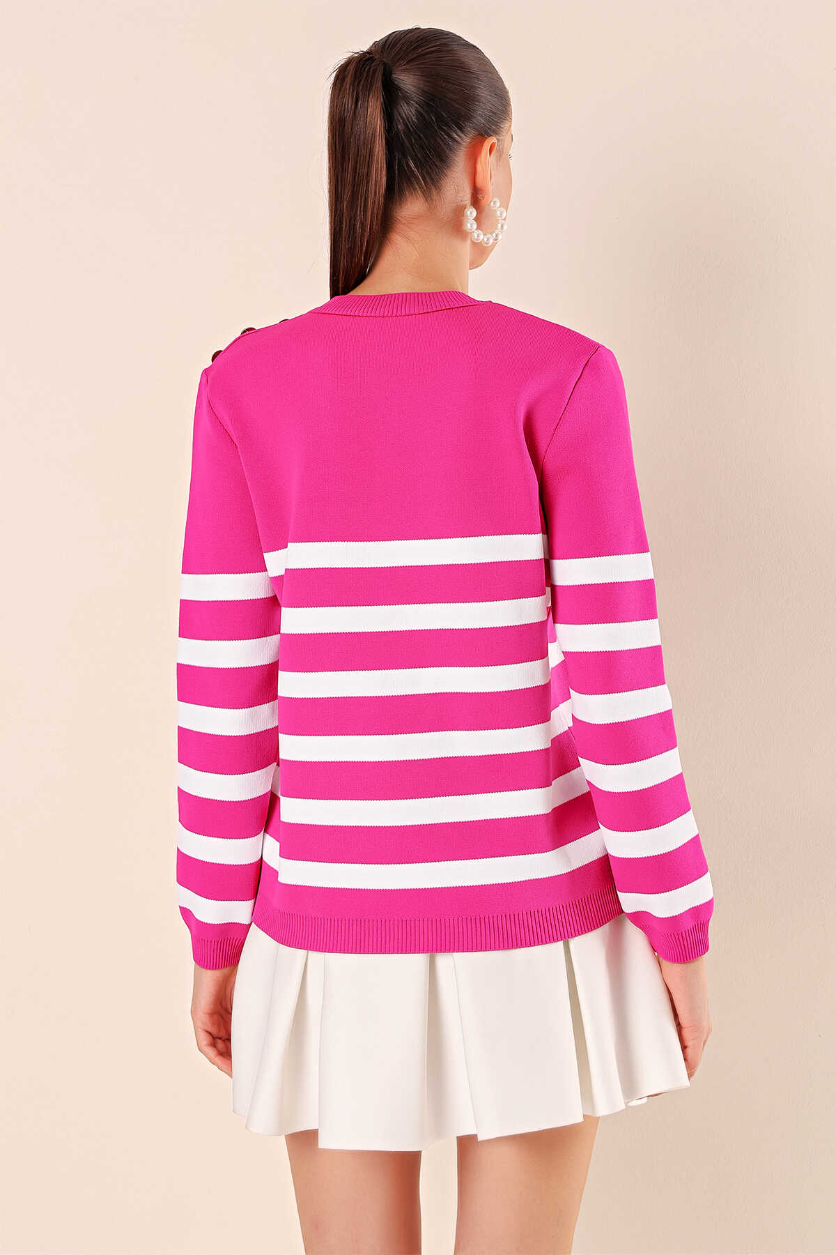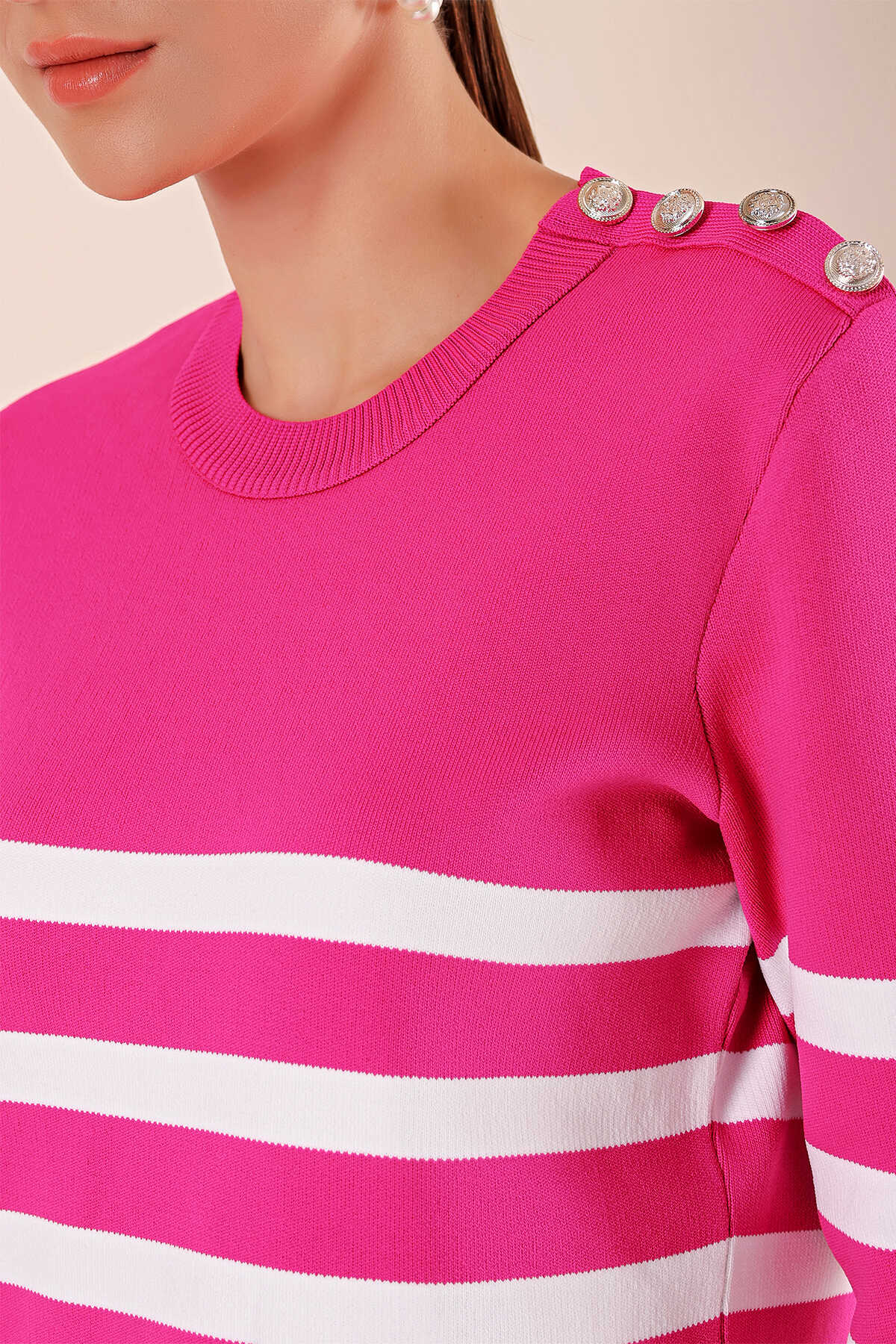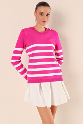 15820 Düğme Detay Çizgili Kazak - Fuşya