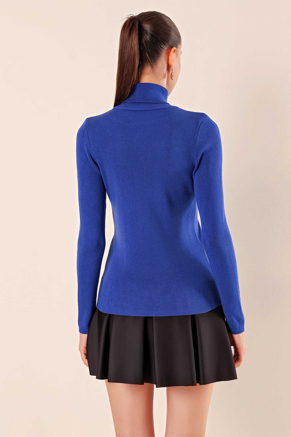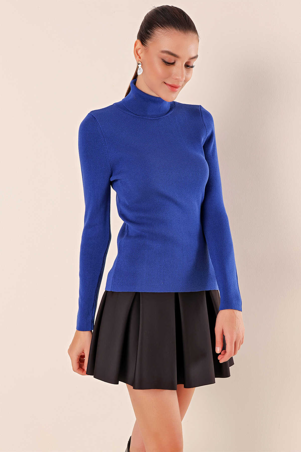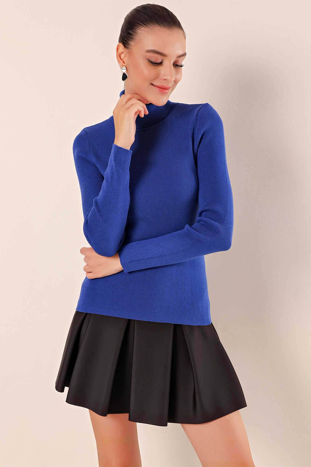 15825 Boğazlı Triko Kazak - Saks - Kombin