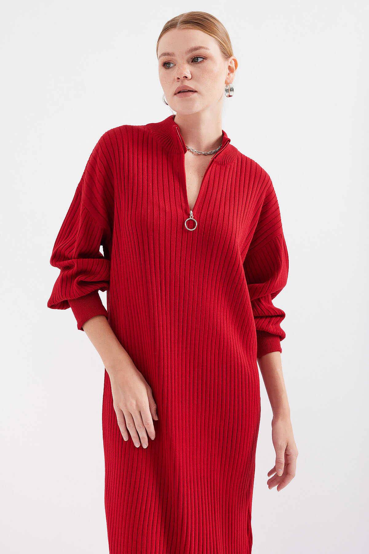 15839 Boydan Triko Elbise - Kırmızı - Kombin