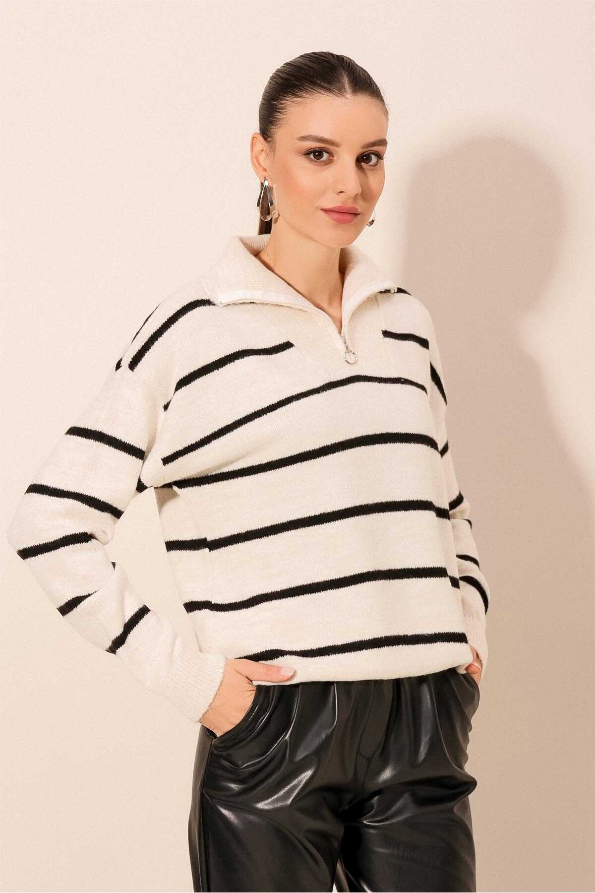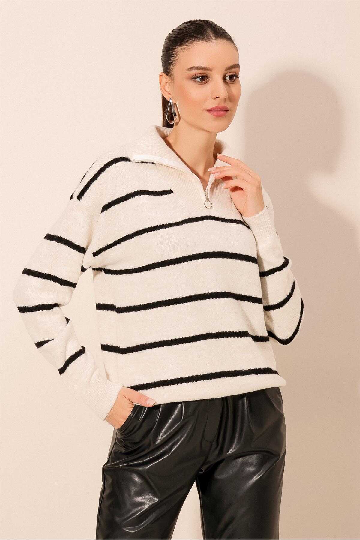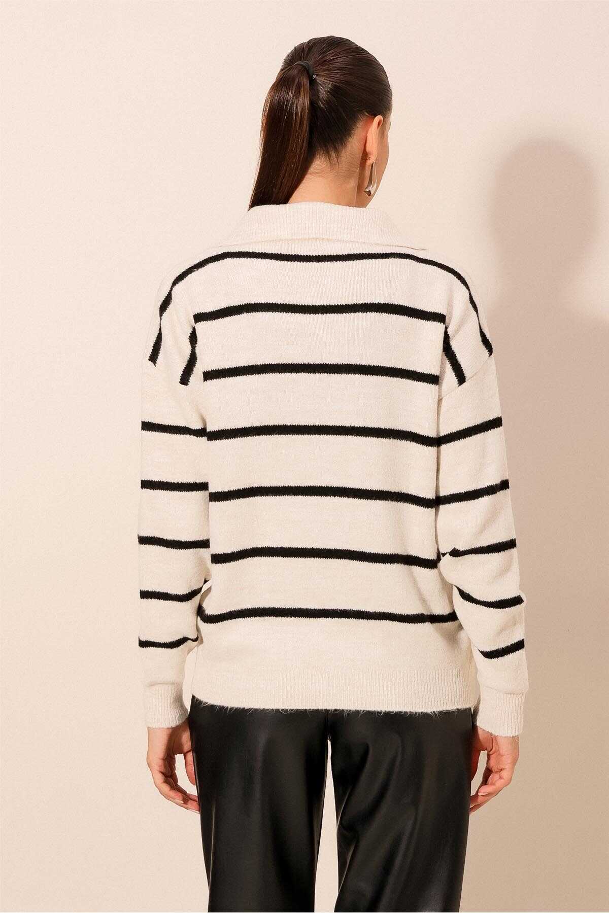 15840 Oversize Çizgili Kazak - Ekru - Kombin