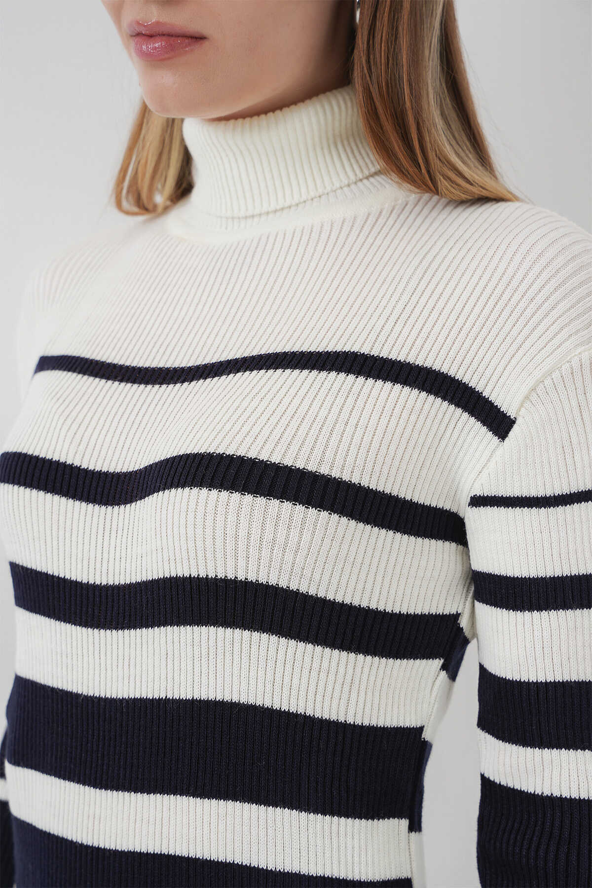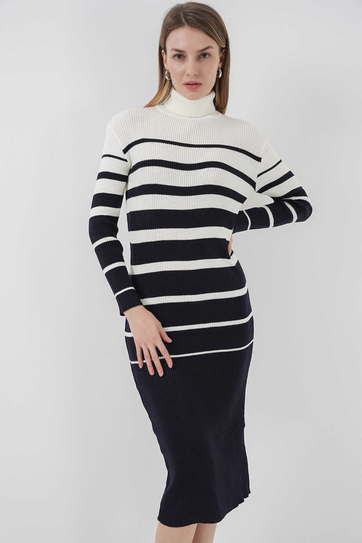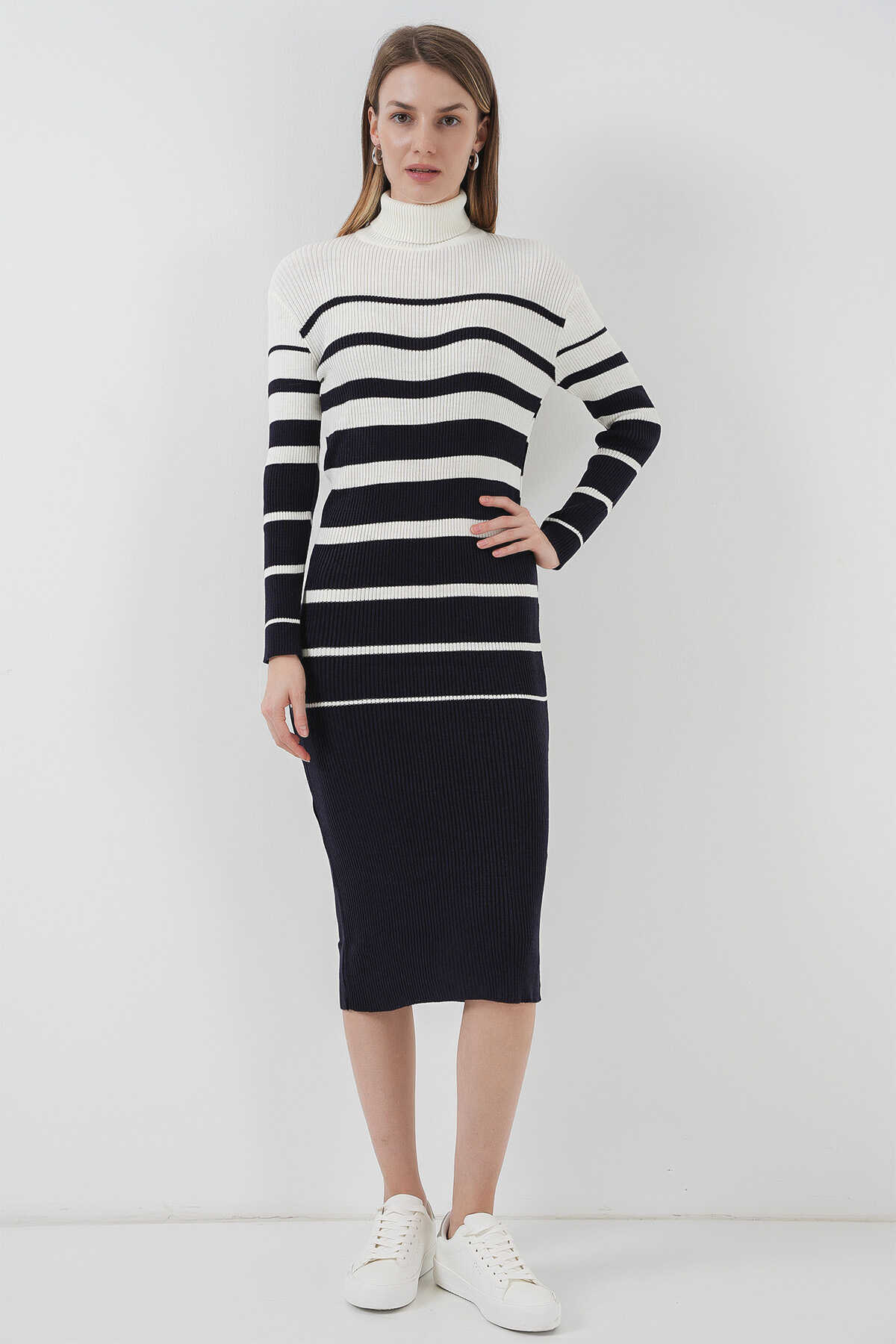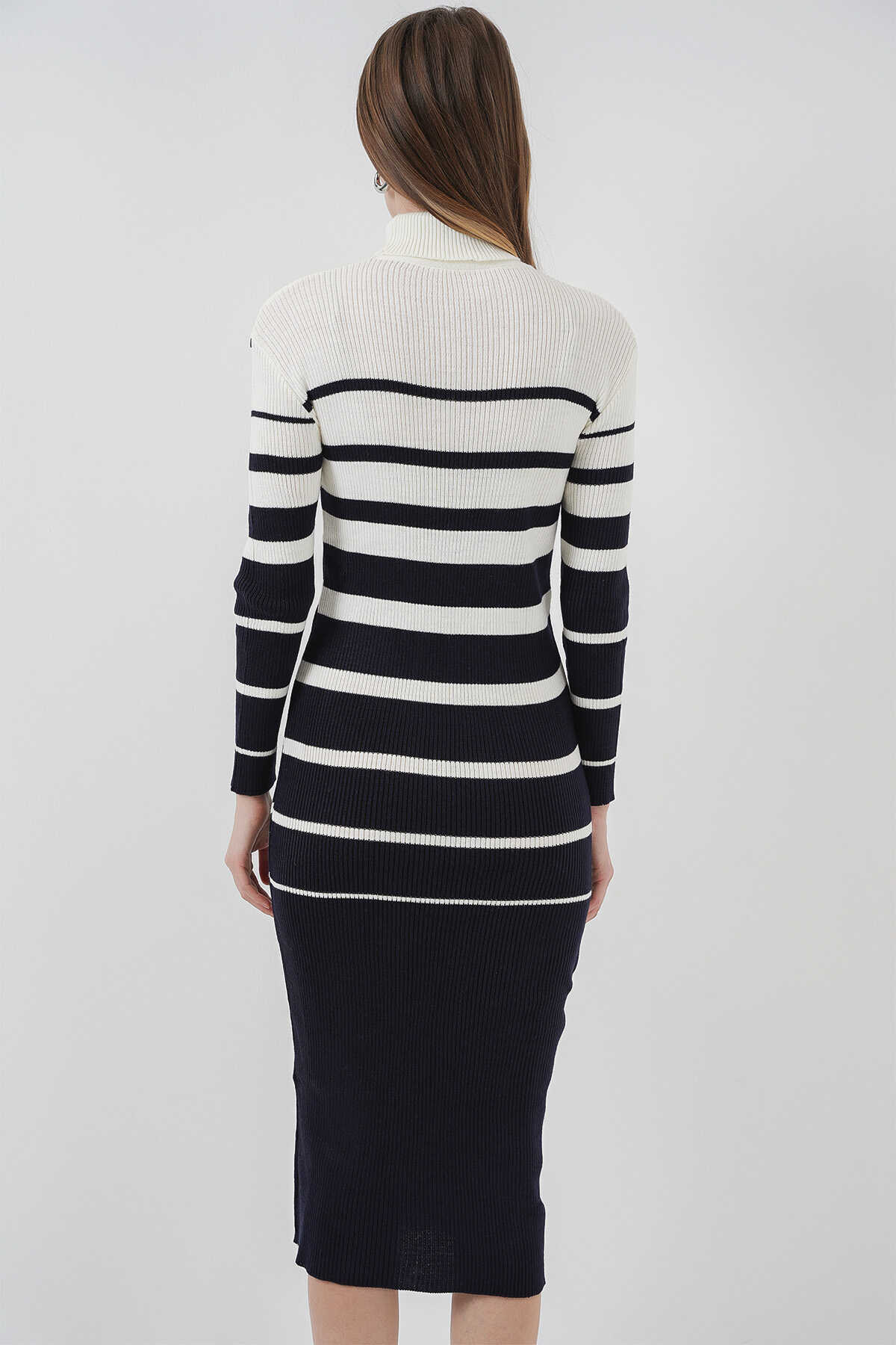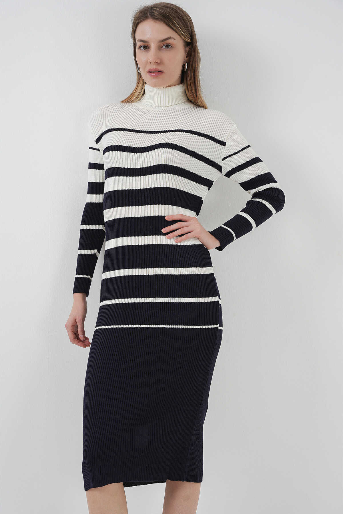 15841 Boğazlı Lacivert Beyaz Triko Elbise - Kombin