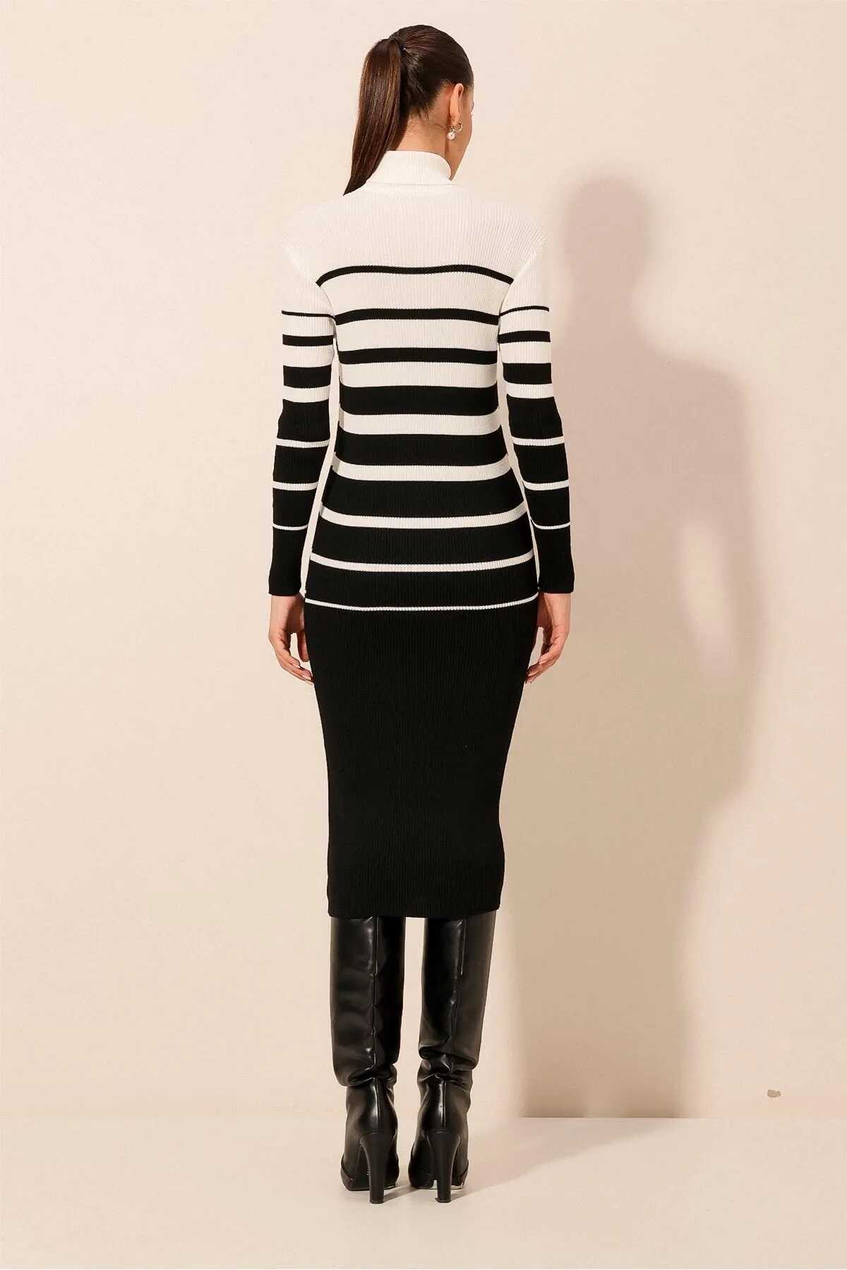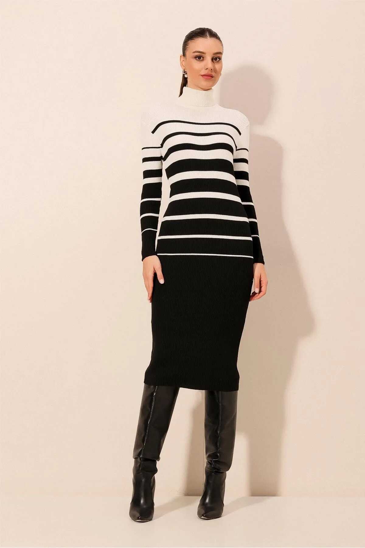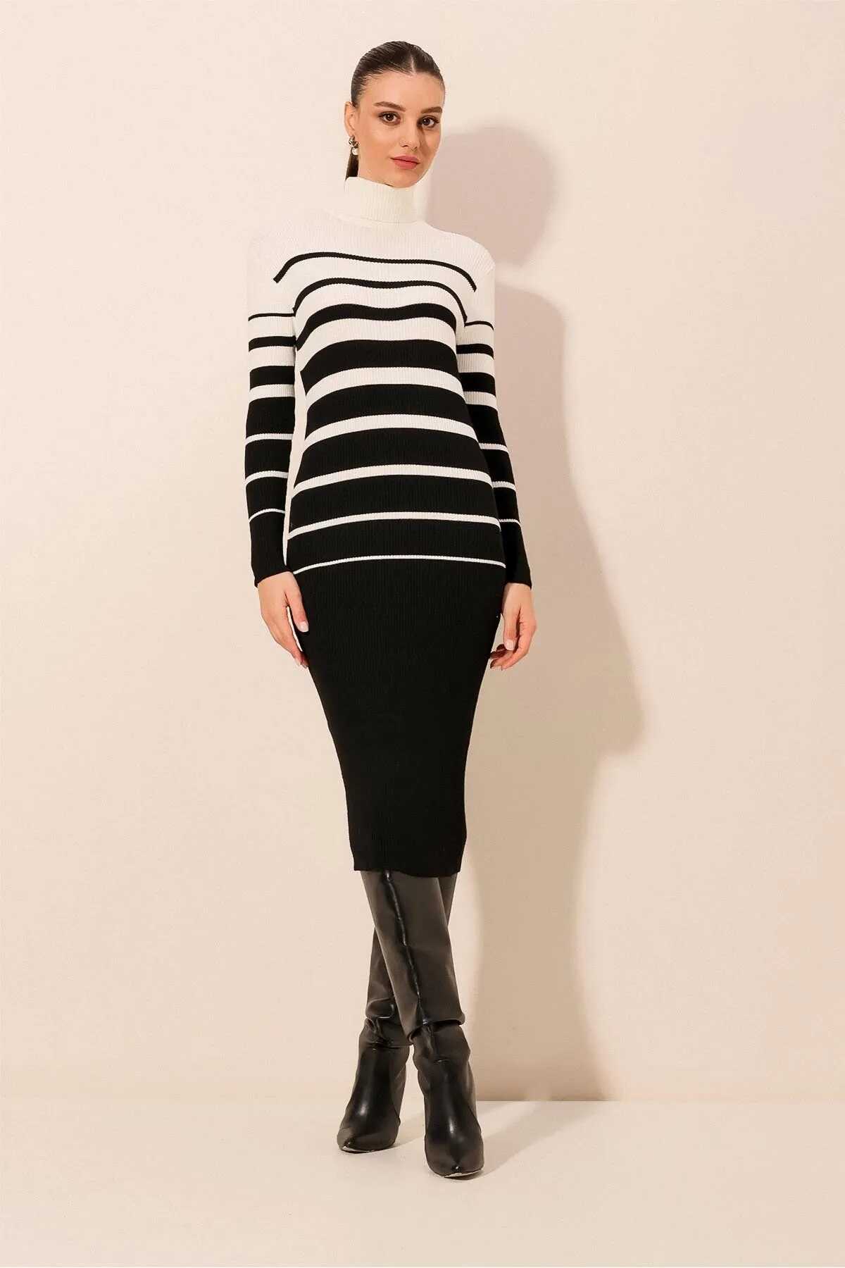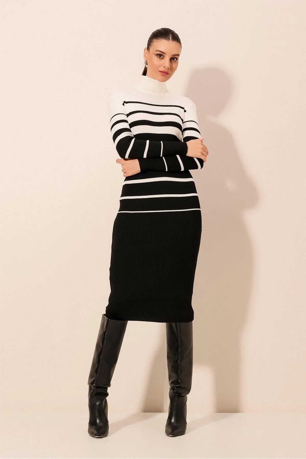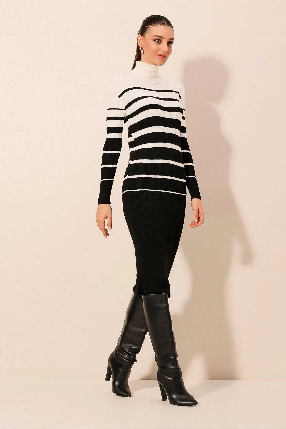 15841 Boğazlı Triko Elbise - Beyaz - Kombin