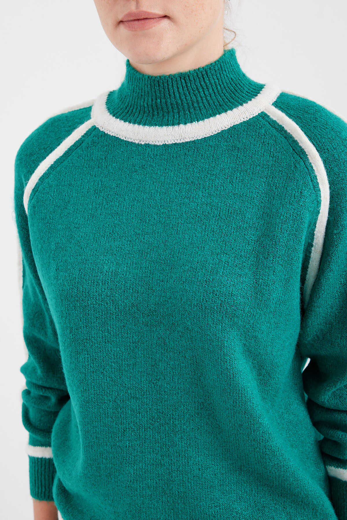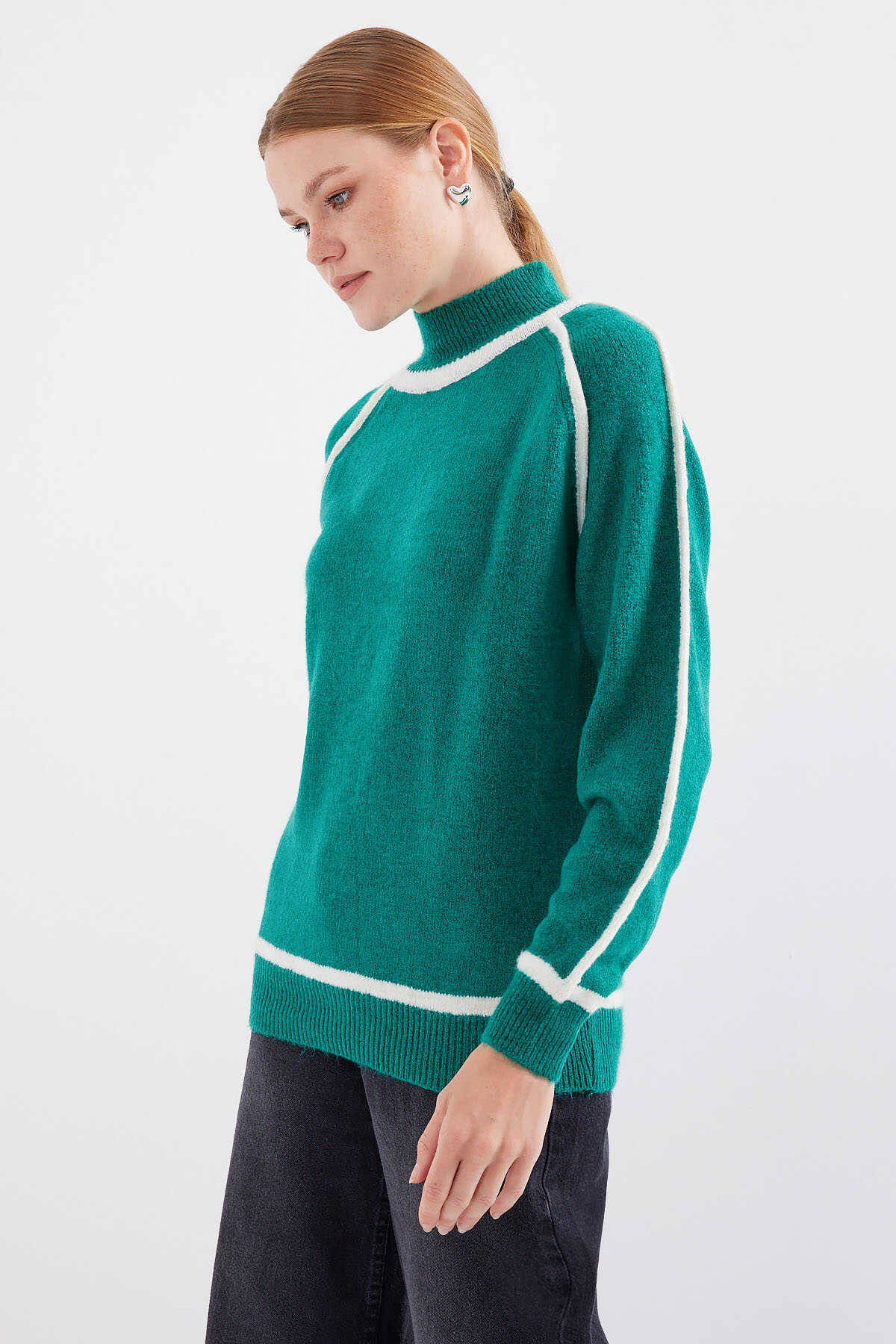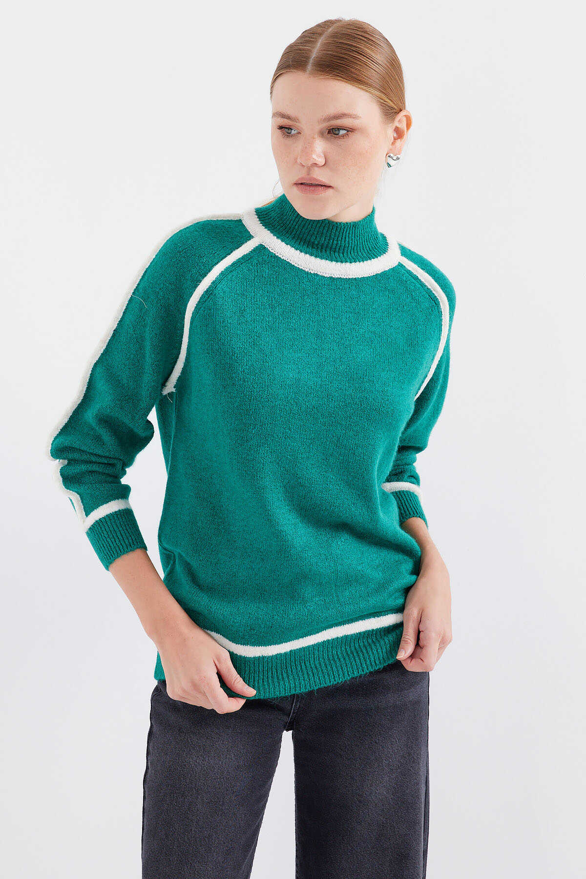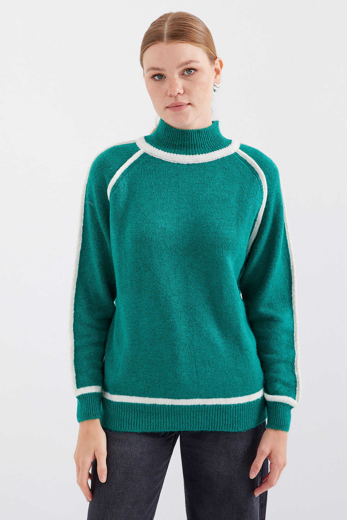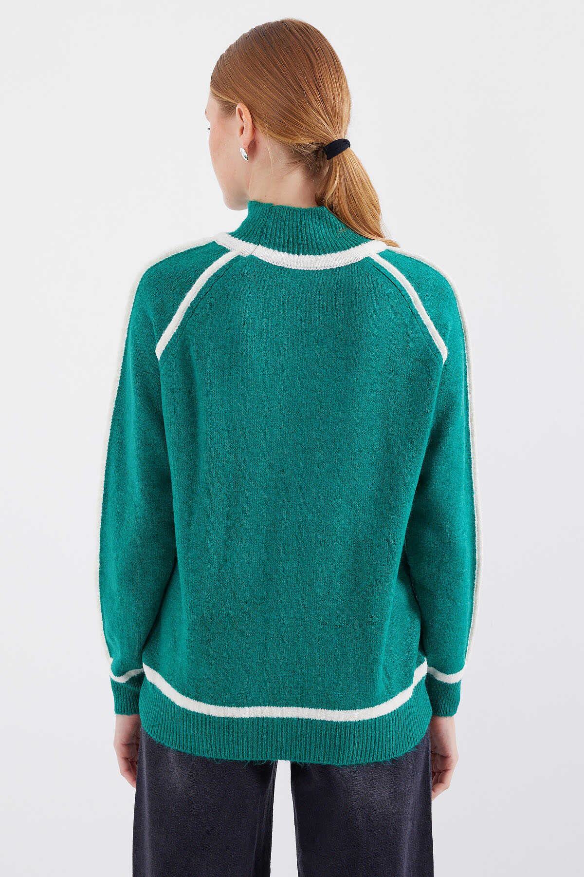 15879 Çizgili Oversize Triko Kazak - Zümrüt Yeşili - Kombin