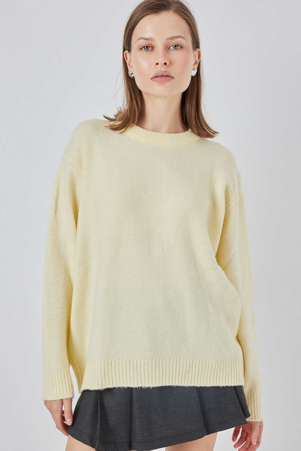 15895 Kadın Oversize Triko Kazak - A.Sarı - Kombin