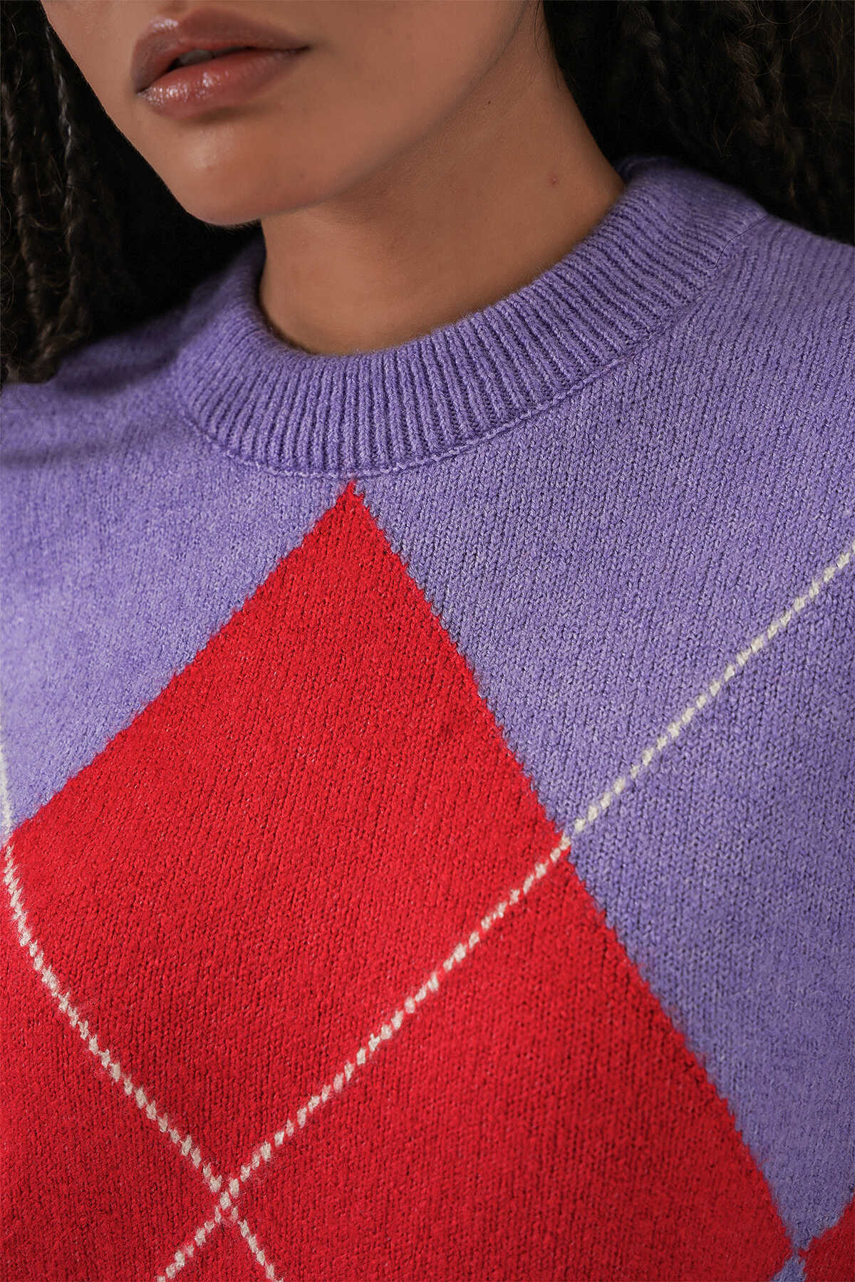 15895 Baklava Desenli Oversize Triko Kazak - B.Lila