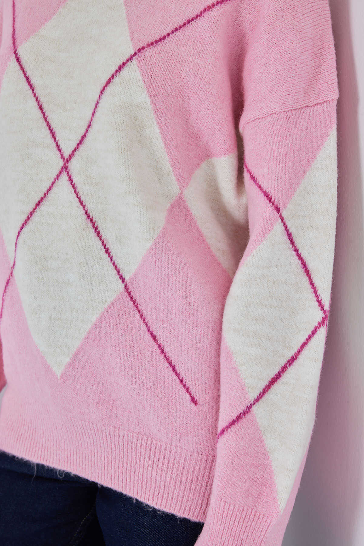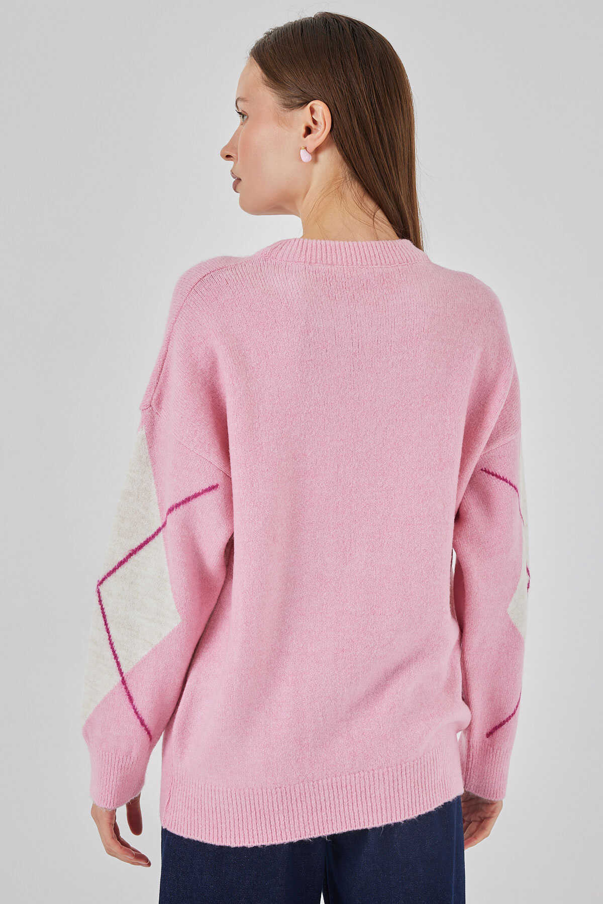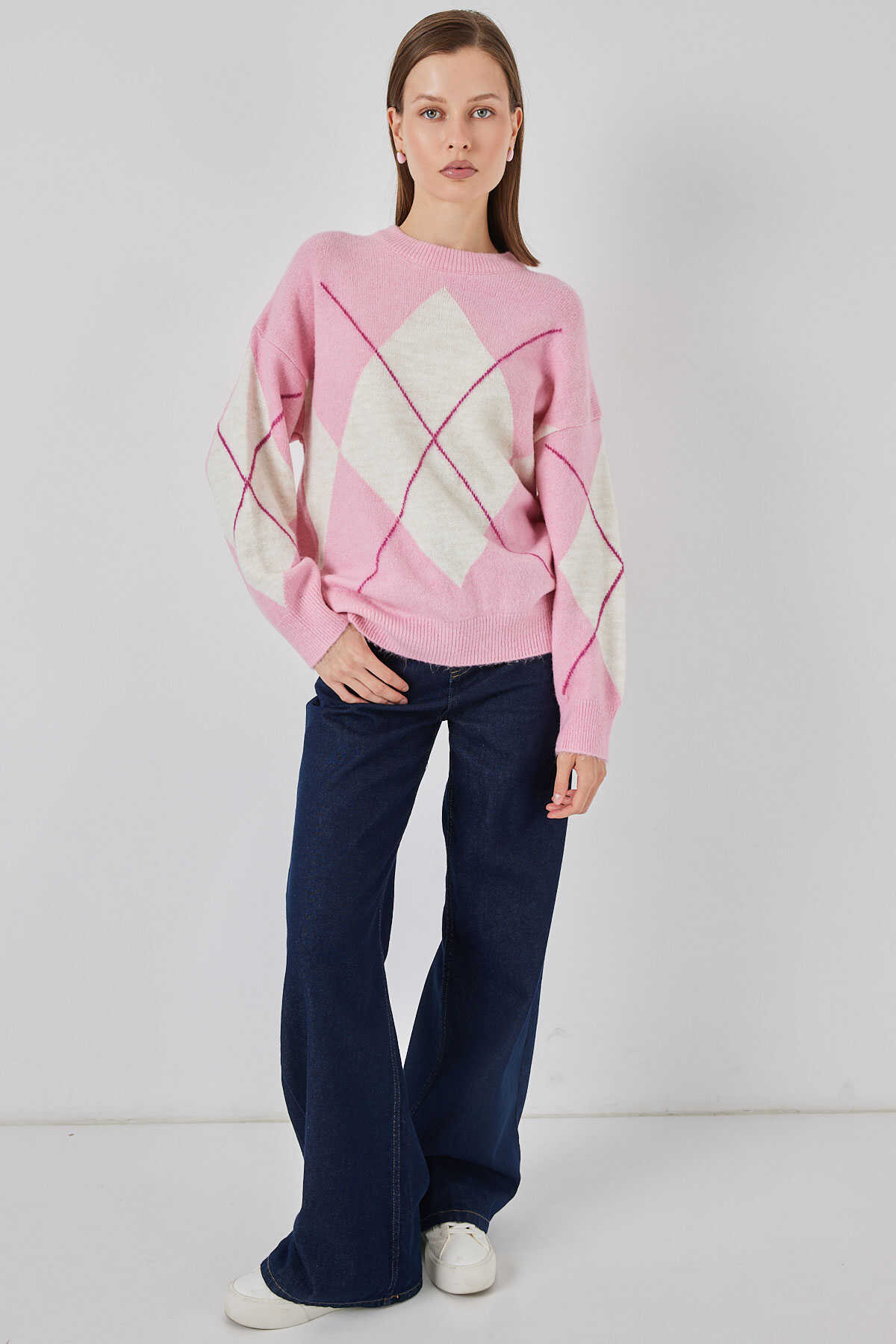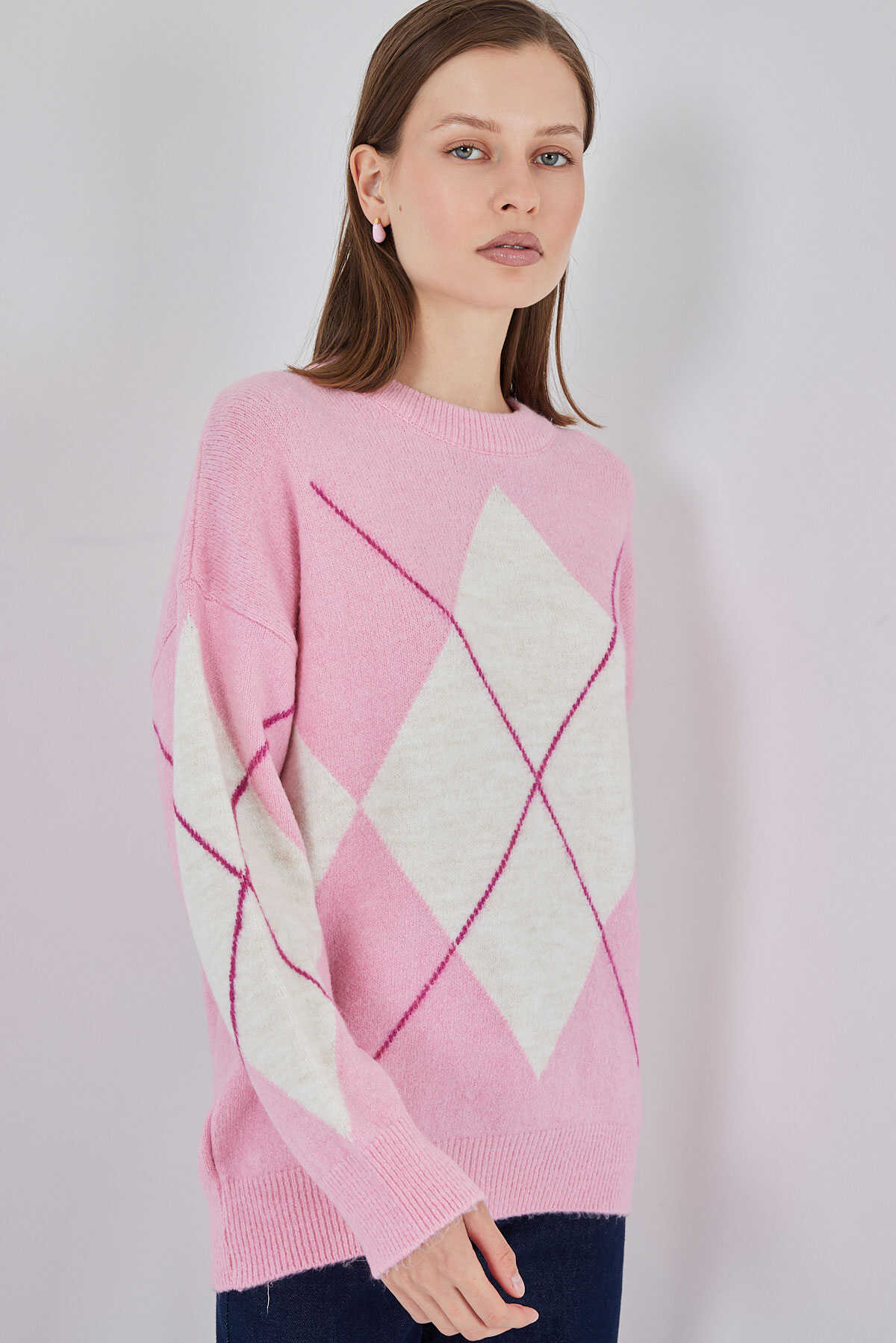 15895 Baklava Desenli Oversize Triko Kazak - C. Pembe
