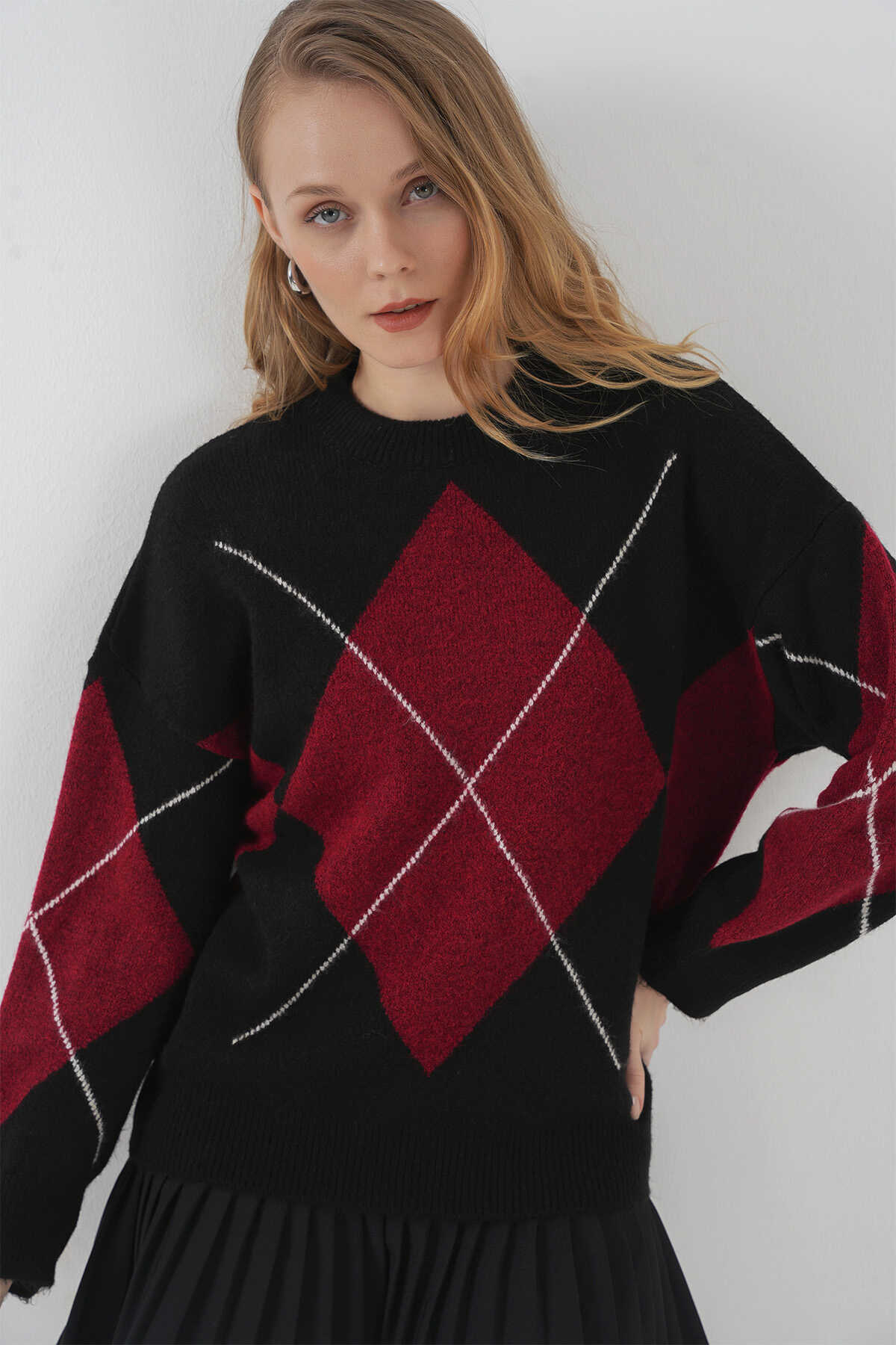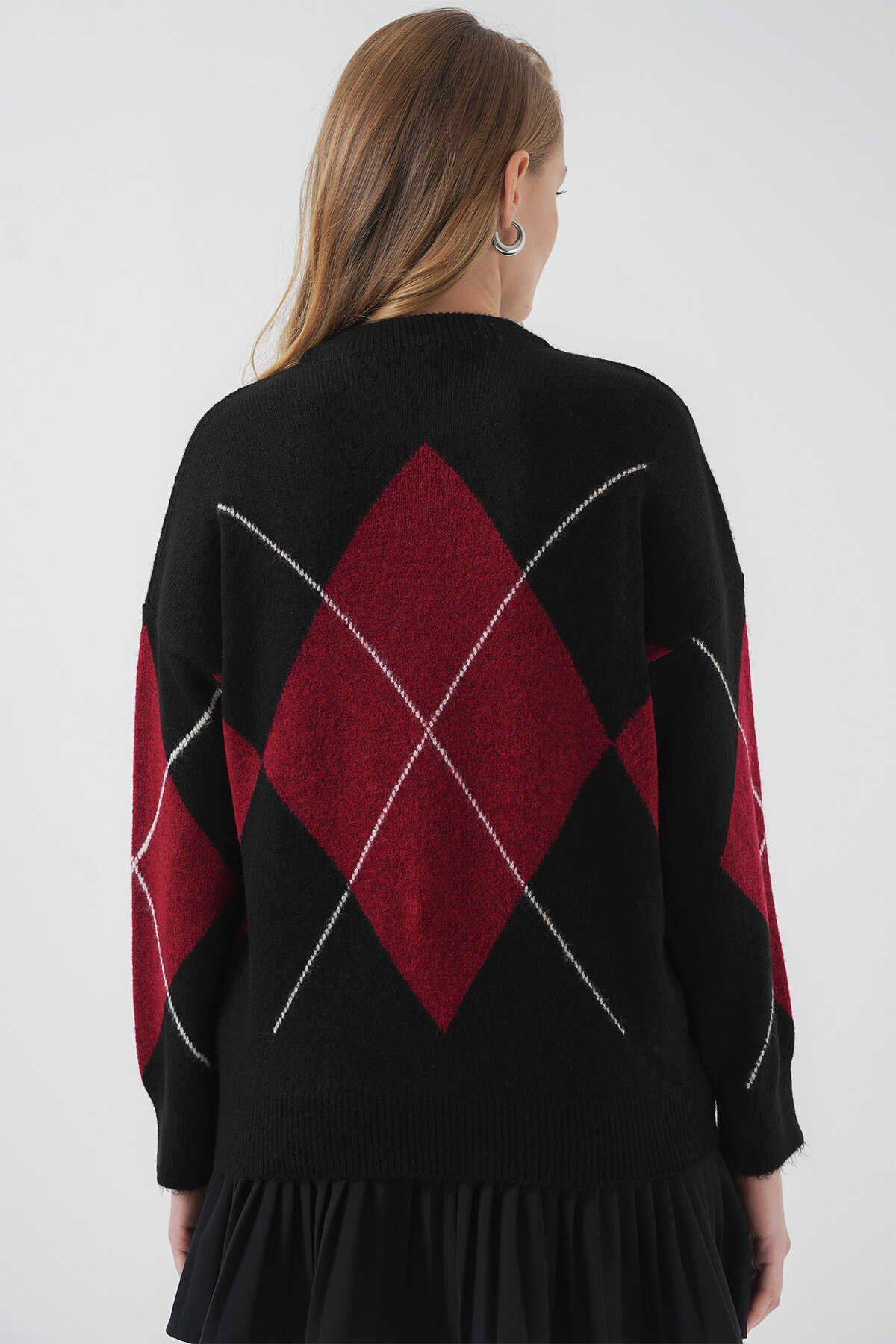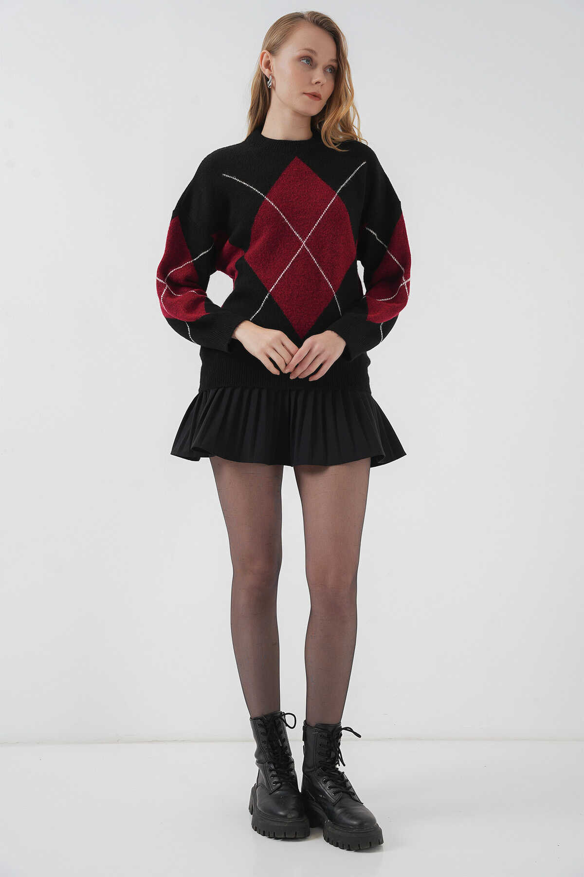 15895 Baklava Desenli Oversize Triko Kazak - D. Siyah - Kombin
