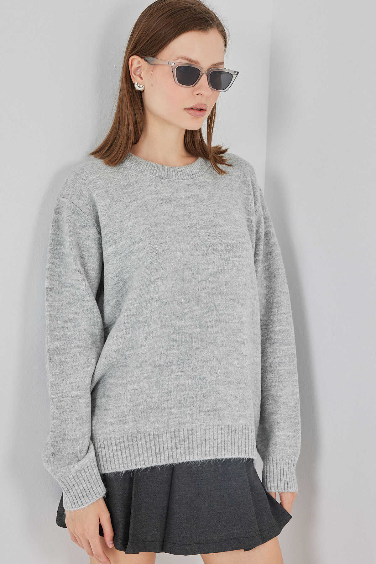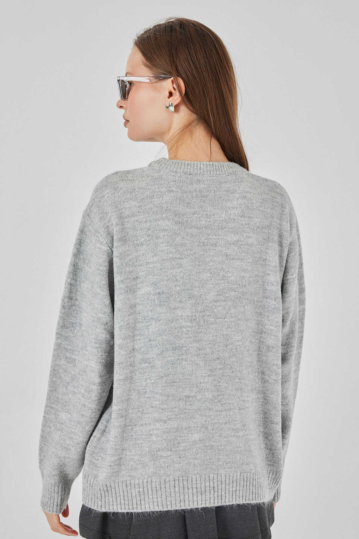 15895 Baklava Desenli Oversize Triko Kazak - Düz Gri