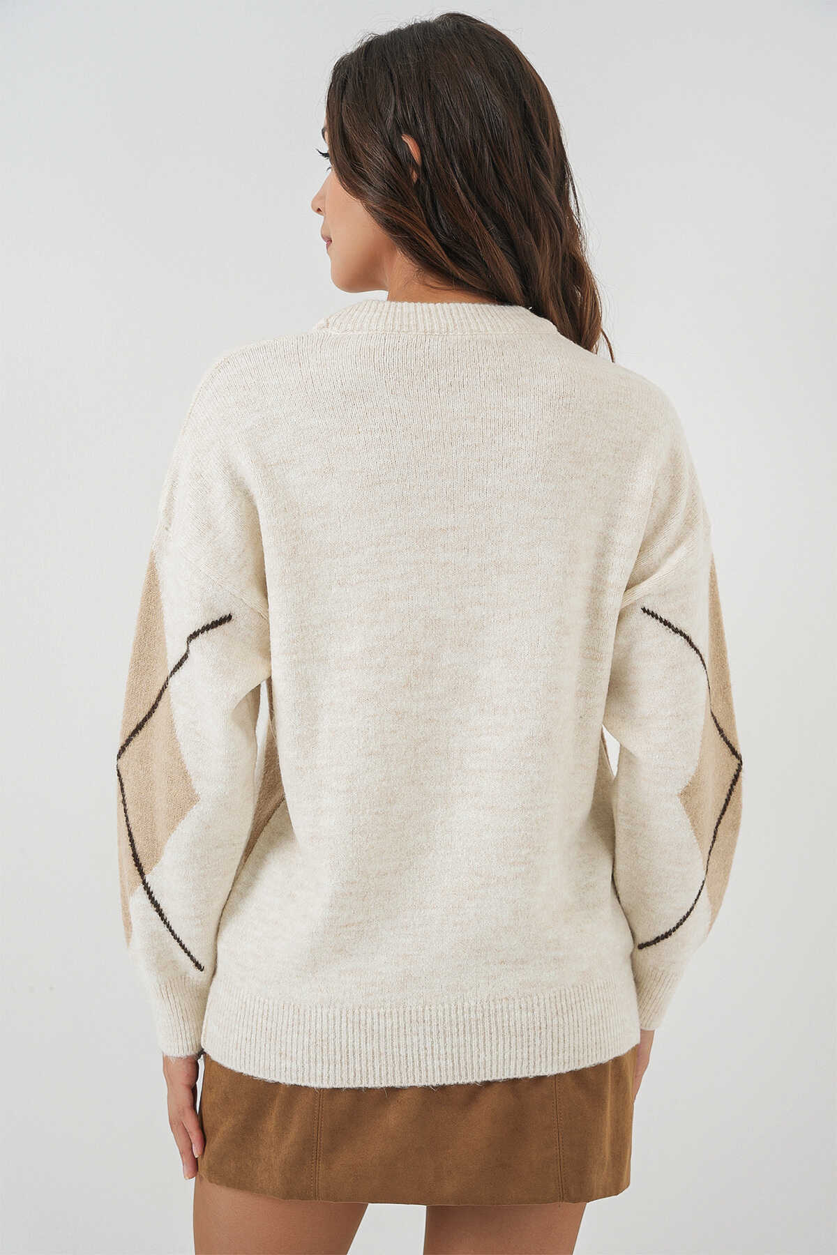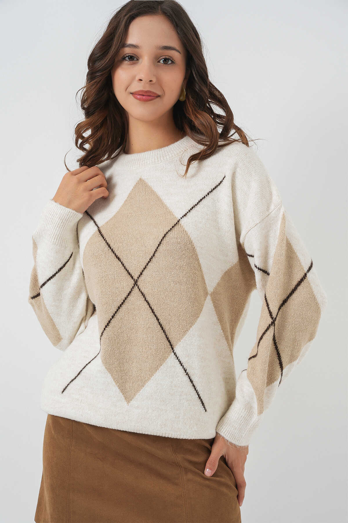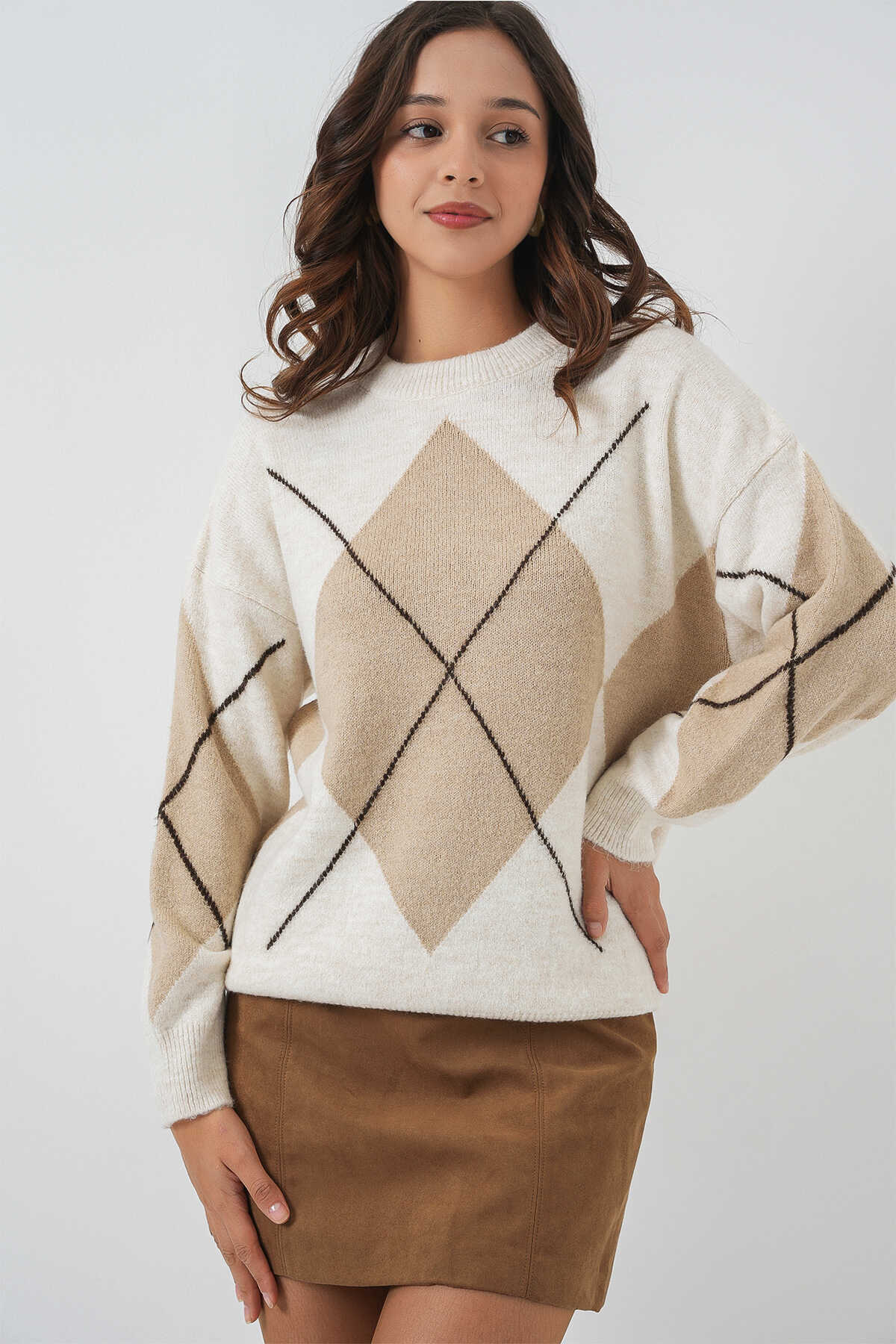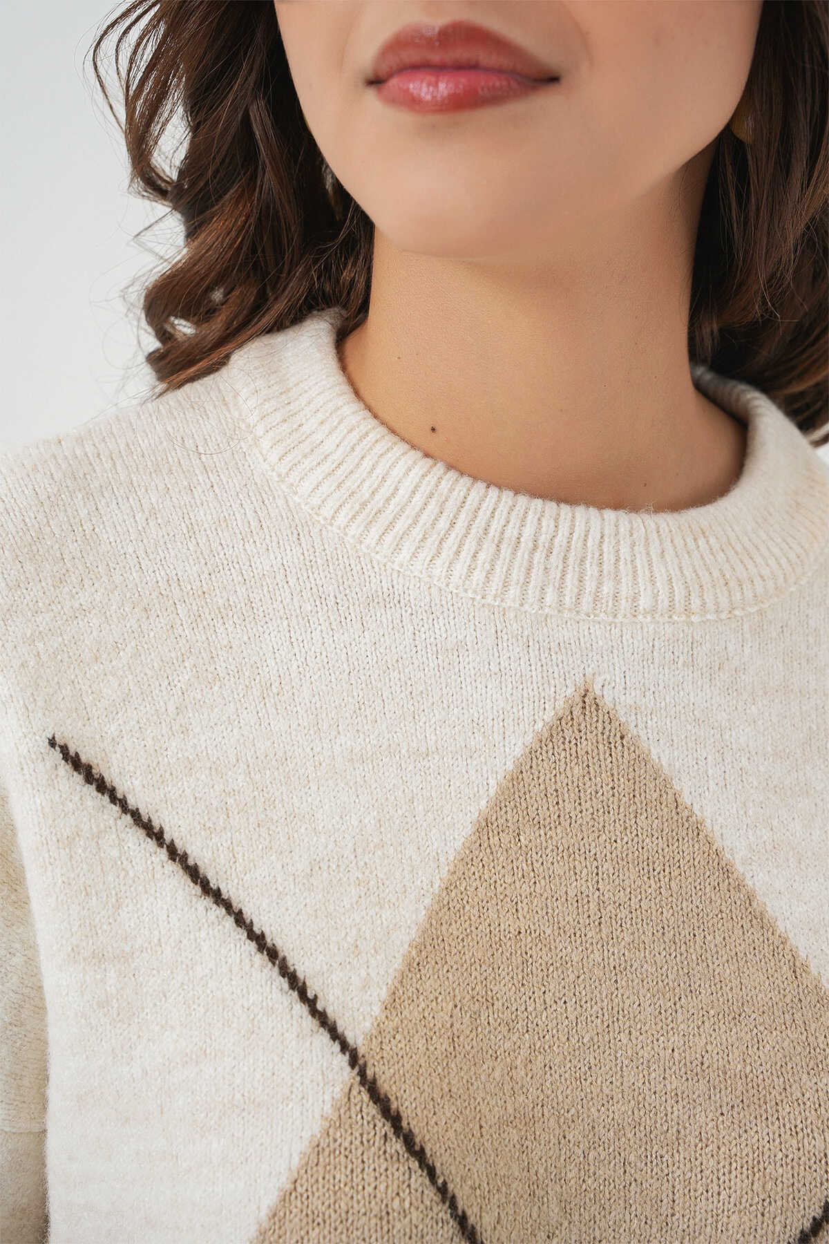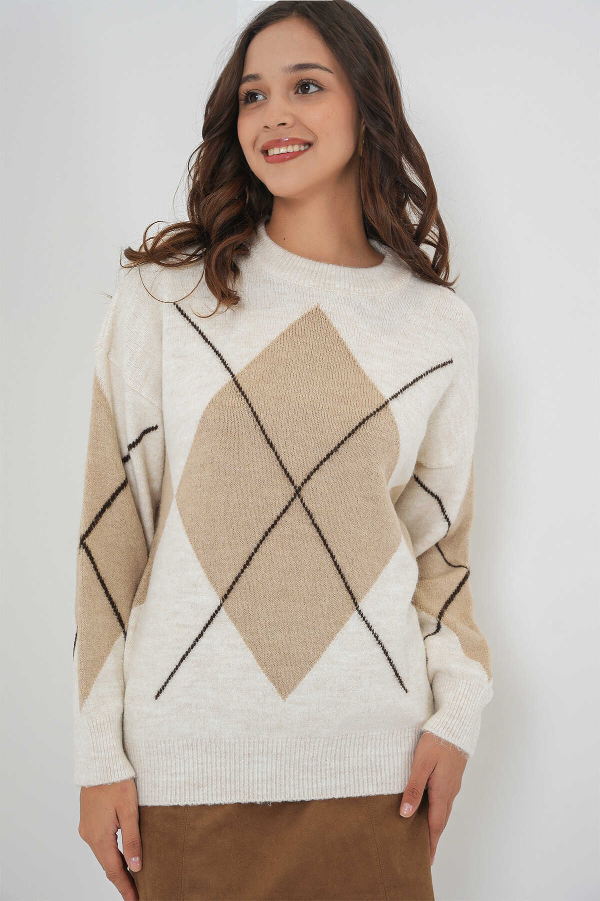 15895 Baklava Desenli Oversize Triko Kazak - Ekru