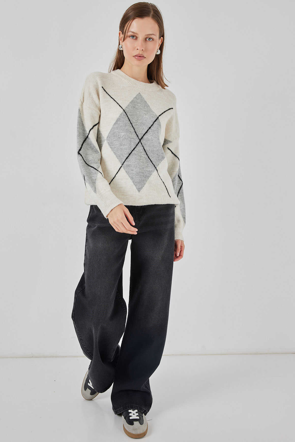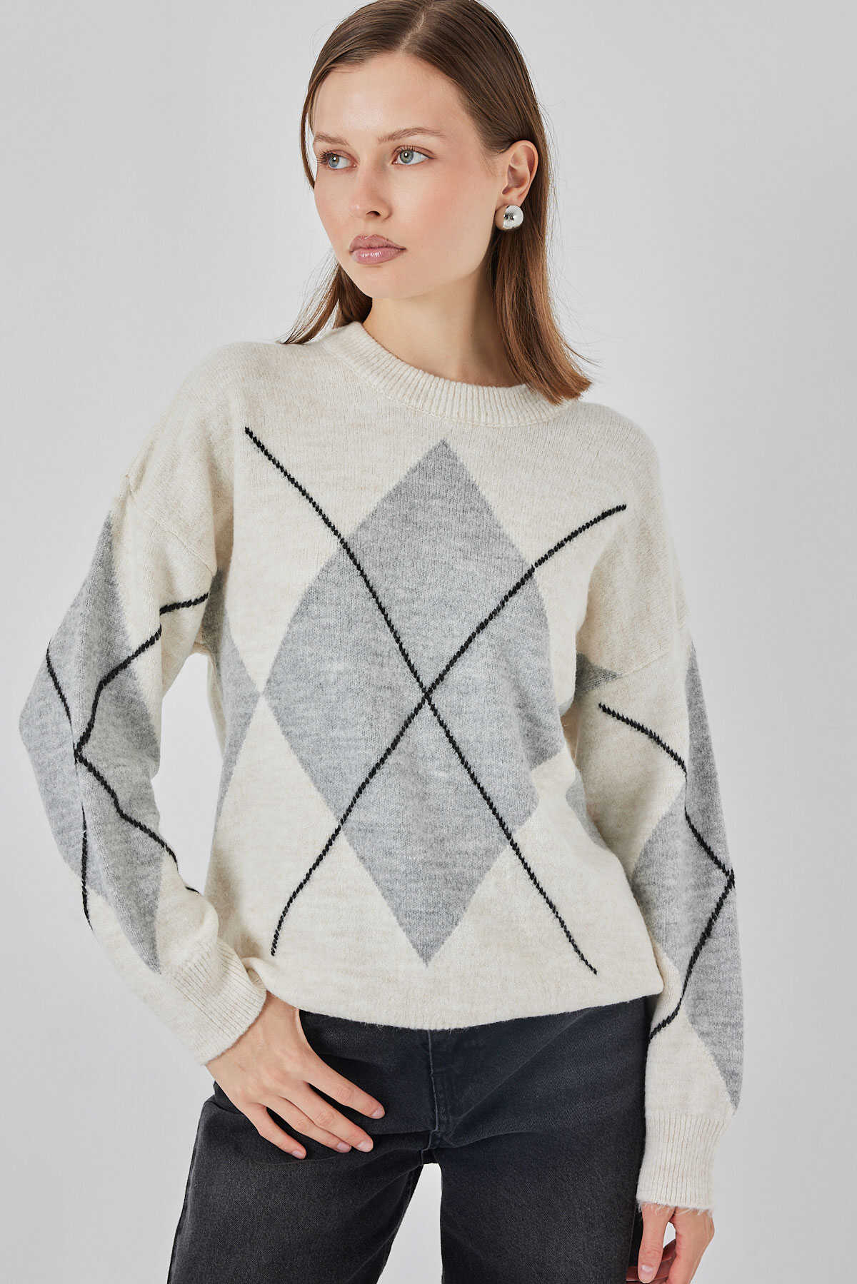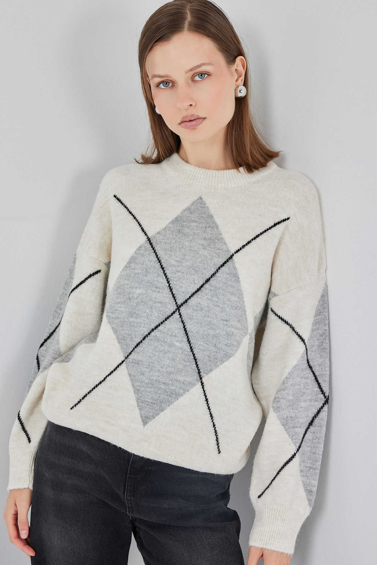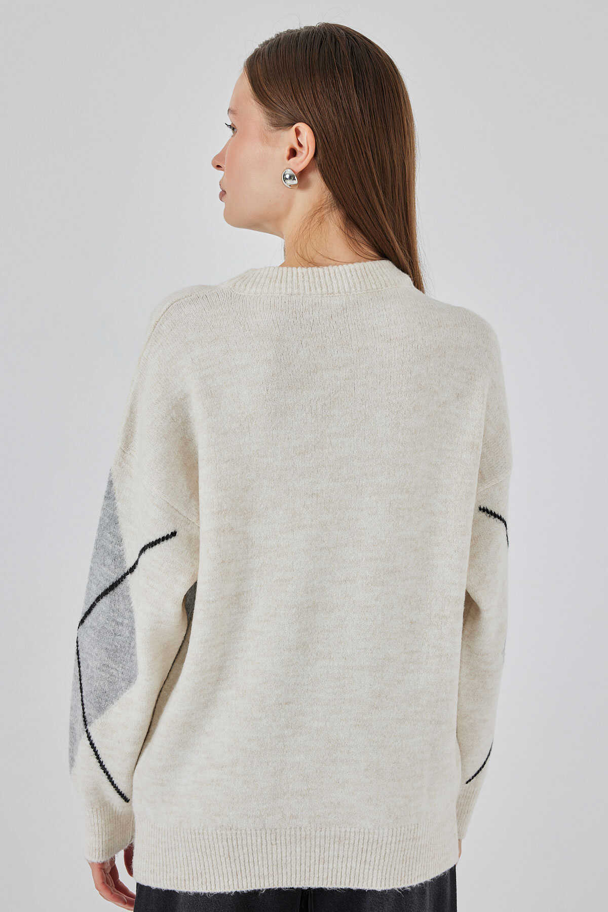 15895 Baklava Desenli Oversize Triko Kazak - M. Krem
