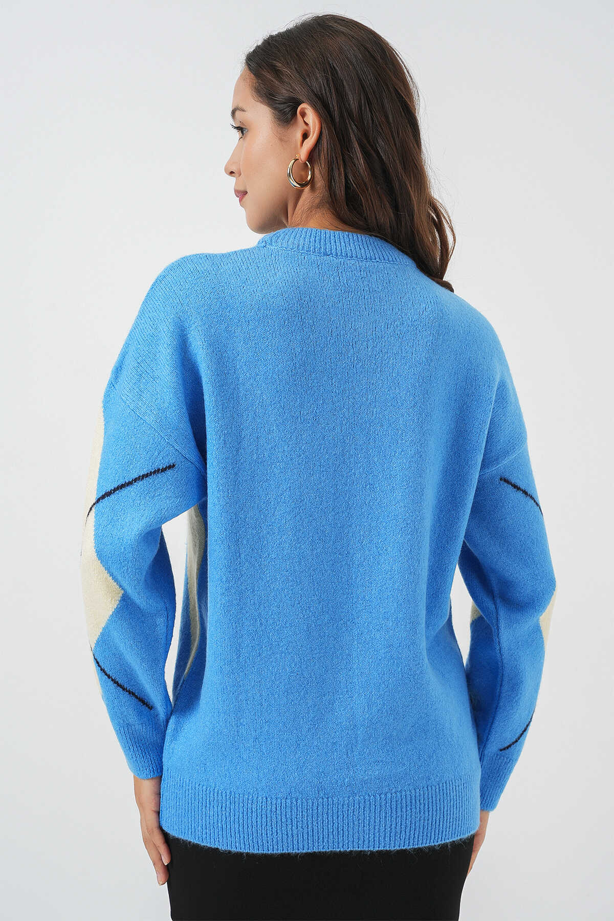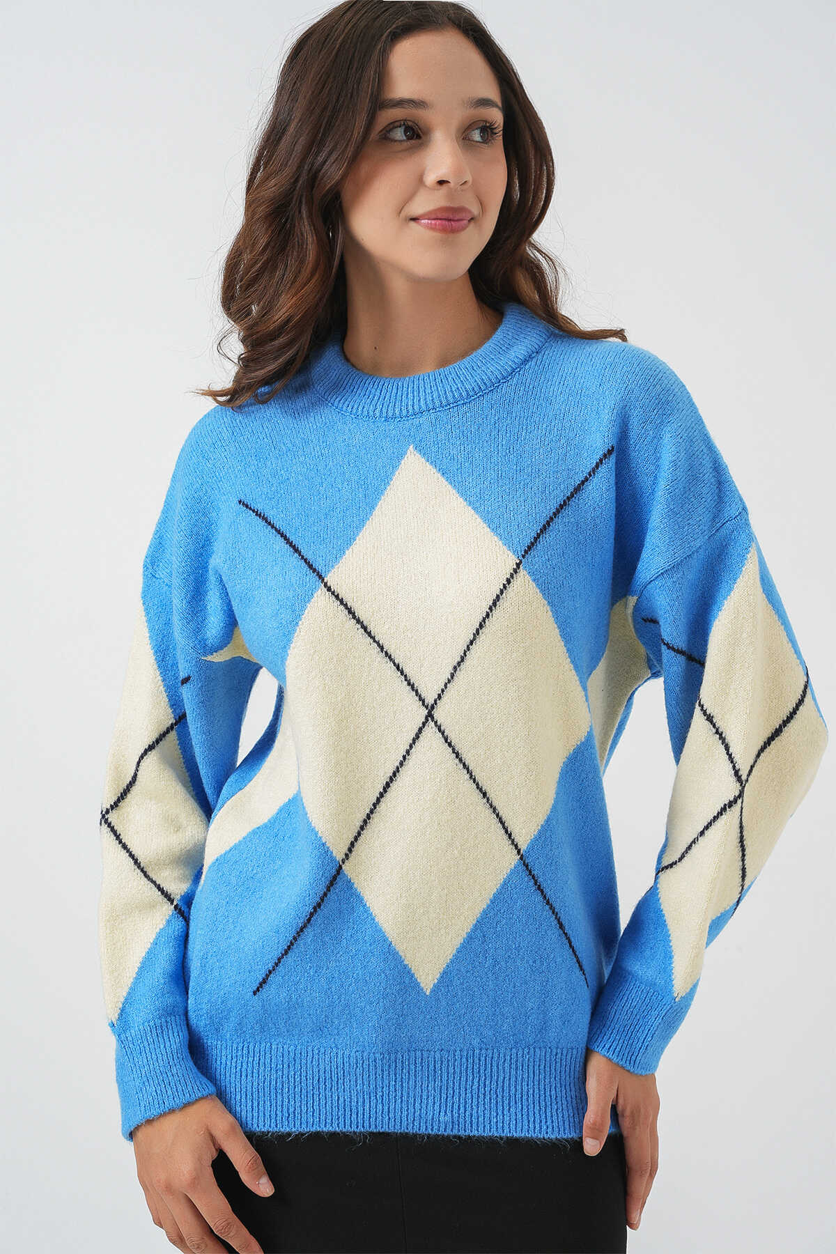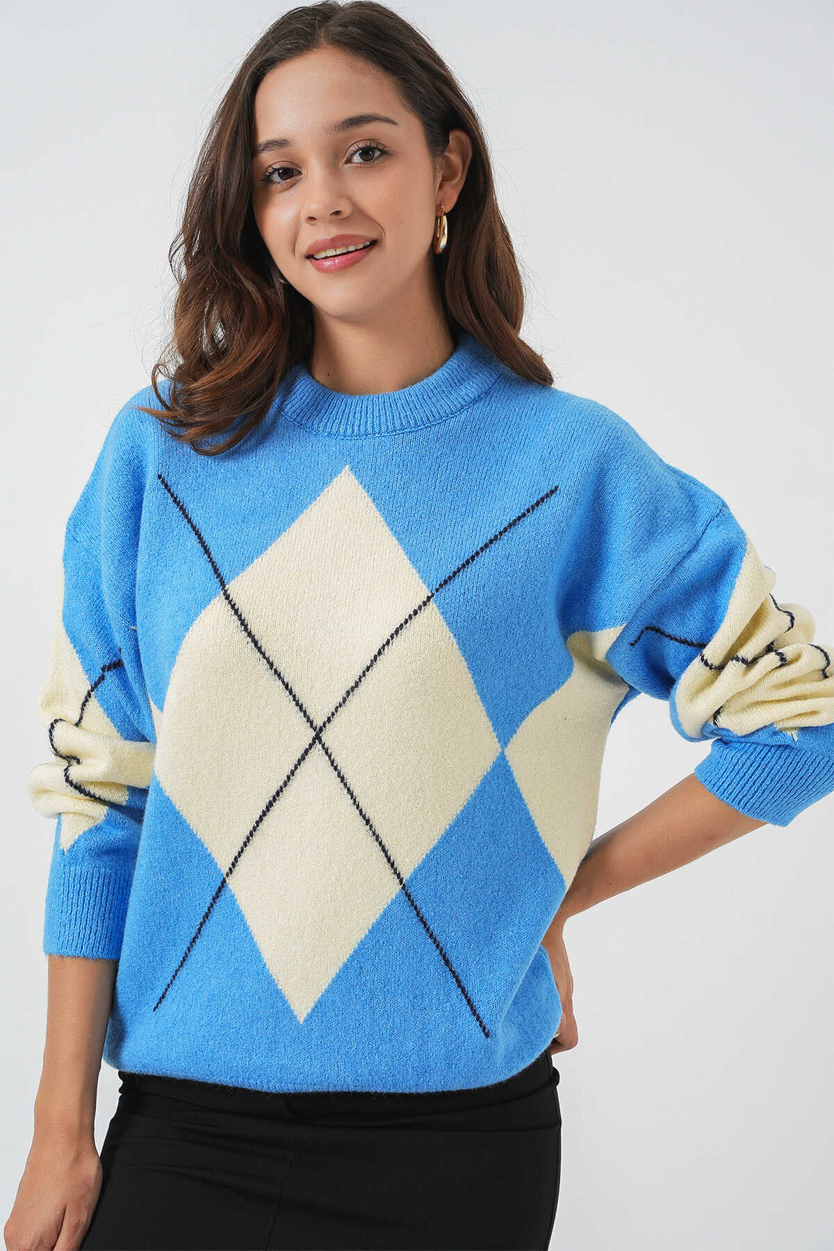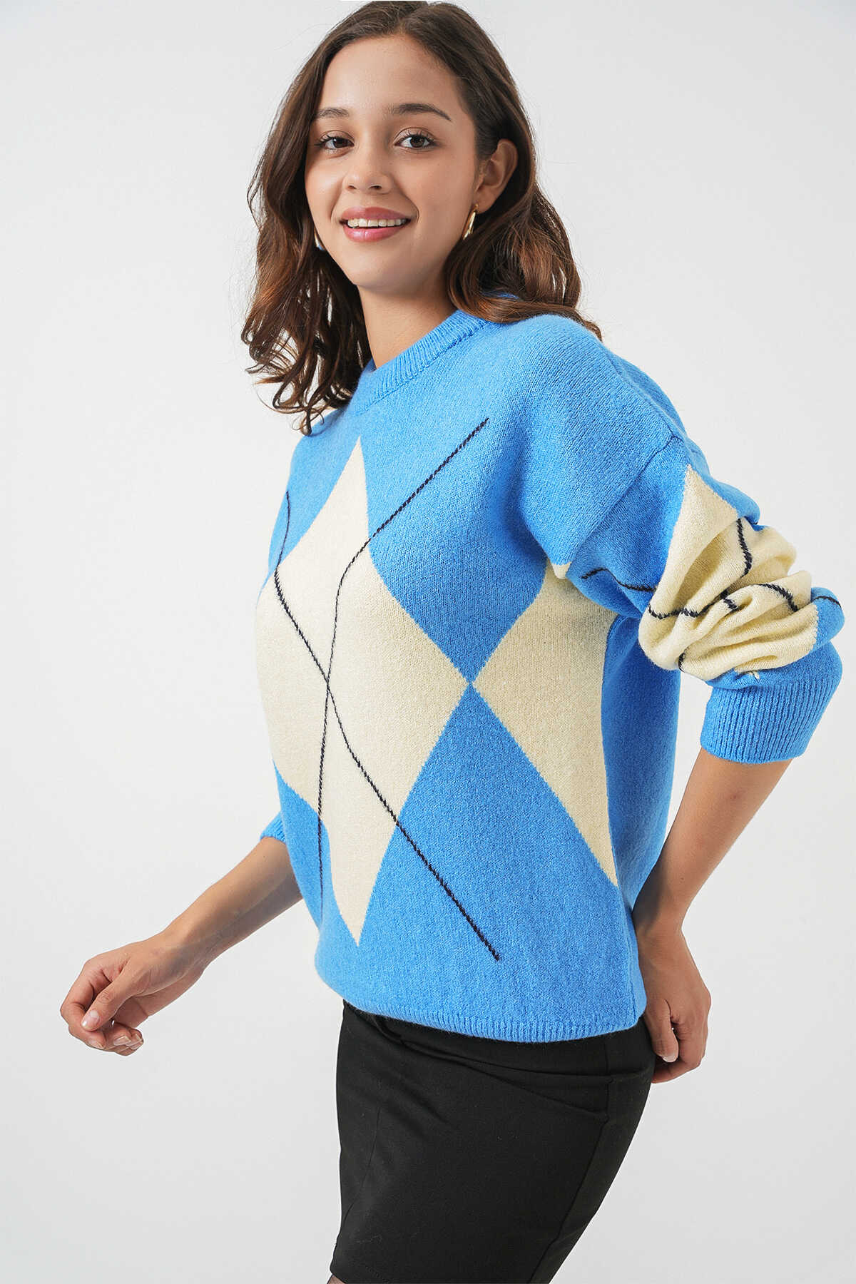 15895 Baklava Desenli Oversize Triko Kazak - Mavi - Kombin