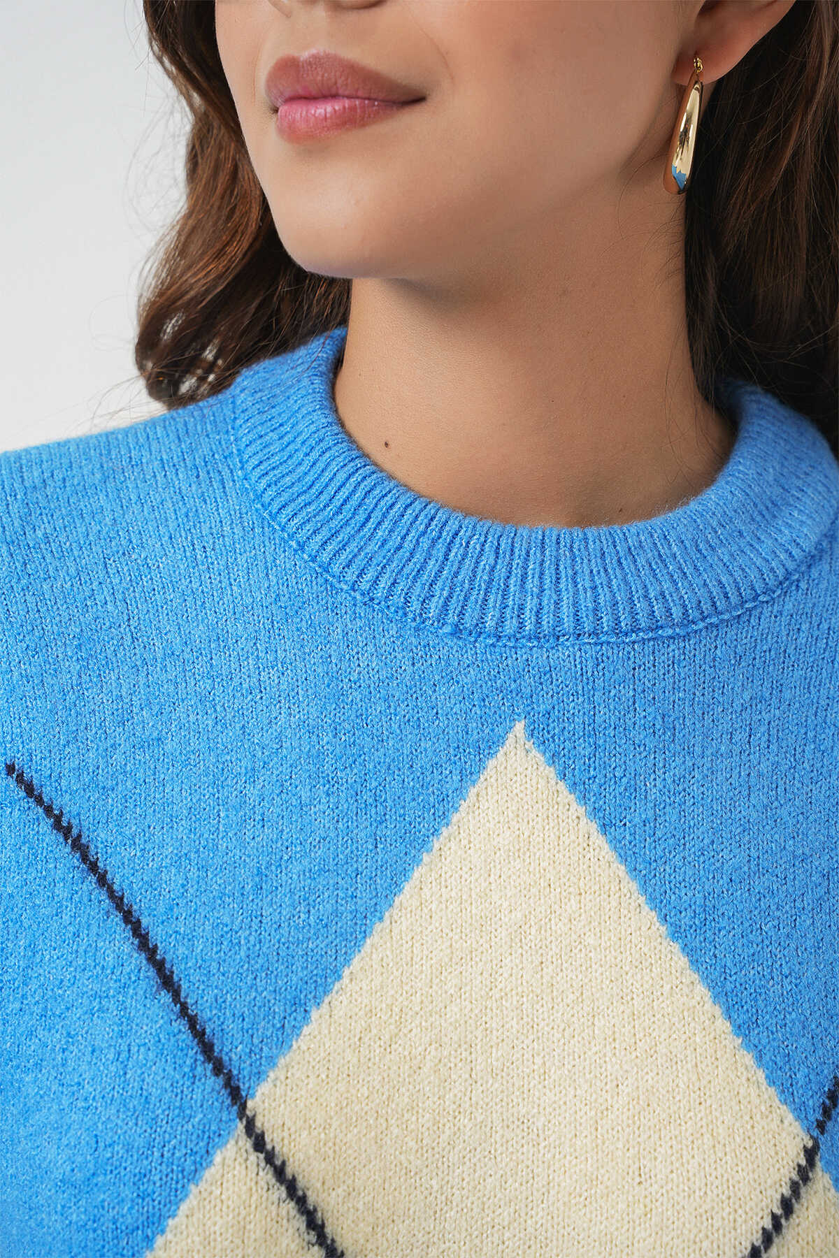 15895 Baklava Desenli Oversize Triko Kazak - Mavi