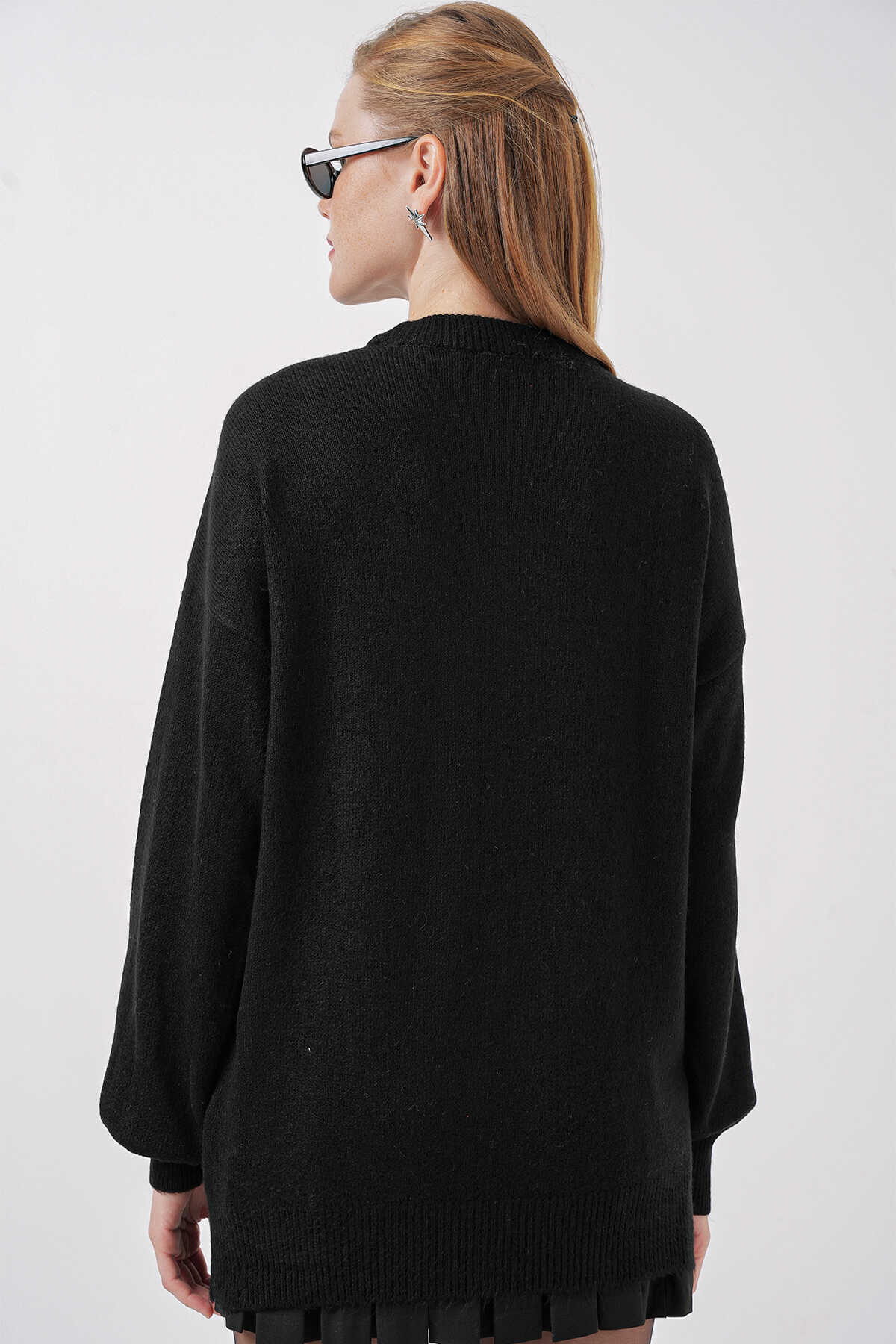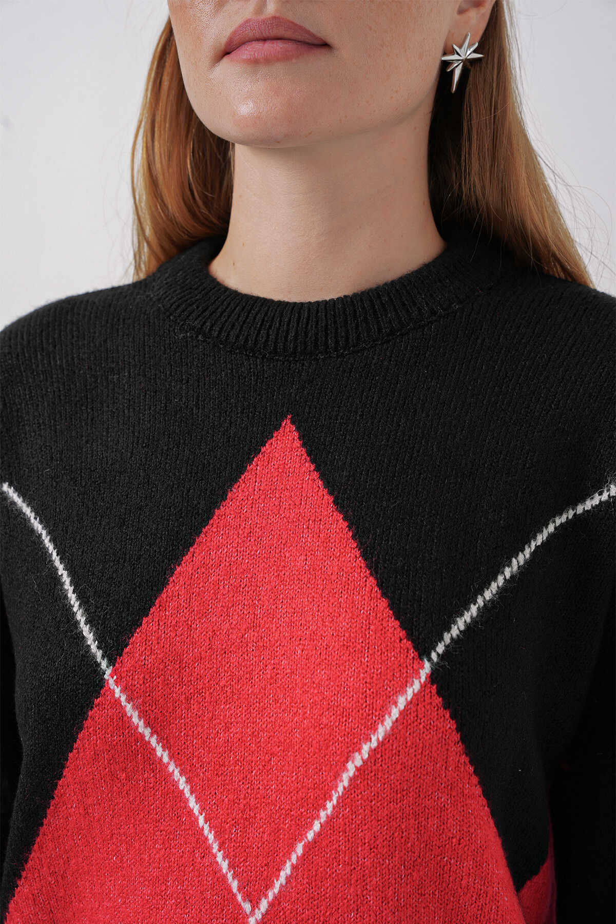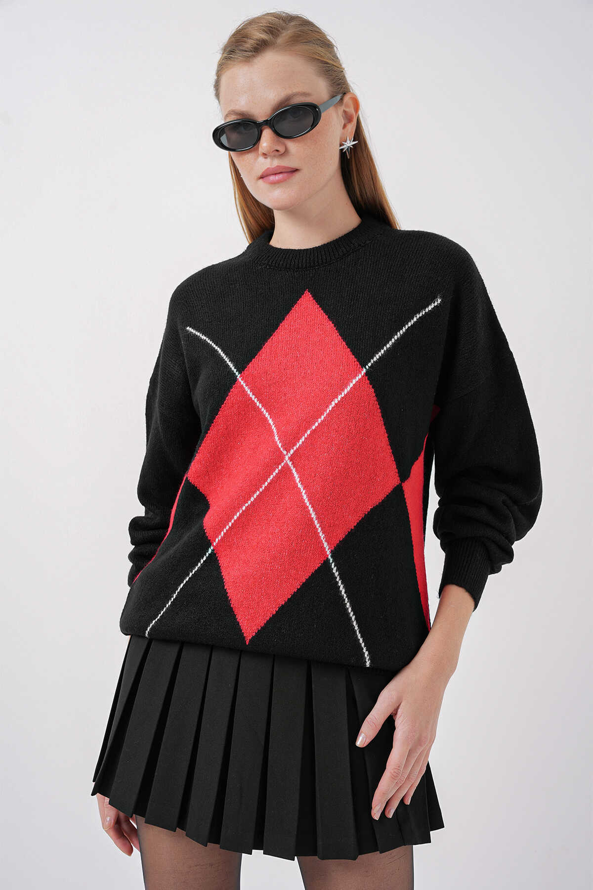 15895 Baklava Desenli Oversize Triko Kazak - Siyah