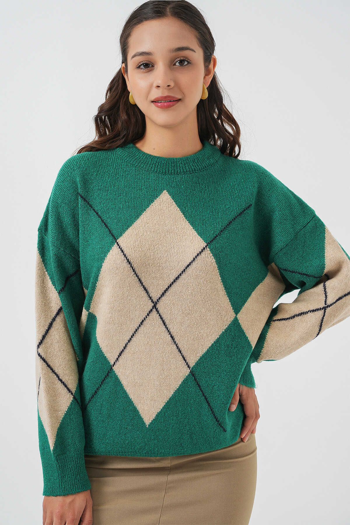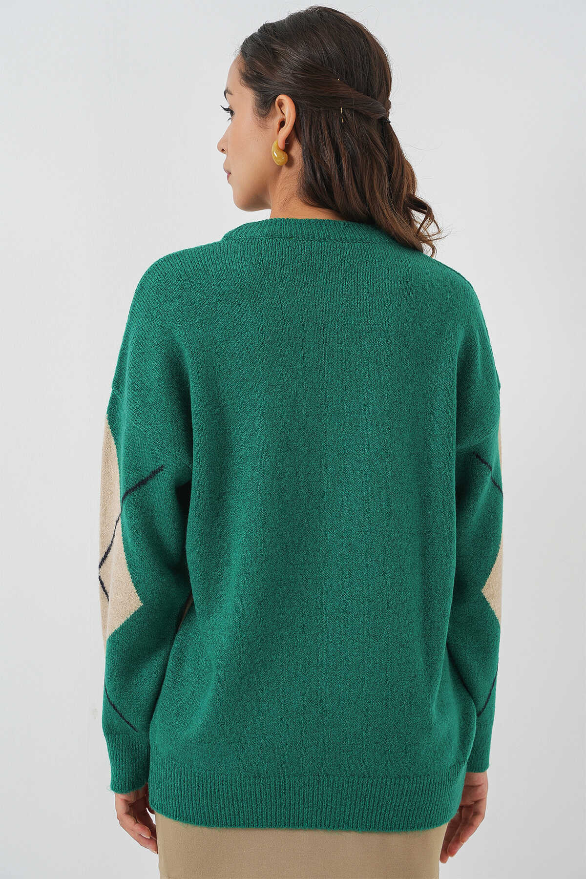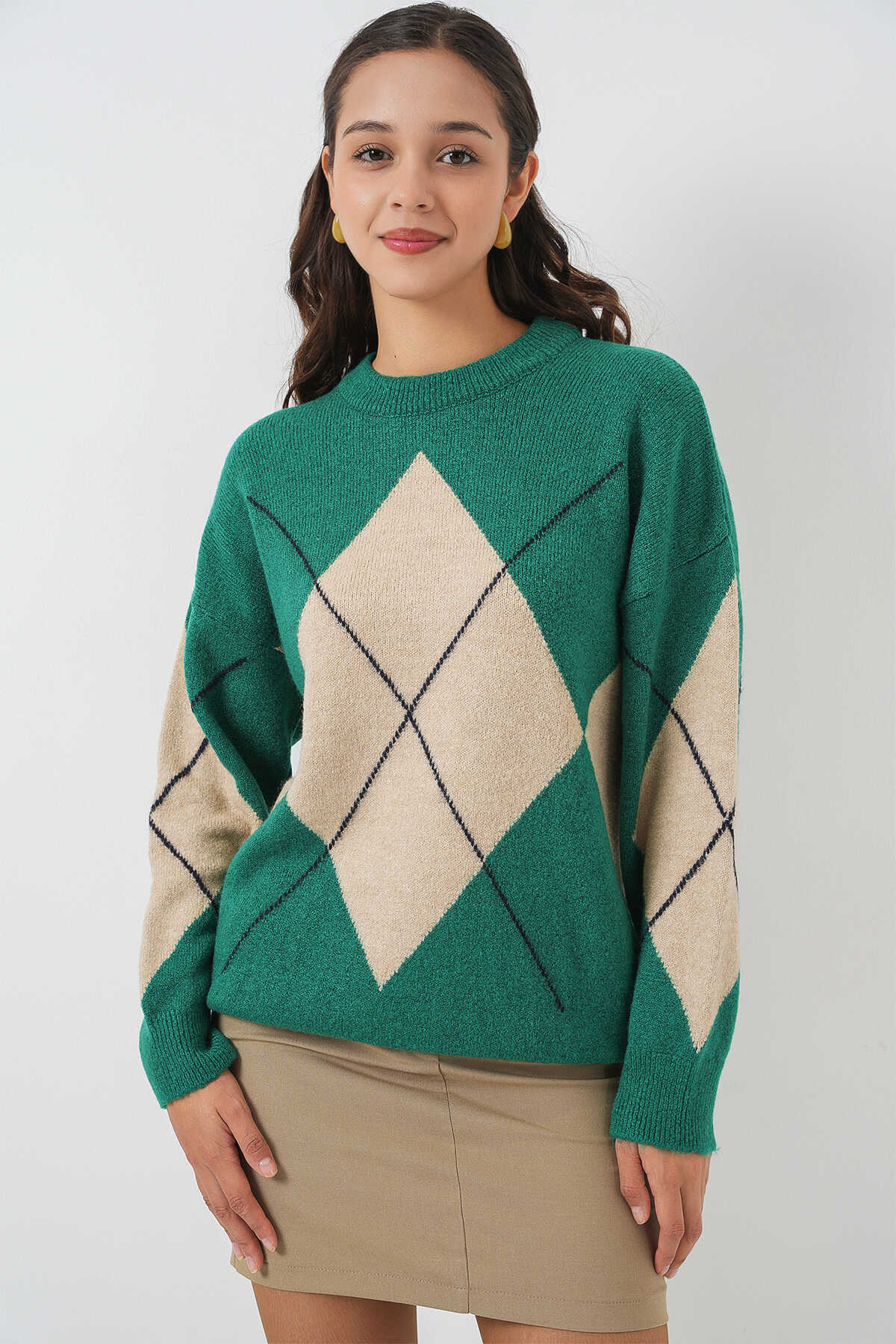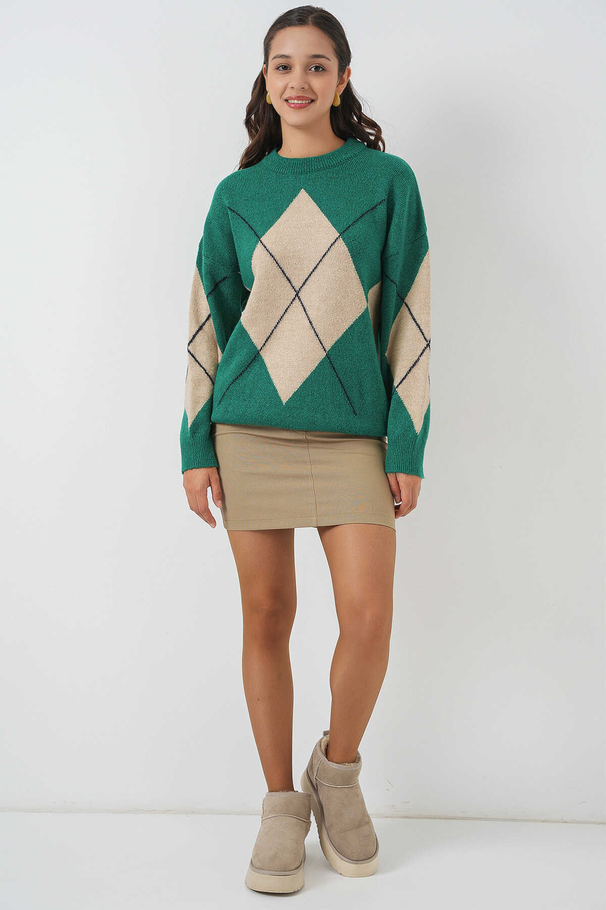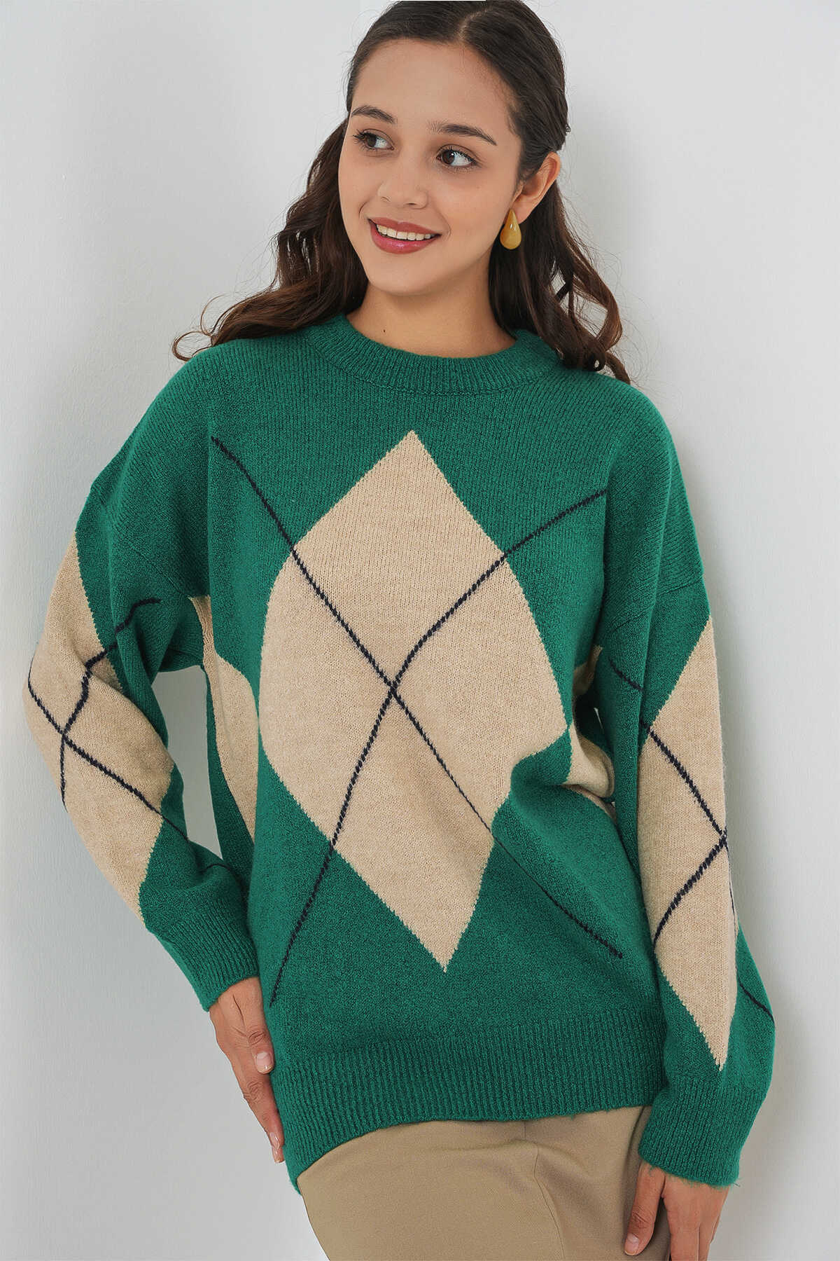 15895 Baklava Desenli Oversize Triko Kazak - Y.Zümrüt