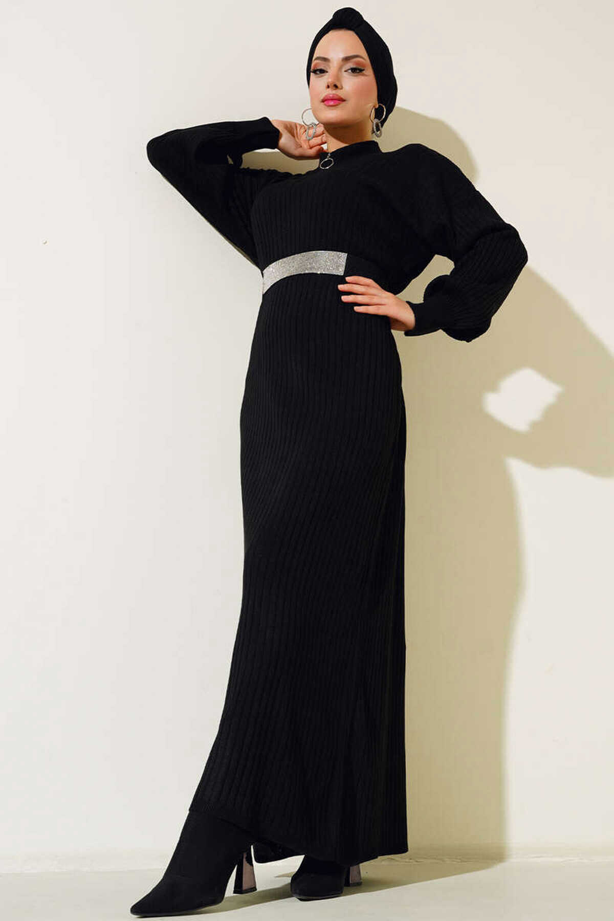 15900 Boydan Tesettür Triko Elbise - Siyah - Kombin