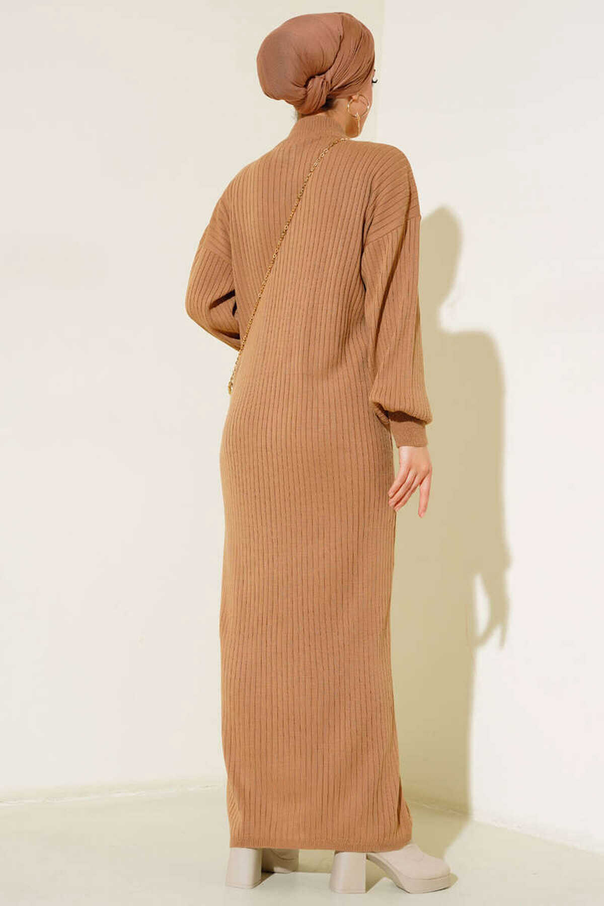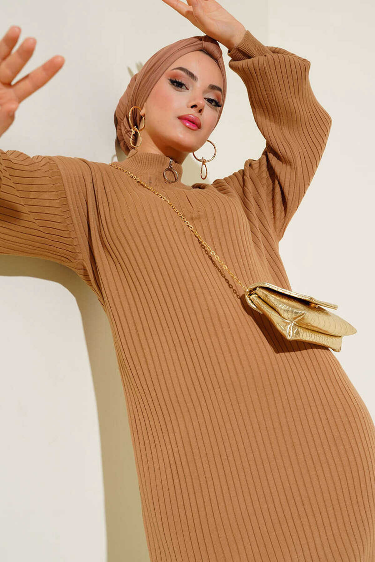 15900 Boydan Tesettür Triko Elbise - Taba - Kombin