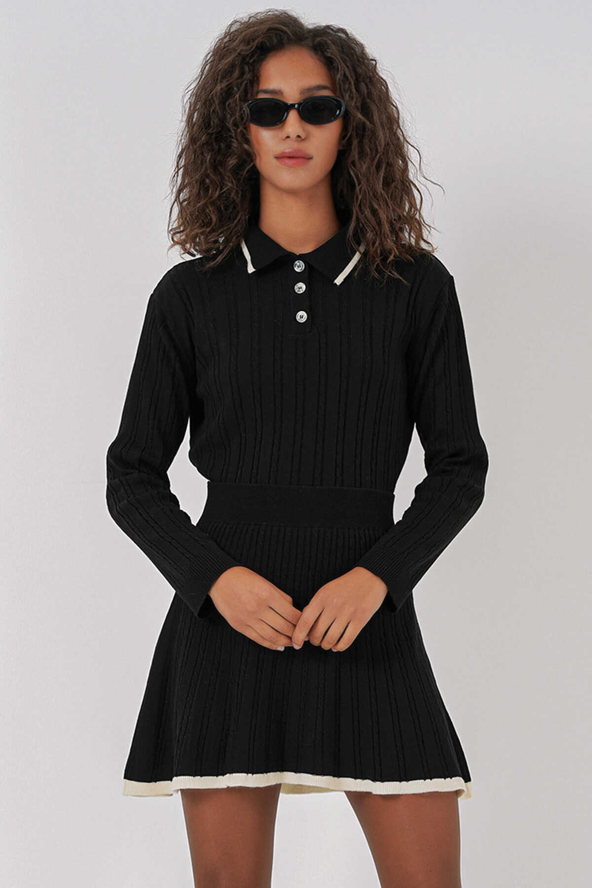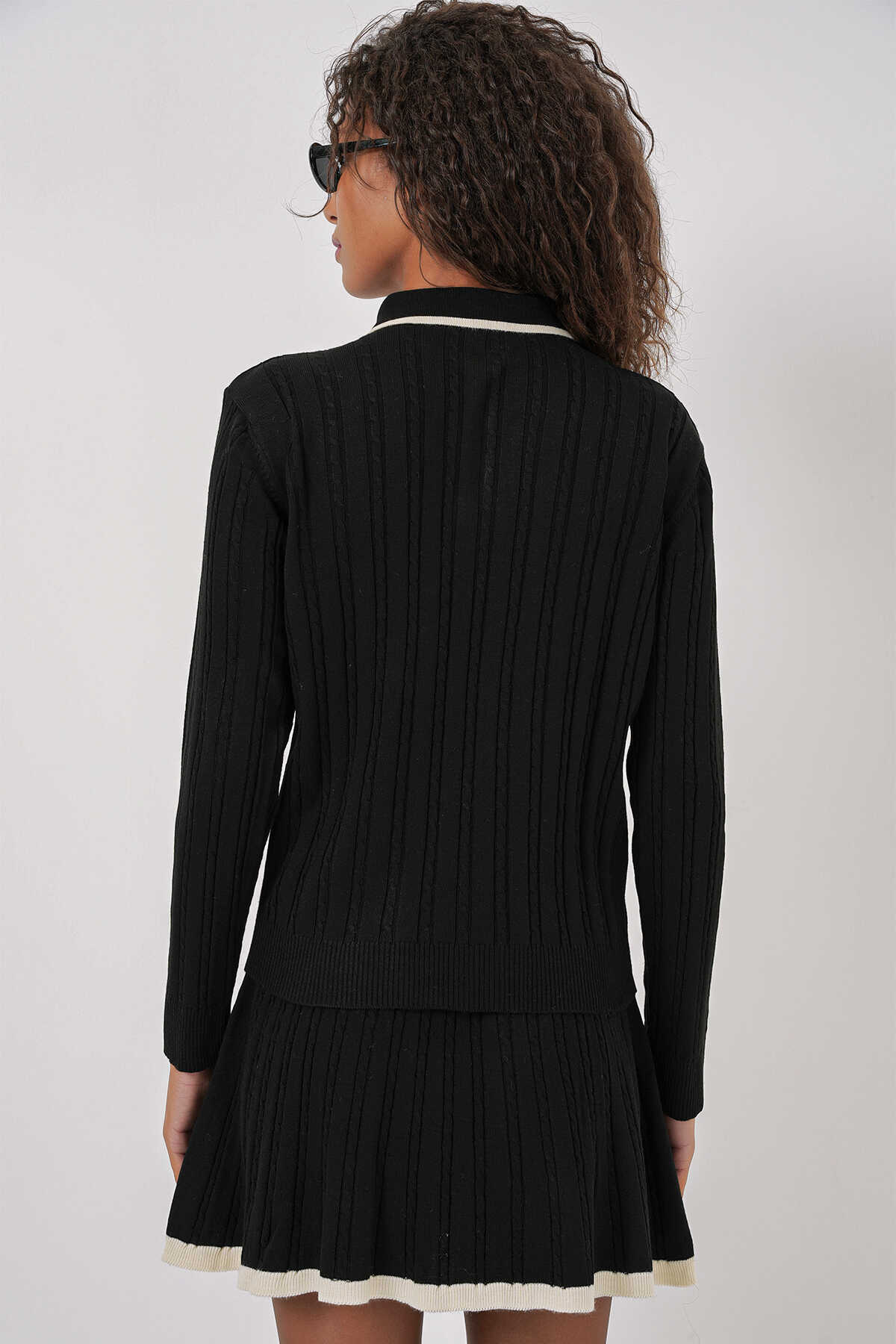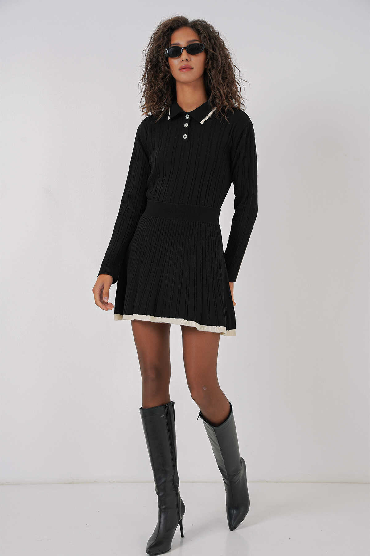 15907 Kadın Polo Yaka Kazak Etek Triko İkili Takım - Siyah - Kombin