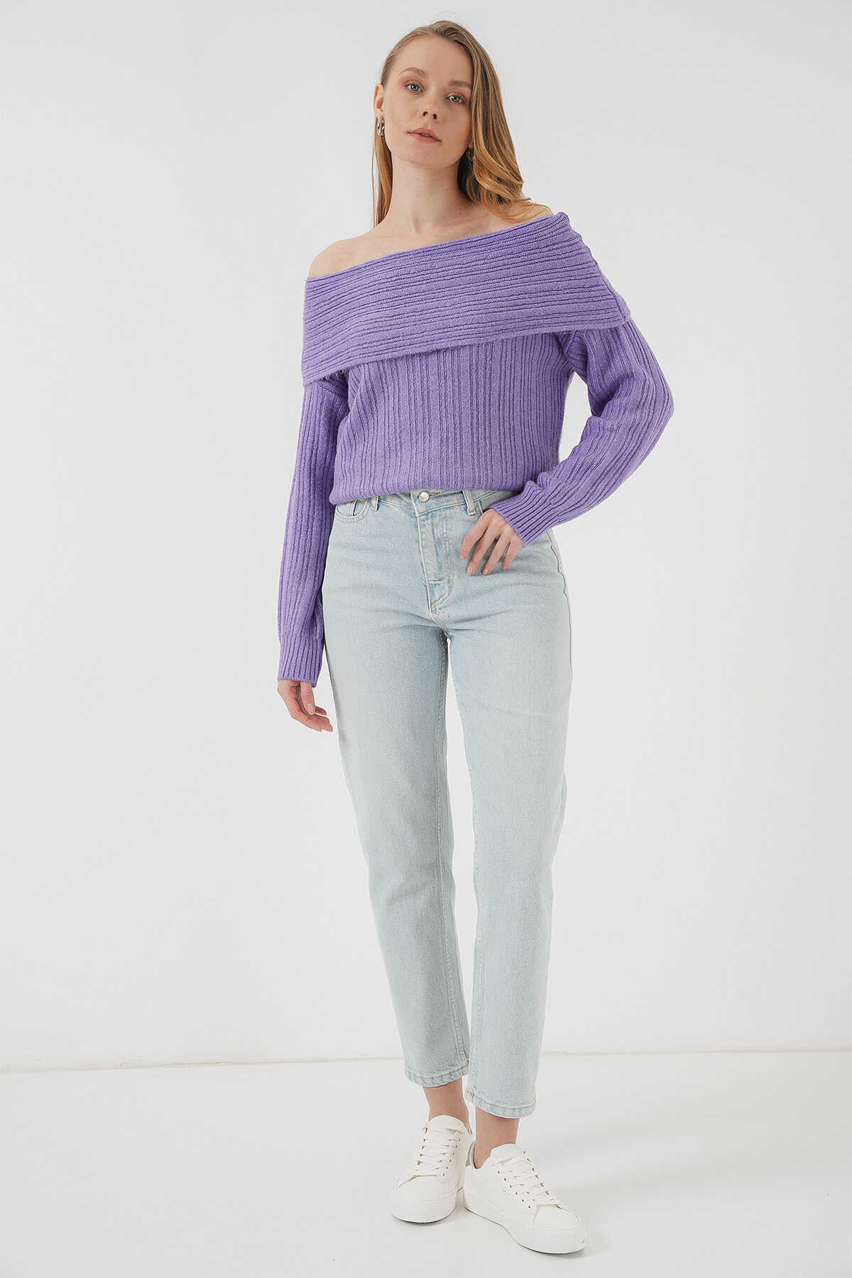 15908 Kadın Açık Omuz Oversize Triko Kazak - Lila - Kombin
