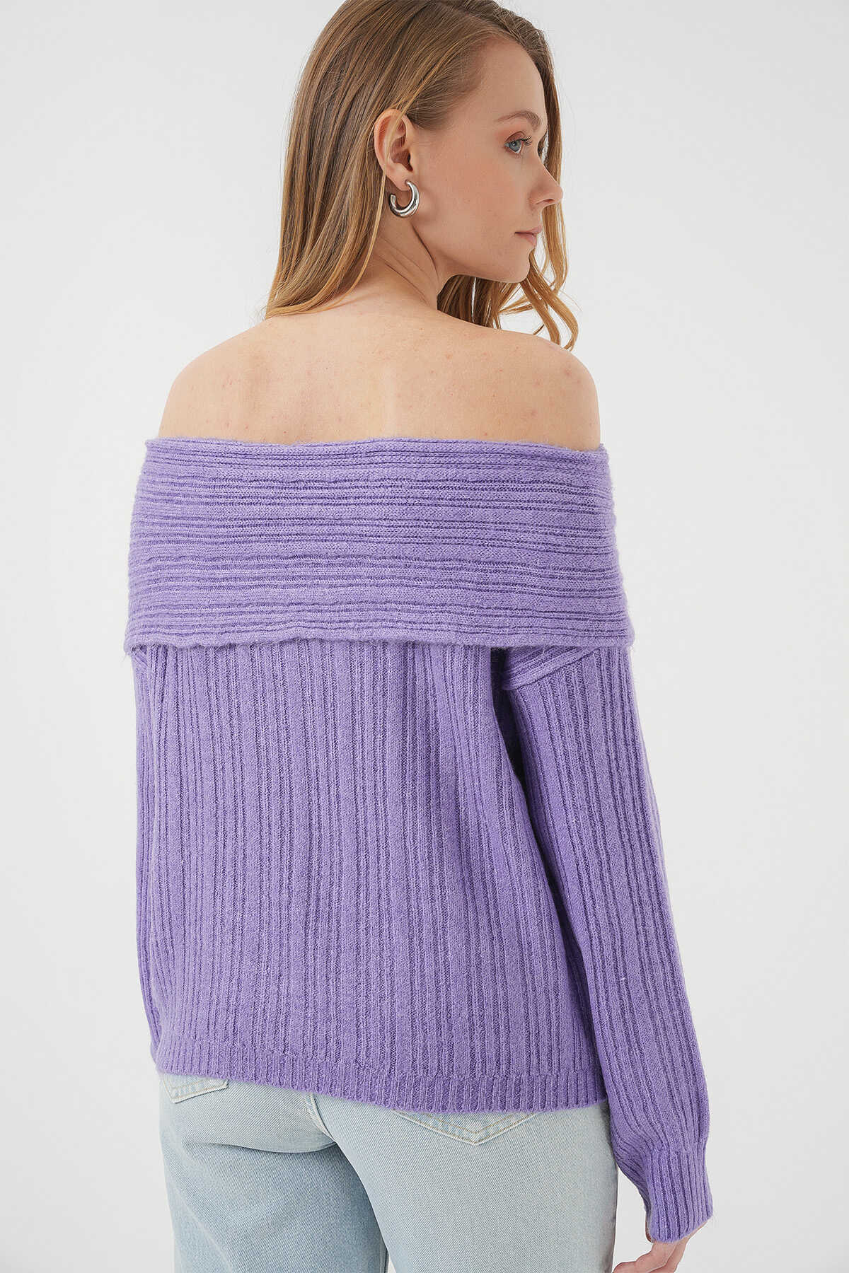 15908 Kadın Açık Omuz Oversize Triko Kazak - Lila