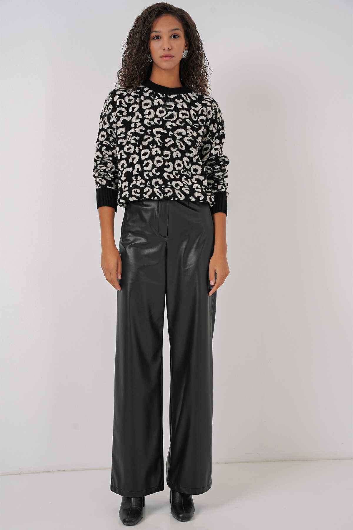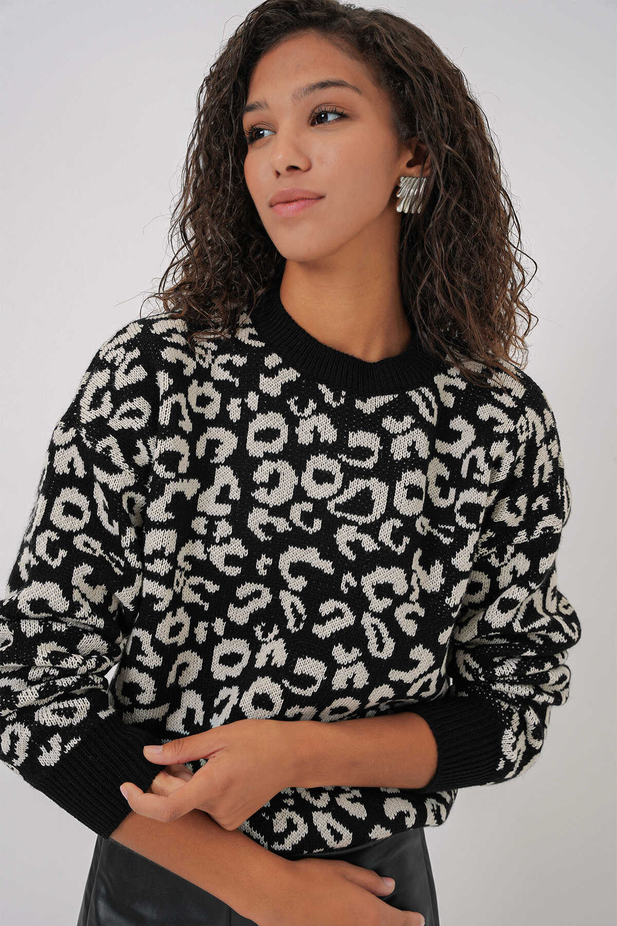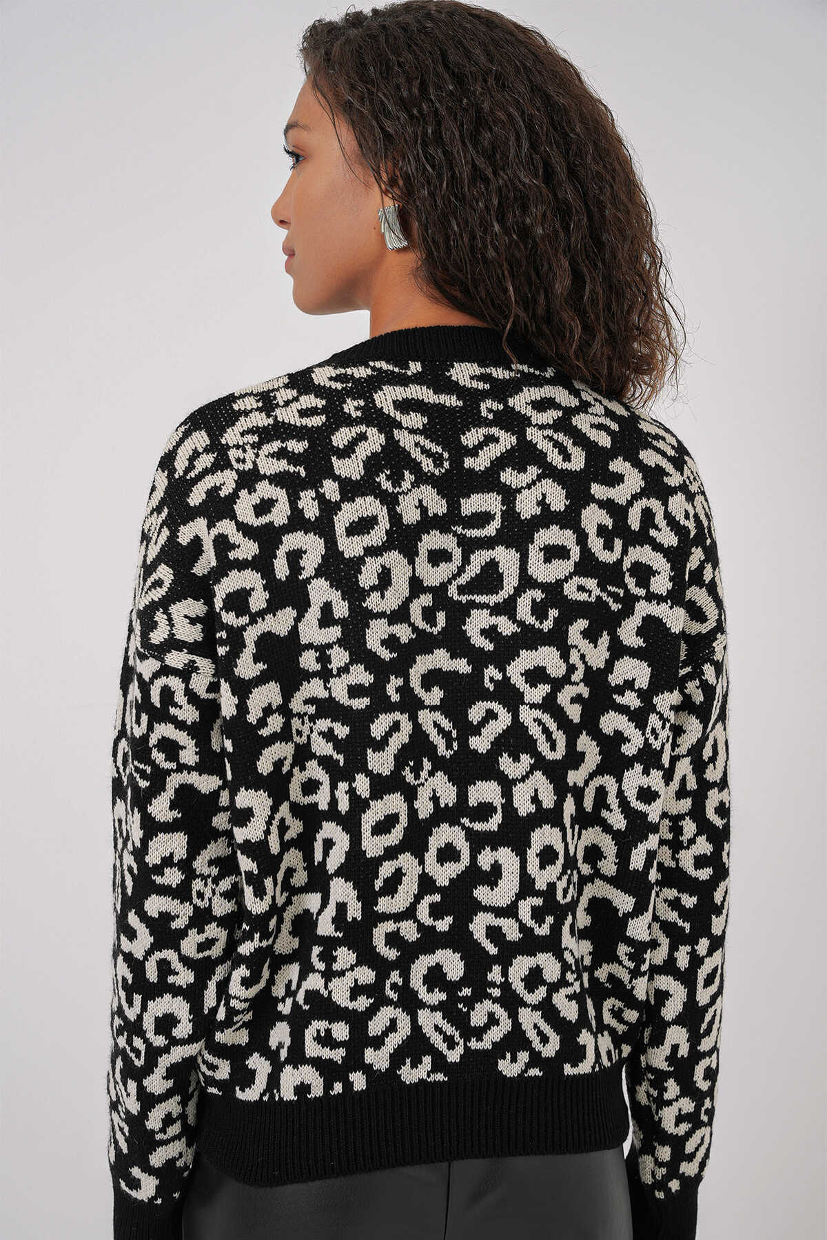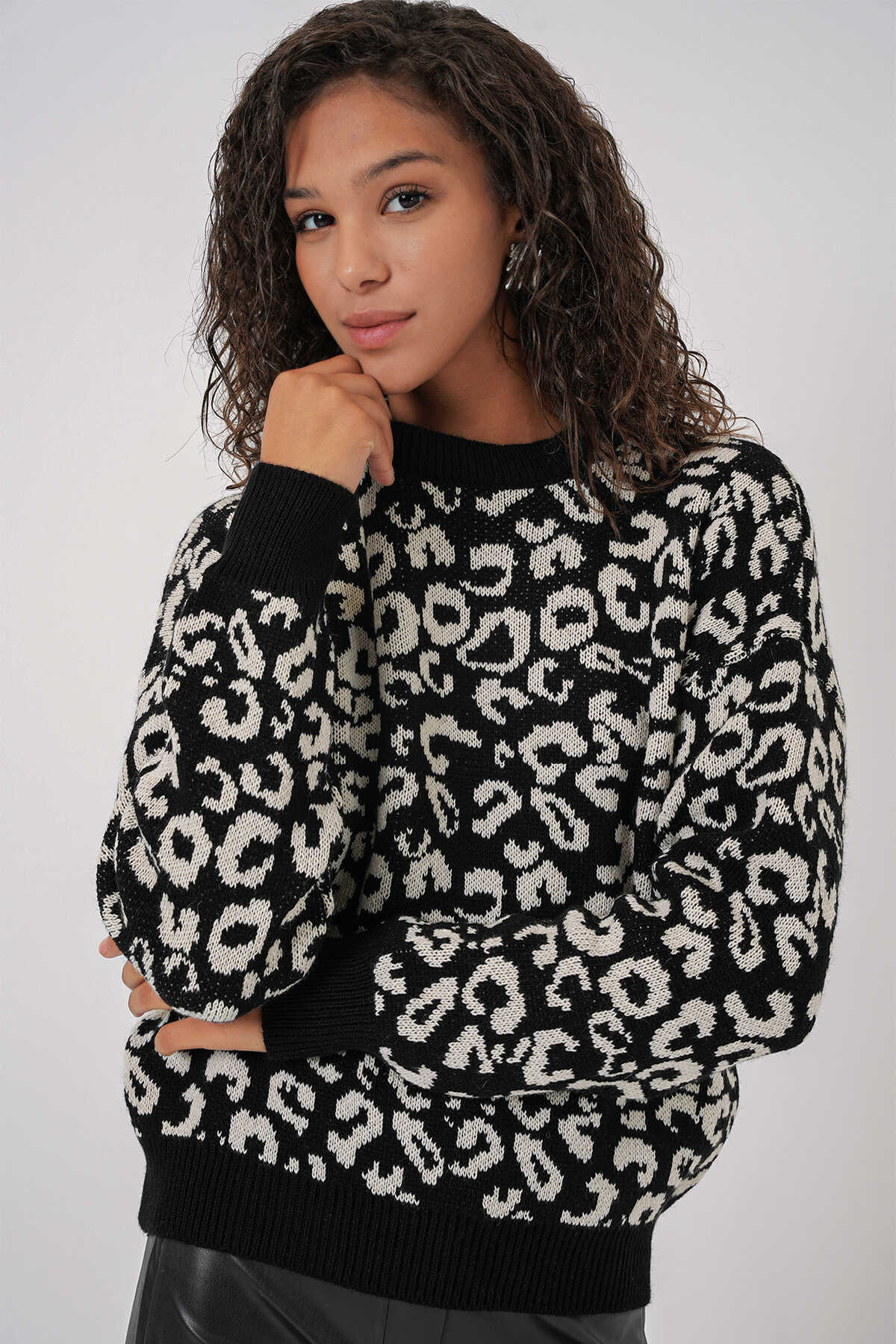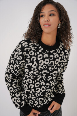 15909 Kadın Desenli Oversize Triko Kazak - Siyah - Beyaz 1 - Kombin