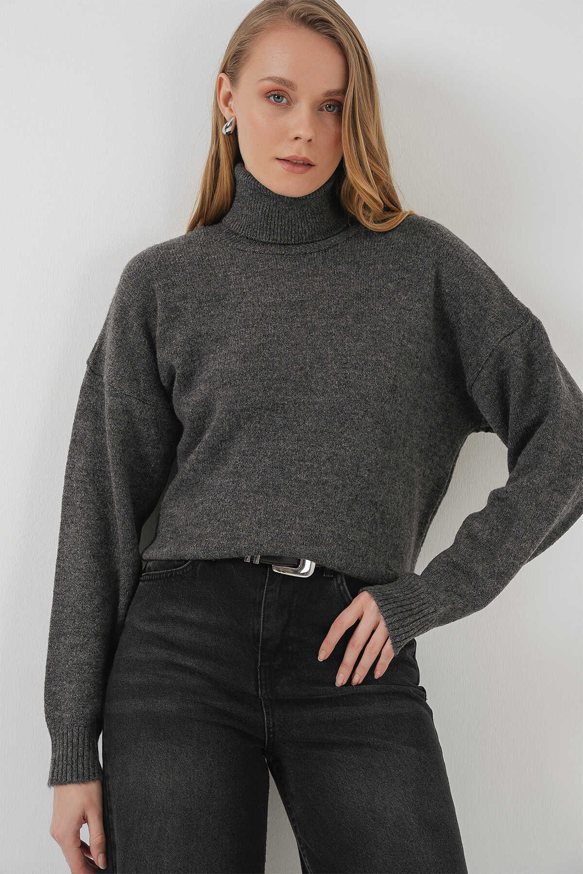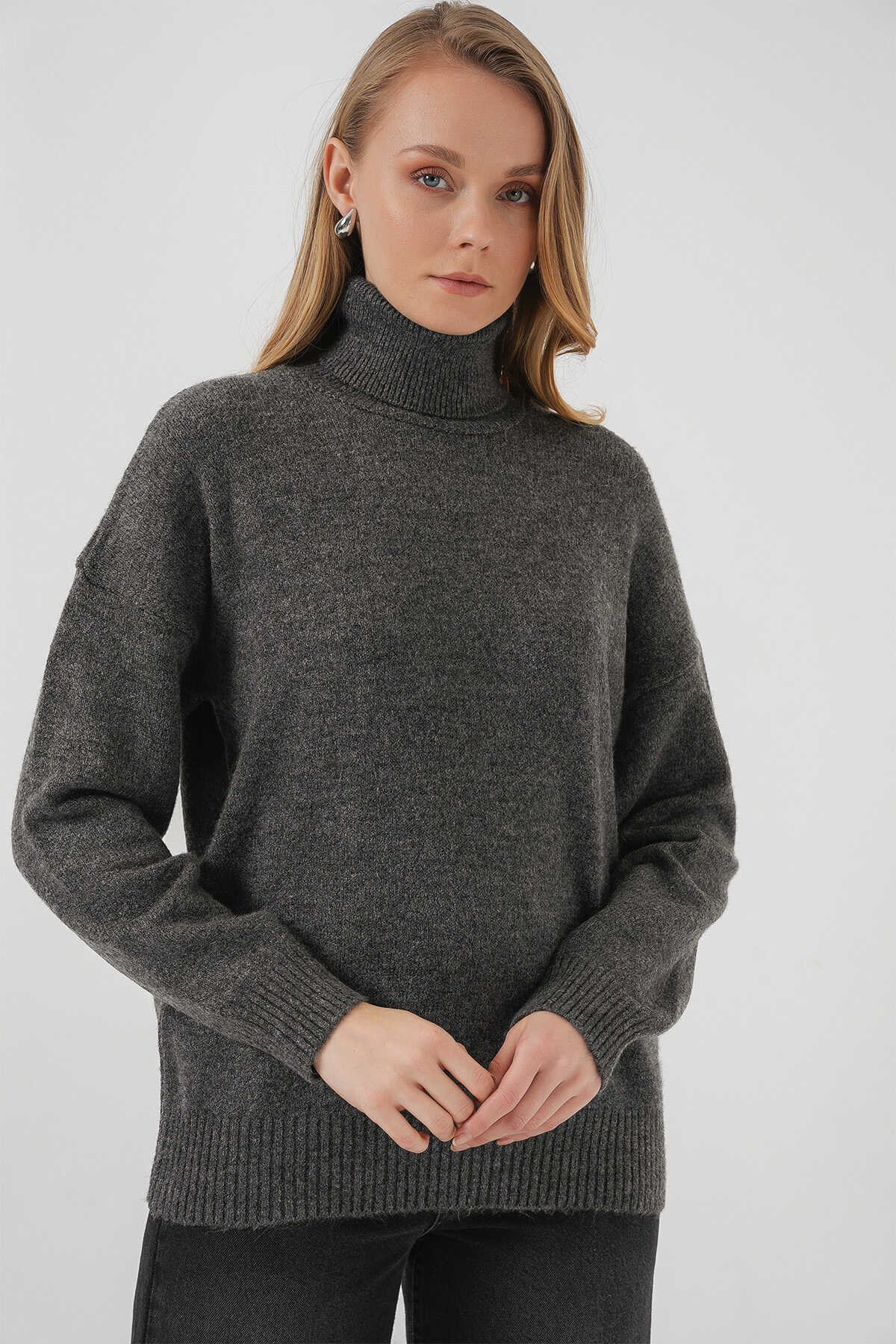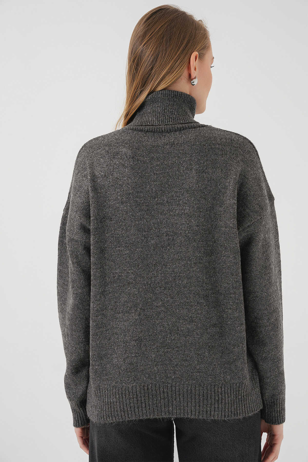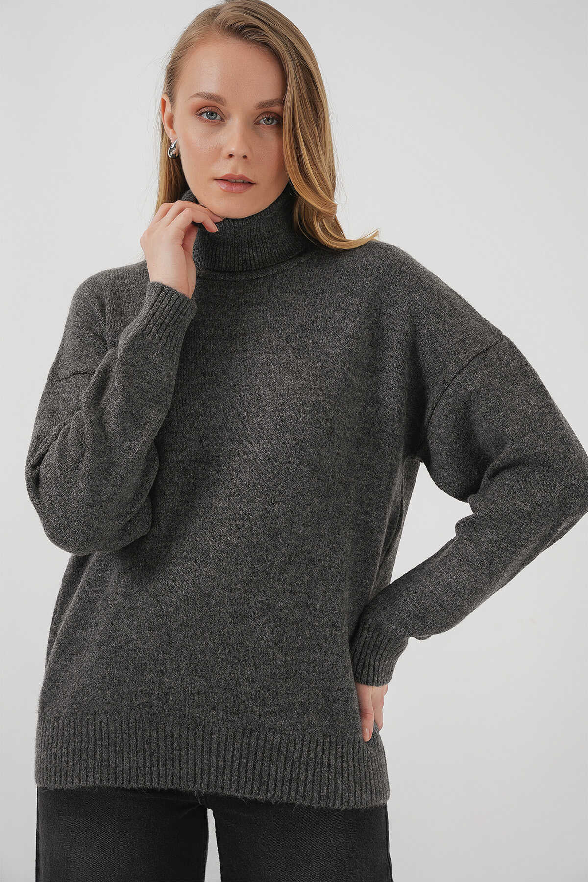 15917 Kadın Balıkçı Yaka Oversize Triko Kazak - Antrasit