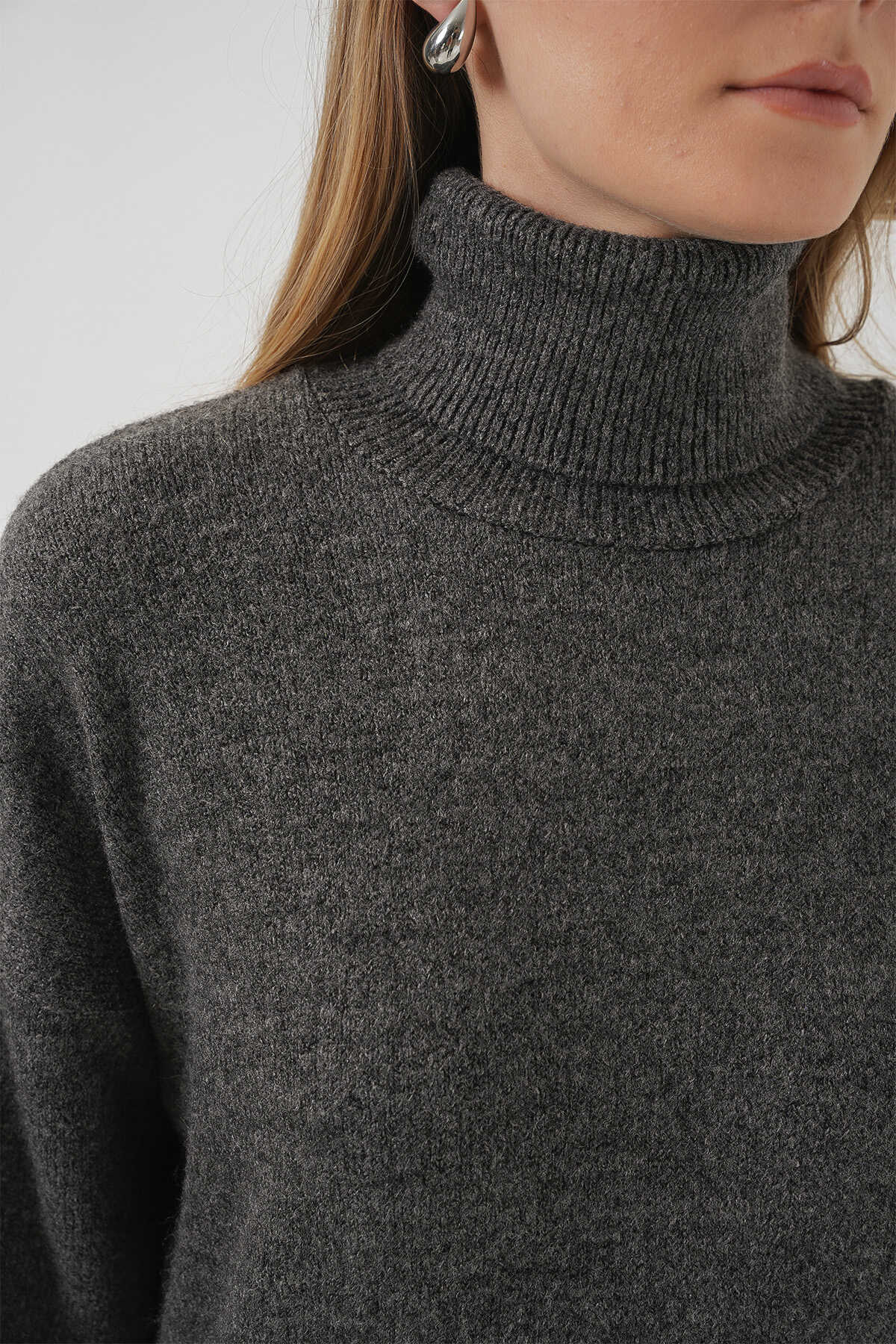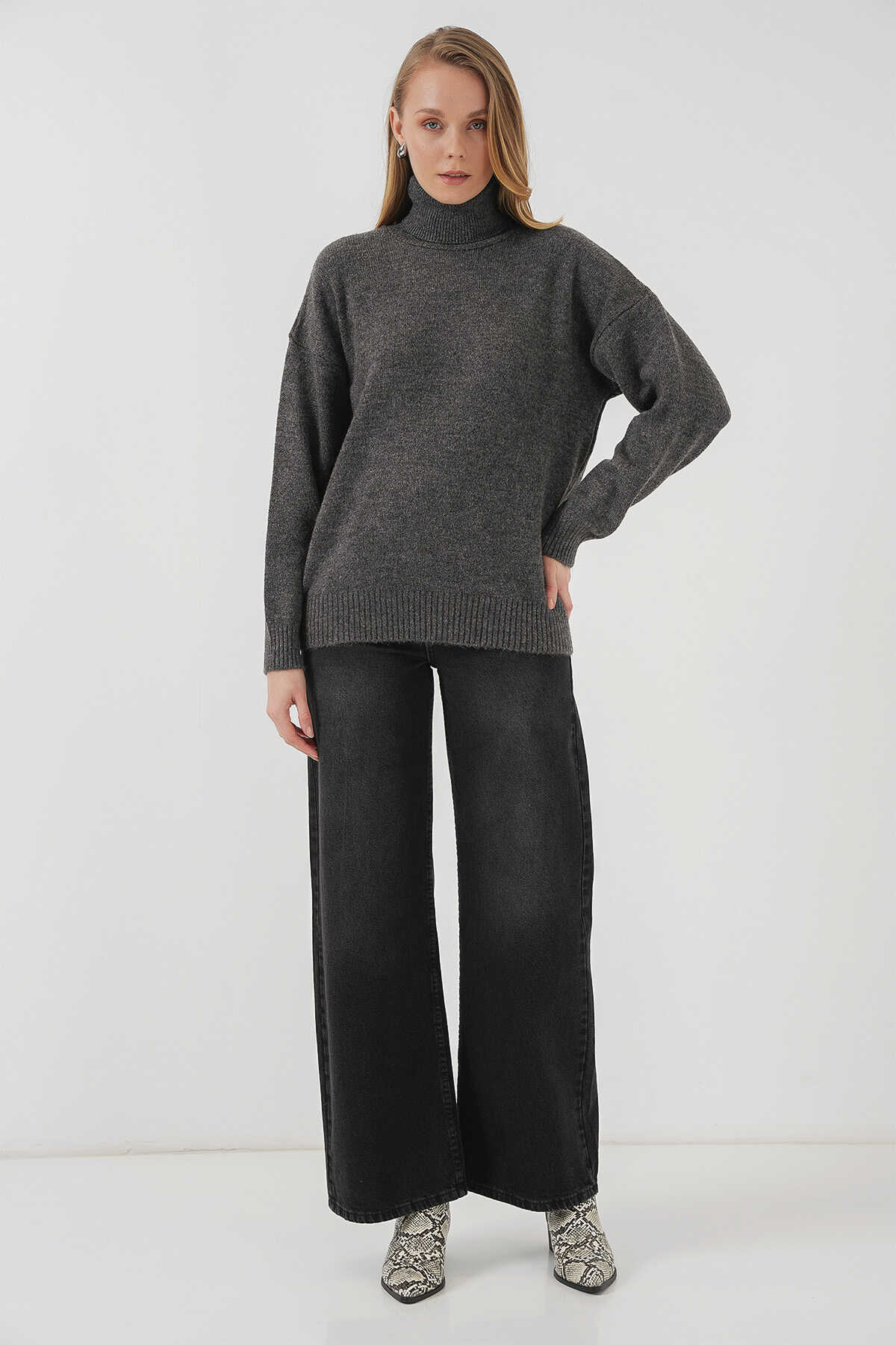 15917 Kadın Balıkçı Yaka Oversize Triko Kazak - Antrasit - Kombin